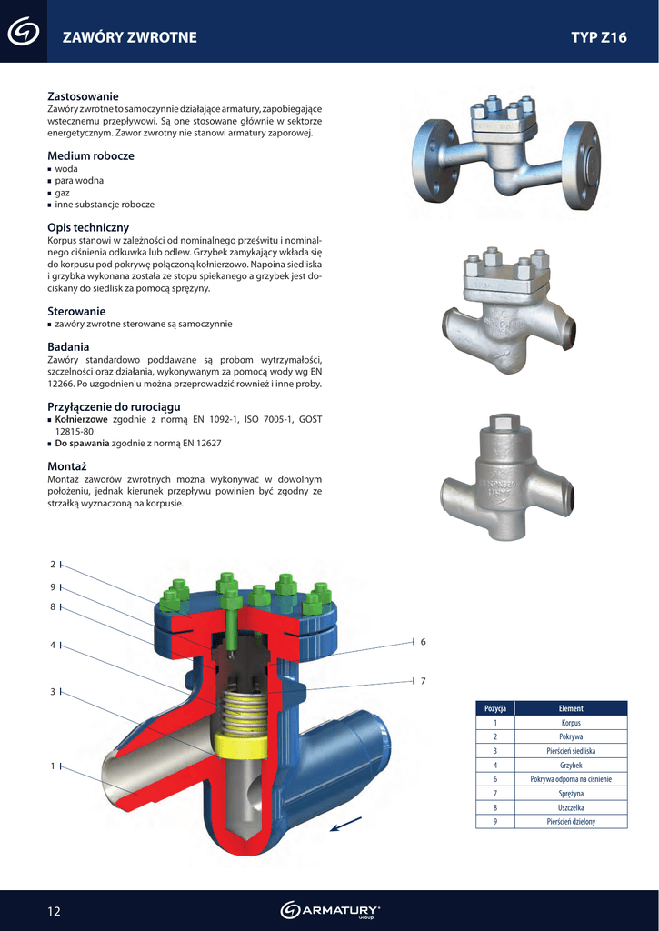 ZAWÓRY ZWROTNE TYP Z16 Zastosowanie Zawóry zwrotne to samoczynnie działające armatury, zapobiegające wstecznemu przepływowi. Są one stosowane głównie w sektorze energetycznym. Zawor zwrotny nie stanowi armatury zaporowej. Medium robocze woda para wodna gaz inne substancje robocze Opis techniczny Korpus stanowi w zależności od nominalnego prześwitu i nominalnego ciśnienia odkuwka lub odlew. Grzybek zamykający wkłada się do korpusu pod pokrywę połączoną kołnierzowo. Napoina siedliska i grzybka wykonana została ze stopu spiekanego a grzybek jest dociskany do siedlisk za pomocą sprężyny. Sterowanie zawóry zwrotne sterowane są samoczynnie Badania Zawóry standardowo poddawane są probom wytrzymałości, szczelności oraz działania, wykonywanym za pomocą wody wg EN 12266. Po uzgodnieniu można przeprowadzić rownież i inne proby. Przyłączenie do rurociągu K ołnierzowe zgodnie z normą EN 1092-1, ISO 7005-1, GOST 12815-80 Do spawania zgodnie z normą EN 12627 Montaż Montaż zaworów zwrotnych można wykonywać w dowolnym położeniu, jednak kierunek przepływu powinien być zgodny ze strzałką wyznaczoną na korpusie. 2 9 8 6 4 7 3 Pozycja 1 12 w w w. ar m atur ygroup. cz Element 1 Korpus 2 Pokrywa 3 Pierścień siedliska 4 Grzybek 6 Pokrywa odporna na ciśnienie 7 Sprężyna 8 Uszczelka 9 Pierścień dzielony ZAWÓR ZWROTNY ZE SPRĘŻYNĄ TYP Z16 PN 16-40 • DN 15-300 • Tmax 560 °C (450 °C) Przyłączenie: N 1092-1, ISO 7005-1, GOST 12815-80 KOŁNIERZOWE E EN 12627 DO SPAWANIA DN 15-50 DN 65-300 h wykonanie spawane ° H 60 H 30° d1 dp Dz Dw d Dw d Dz h d Do Dz Dp d 30° Do d H h D2 Dz Dp D1 D3 ° 60 do x n do × n do × n g f f f L g g L L „SW“ wykonanie do wspawania „G“ wykonanie gwintowe Tmax 200 °C PTFE, NBR PTFE, NBR SGX15CrNiMn188 SGX15CrNiMn188 Materiał - węglowe i stal stopowe Tmax 450 °C Element Tmax 530 °C Tmax 560 °C Tmax 450 °C Tmax 530 °C DN 15-40 Korpus, pokrywa P250GH (1.0460) Tmax 560 °C DN 50-300 16Mo3 (1.5415) 13CrMo4-5 (1.7335) GP240GH (1.0619) G20Mo5 (1.5419) Siedlisko 13Cr lub Stelit Grzybek X30Cr13 (1.4028), X17CrNi16-2 (1.4057), P250GH (1.0460), 13CrMo4-5 (1.7335) Powierzchnia uszczelniająca grzybka G17CrMo5-5 (1.7357) 13Cr lub Stelit lub PTFE, NBR Sprężyna 51CrV4 (1.8159) Uszczelnienie dławika, uszczelka Grafit PN 16-40 DN 15 20 25 32 40 50 PN 16 D1 95 105 115 140 150 165 D3 45 58 68 78 88 102 D2 65 75 85 100 110 125 do 14 14 14 18 18 18 xn x4 x4 x4 x4 x4 x4 D1 95 105 115 140 150 165 Wykonanie kołnierzowe PN 40 D3 D2 do x n 45 65 14 x 4 58 75 14 x 4 68 85 14 x 4 78 100 18 x 4 88 110 18 x 4 102 125 18 x 4 Wykonanie spawane L g f H h kg *d1 *dp kg 130 150 160 180 200 230 16 18 18 18 18 20 2 2 2 2 3 3 65 65 65 85 95 110 10 10 10 15 17 21 2,5 2,9 3,3 6,8 9,0 10,5 22 28 35 44 50 62 17 22 28,5 37 43 54 1,10 1,4 1,7 3,6 4,7 6,1 65 185 122 145 18 x 4 185 122 145 18 x 8 290 22 3 155 22 17,5 77 69 12,7 80 100 125 150 200 250 300 200 220 250 285 340 405 460 138 158 184 212 268 320 370 160 180 210 240 295 355 410 18 x 8 18 x 8 18 x 8 22 x 8 22 x 12 26 x 12 26 x 12 200 235 270 300 375 450 515 138 162 188 218 285 306 410 160 190 220 250 320 385 450 18 x 8 22 x 8 26 x 8 26 x 8 30 x 12 33 x 12 33 x16 310 350 400 480 600 730 850 24 24 26 28 34 38 42 3 3 3 3 3 3 3 170 195 200 225 270 290 410 26 32 40 44 60 70 130 27,0 41,0 54,0 90,0 150,0 195,0 360,0 91 117 144 172 223 278 329 81 104 130,5 156,5 204,5 256,5 306,5 18,5 36,0 49,0 76,0 140,0 165,0 280,0 *Wymiary do spawania mogą się różnić w zależności od specyfikacji klienta w zamówieniu. www.armaturygroup.cz w w w. ar m atur ygroup. cz 13