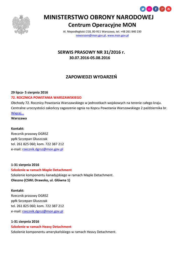 MINISTERSTWO OBRONY NARODOWEJ Centrum Operacyjne MON Al. Niepodległości 218, 00-911 Warszawa, tel. +48 261 840 230 [email protected], www.mon.gov.pl SERWIS PRASOWY NR 31/2016 r. 30.07.2016-05.08.2016 ZAPOWIEDZI WYDARZEŃ 29 lipca- 5 sierpnia 2016 72. ROCZNICA POWSTANIA WARSZAWSKIEGO Obchody 72. Rocznicy Powstania Warszawskiego w jednostkach wojskowych na terenie całego kraju. Centralne uroczystości zakończy zagaszenie ognia na Kopcu Powstania Warszawskiego 2 października br. Więcej... Warszawa Kontakt: Rzecznik prasowy DGRSZ ppłk Szczepan Głuszczak tel. 261 825 060; kom. 722 387 212 e-mail: [email protected] 1-31 sierpnia 2016 Szkolenie w ramach Maple Detachment Szkolenie komponentu kanadyjskiego w ramach Maple Detachment. Oleszno (CSWL Drawsko, ul. Główna 1) Kontakt: Rzecznik prasowy DGRSZ ppłk Szczepan Głuszczak tel. 261 825 060; kom. 722 387 212 e-mail: [email protected] 1-31 sierpnia 2016 Szkolenie w ramach Heavy Detachment Szkolenie komponentu amerykańskiego w ramach Heavy Detachment. Dobre nad Kwisą (OSPWL Żagań) Kontakt: Rzecznik prasowy DGRSZ ppłk Szczepan Głuszczak tel. 261 825 060; kom. 722 387 212 e-mail: [email protected] 1-31 sierpnia 2016 Szkolenie kompanii zmotoryzowanej Szkolenie kompanii zmotoryzowanej 7 batalionu Strzelców Konnych Wielkopolskiej 17 Wielkopolskiej Brygady Zmechanizowanej w ramach Assurance Measures. Litwa Kontakt: Rzecznik prasowy DGRSZ ppłk Szczepan Głuszczak tel. 261 825 060; kom. 722 387 212 e-mail: [email protected] 4-5 sierpnia 2016 (czwartek-piątek) Święto brygady pancernej Obchody święta 10 Brygady Kawalerii Pancernej. Świętoszów Kontakt: Oficer prasowy 10 BKPanc kpt. Adriana Wołyńska tel. 261 685 033 e-mail: [email protected] 4-8 sierpnia 2016 (czwartek-poniedziałek) Bieg Górski Reprezentacja Wojska Polskiego weźmie udział w 6. Biegu Górskim „Challenge Cup”. Kopaonik, Serbia Kontakt: Rzecznik prasowy DGRSZ ppłk Szczepan Głuszczak tel. 261 825 060; kom. 722 387 212 e-mail: [email protected] 4-15 sierpnia 2016 Pielgrzymka żołnierzy na Jasną Górę 25. Piesza Pielgrzymka Żołnierzy na Jasną Górę rozpocznie się mszą święta w Katedrze Polowej WP, a zakończy w Bazylice Jasnogórskiej. Warszawa, Częstochowa Kontakt: Rzecznik prasowy DGRSZ ppłk Szczepan Głuszczak tel. 261 825 060; kom. 722 387 212 e-mail: [email protected] 15 sierpnia 2016 (poniedziałek) ŚWIĘTO WOJSKA POLSKIEGO Uroczyste obchody Święta Wojska Polskiego w 96. Rocznicę „Cudu nad Wisłą”. Szczegóły dotyczące programu obchodów zostaną podane w odrębnym komunikacie. Warszawa Kontakt: Rzecznik prasowy DGRSZ ppłk Szczepan Głuszczak tel. 261 825 060; kom. 722 387 212 e-mail: [email protected] KRONIKA 22 lipca 2016 (piątek) Minister z wizytą w USA W dniach 20–22 lipca br. minister obrony narodowej Antoni Macierewicz przebywał z wizytą w Waszyngtonie, gdzie dyskutowano nt. podsumowania dotychczasowych i omówieniu przyszłych działań globalnej koalicji przeciwko tzw. państwu islamskiemu. Więcej... 24 lipca 2016 (niedziela) Wojsko rozpoczyna Światowe Dni Młodzieży Sekretarz stanu w MON Bartosz Kownacki, odpowiedzialny za przygotowanie Sił Zbrojnych do Światowych Dni Młodzieży, wziął udział w uroczystym rozpoczęciu Światowych Dni Młodzieży dla żołnierzy i młodzieży wojskowej w Warszawie w niedzielę, 24 lipca br. Więcej... 25 lipca 2016 (poniedziałek) Spotkanie z kombatantami Spotkanie, zorganizowane przez MON wspólnie z Urzędem ds. Kombatantów i Osób Represjonowanych z udziałem środowiska kombatantów, żołnierzy powstania warszawskiego odbyło się 25 lipca br. w Centrum Weterana Działań Poza Granicami Państwa. Więcej... 26 lipca 2016 (wtorek) Wojsko Polskie dla Światowych Dni Młodzieży Światowe Dni Młodzieży to wielkie spotkanie młodych z Ojcem Świętym, ale także potężne wyzwanie organizacyjne. Nic więc dziwnego, że w przygotowania, obok Kościoła i struktur administracyjnych zaangażowane są liczne instytucje i organizacje. Za zaangażowanie Sił Zbrojnych w organizację Światowych Dni Młodzieży odpowiada sekretarz stanu w Ministerstwie Obrony Narodowej minister Bartosz Kownacki. Więcej... 27 lipca 2016 (środa) Minister obrony na Światowych Dniach Młodzieży W dniach 27–31 lipca 2016 r. minister obrony narodowej Antoni Macierewicz uczestniczy w uroczystościach związanych z wizytą Ojca Świętego w Polsce oraz Światowymi Dniami Młodzieży. Więcej... 28 lipca 2016 (czwartek) Spotkanie z delegacją USA Spotkanie Ministra Antoniego Macierewicza z ambasadorem Paulem Jonesem i delegacją Departamentu Obrony USA. Więcej...