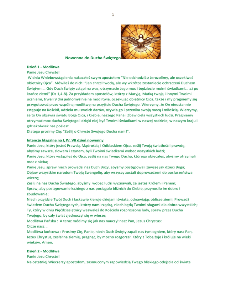 1 Nowenna do Ducha Świętego Dzień 1 - Modlitwa Panie Jezu Chryste! W dniu Wniebowstąpienia nakazałeś swym apostołom “Nie odchodzić z Jerozolimy, ale oczekiwać obietnicy Ojca”. Mówiłeś do nich: “Jan chrzcił wodą, ale wy wkrótce zostaniecie ochrzczeni Duchem Świętym ... Gdy Duch Święty zstąpi na was, otrzymacie Jego moc i będziecie moimi świadkami... aż po krańce ziemi” (Dz 1,4-8). Za przykładem apostołów, którzy z Maryją, Matką twoją i innymi Twoimi uczniami, trwali 9 dni jednomyślnie na modlitwie, oczekując obietnicy Ojca, także i my pragniemy się przygotować przez wspólną modlitwę na przyjście Ducha Świętego. Wierzymy, że On nieustannie zstępuje na Kościół, udziela mu swoich darów, ożywia go i przenika swoją mocą i miłością. Wierzymy, że to On objawia światu Boga Ojca, i Ciebie, naszego Pana i Zbawiciela wszystkich ludzi. Pragniemy otrzymać moc ducha Świętego i dzięki niej być Twoimi świadkami w naszej rodzinie, w naszym kraju i gdziekolwiek nas poślesz. Dlatego prosimy Cię: “Ześlij o Chryste Swojego Ducha nam!”. Intencje błagalne na I, IV, VII dzień nowenny Panie Jezu, który jesteś Prawdą, Mądrością i Odblaskiem Ojca, ześlij Twoją światłość i prawdę, abyśmy zawsze, słowem i czynem, byli Twoimi świadkami wobec wszystkich ludzi; Panie Jezu, który wstąpiłeś do Ojca, ześlij na nas Twego Ducha, którego obiecałeś, abyśmy otrzymali moc z nieba; Panie Jezu, spraw niech prowadzi nas Duch Boży, abyśmy postępowali zawsze jak dzieci Boga; Objaw wszystkim narodom Twoją Ewangelię, aby wszyscy zostali doprowadzeni do posłuszeństwa wierzę; Ześlij na nas Ducha Świętego, abyśmy wobec ludzi wyznawali, że jesteś Królem i Panem; Spraw, aby postępowanie każdego z nas pociągało bliźnich do Ciebie, przynosiło im dobro i zbudowanie; Niech przyjdzie Twój Duch i łaskawie kieruje dziejami świata, odnawiając oblicze ziemi; Prowadź światłem Ducha Świętego tych, którzy nami rządzą, niech będą Twoimi sługami dla dobra wszystkich; Ty, który w dniu Pięćdziesiątnicy wezwałeś do Kościoła rozproszone ludy, spraw przez Ducha Twojego, by cały świat zjednoczył się w wierze; Modlitwa Pańska : A teraz módlmy się jak nas nauczył nasz Pan, Jezus Chrystus: Ojcze nasz... Modlitwa końcowa : Prosimy Cię, Panie, niech Duch Święty zapali nas tym ogniem, który nasz Pan, Jezus Chrystus, zesłał na ziemię, pragnąc, by mocno rozgorzał. Który z Tobą żyje i króluje na wieki wieków. Amen. Dzień 2 - Modlitwa Panie Jezu Chryste! Na ostatniej Wieczerzy apostołom, zasmuconym zapowiedzią Twego bliskiego odejścia od świata 2 obiecałeś Pocieszyciela, Ducha Świętego. Powiedziałeś wtedy: „Ja będę prosił Ojca, a innego Pocieszyciela da wam, aby z wami był na zawsze - Ducha Prawdy, którego świat przyjąć nie może ponieważ go nie widzi ani nie zna. Ale wy Go znacie, ponieważ u was przebywa i w was będzie” (J14,16-17). Twoja obietnica się spełniła: Duch Święty w pięćdziesiątym dniu po Zmartwychwstaniu zstąpił na Kościół i zamieszkał w nim na zawsze. Napełnia Kościół i rządzi nim, zespala go i jednoczy, zstępując nieustannie przez sakramenty, uświęcając chleb i wino, aby się stały Ciałem i Krwią Twoją, i uświęcając tych, którzy je przyjmują. On utrzymuje Kościół w ciągłej młodości. Wierzymy, Panie, w Jego obecność wśród nas. Wierzymy, że Duch Święty, który mieszkał w Twoim świętym człowieczeństwie, mieszka i w nas i jednoczy z Tobą i Ojcem, czyni nas jednym ciałem. Niechaj Jego łaska nieustannie uświęca Twój Kościół i prowadzi do pełnej jedności z Ojcem. Dlatego wołamy: “Uświęć nas w Duchu Świętym, Panie!”. Intencje błagalne na II, V, VIII dzień nowenny Ześlij, Panie, Ducha Twego, którego miałeś posłać, aby Kościół Twój nieustannie odnawiał się i odmładzał; Wejrzyj, Panie na wszystkich, którzy noszą imię chrześcijan, aby Duch święty doprowadził ich do jedności; Jezu Chryste, wiekuisty Pasterzu, obdarz mądrością i rozwagą naszych Pasterzy, aby prowadzili Twe owce skutecznie do zbawienia; Spraw aby kierował nami nie duch świata, ale Duch święty, który od Ciebie pochodzi; Ześlij na Kościół Ducha jedności, aby ustąpiły niezgoda, nienawiść i podziały; Udziel nam mocy Ducha Świętego, aby nas oczyszczał i umacniał; Przygotuj Panie, dusze wiernych ożywiającą Twą łaską, aby z radością przyjmowali dary Ducha Świętego; Daj nam szczerą miłość, abyśmy się wzajemnie po bratersku miłowali; Modlitwa Pańska : A teraz módlmy się jak nas nauczył nasz Pan, Jezus Chrystus: Ojcze nasz... Modlitwa końcowa: Boże, który zesłałeś Ducha Świętego na swoich apostołów, spełnij ufne prośby Twojego Ludu, a skoro dałeś nam łaskę wiary, obdarz nas równie pokojem i jednością. Przez Chrystusa Pana naszego. Amen. Dzień 3 - Modlitwa Panie Jezu Chryste! Niegdyś w świątyni Jerozolimskiej wołałeś do ludu: „Jeśli ktoś jest spragniony, a wierzy we Mnie niech przyjdzie do Mnie i pije! Jak mówi Pismo: ”Strumienie wody żywej popłyną z Jego wnętrza” A powiedziałeś to o Duchu, którego mieli otrzymać wierzący w Ciebie. W każdym z nas, obmytym wodą chrztu, powtarza się ten cud, który zapowiedziałeś: tryska z głębi naszych dusz strumień życia nadprzyrodzonego, którego źródłem jest Duch Święty. To On oświeca nas światłem wiary, budzi nadzieję zmartwychwstania, rozlewa w sercach miłość. Z Jego hojności otrzymujemy siedem darów, których pełnia jest w Tobie. Z Jego łaski pochodzą cnoty i dobre uczynki, które Twój Apostoł nazywa owocami Ducha Świętego: „Owocem zaś Ducha jest: miłość, radość, pokój, cierpliwość, uprzejmość, dobroć, wierność, łagodność, opanowanie. To Duch Święty uczy nas modlitwy, „Gdy bowiem nie umiemy się modlić tak, jak trzeba, sam Duch przyczynia się za na