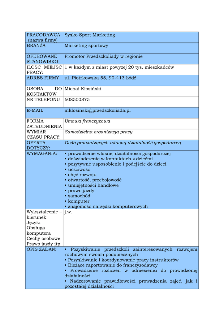 PRACODAWCA Sysko Sport Marketing (nazwa firmy) BRANśA Marketing sportowy OFEROWANE Promotor Przedszkoliady w regionie STANOWISKO ILOŚĆ MIEJSC 1 w kaŜdym z miast powyŜej 20 tys. mieszkańców PRACY: ADRES FIRMY ul. Piotrkowska 55, 90-413 Łódź OSOBA DO Michał Kłosiński KONTAKTÓW NR TELEFONU 608500875 E-MAIL [email protected] FORMA ZATRUDNIENIA WYMIAR CZASU PRACY: OFERTA DOTYCZY: WYMAGANIA: Umowa franczyzowa Samodzielna organizacja pracy Osób prowadzących własną działalność gospodarczą • prowadzenie własnej działalności gospodarczej • doświadczenie w kontaktach z dziećmi • pozytywne usposobienie i podejście do dzieci • uczciwość • chęć rozwoju • otwartość, przebojowość • umiejętności handlowe • prawo jazdy • samochód • komputer • znajomość narzędzi komputerowych Wykształcenie – j.w. kierunek Języki Obsługa komputera Cechy osobowe Prawo jazdy itp. OPIS ZADAŃ: • Pozyskiwanie przedszkoli zainteresowanych rozwojem ruchowym swoich podopiecznych • Pozyskiwanie i koordynowanie pracy instruktorów • BieŜące raportowanie do franczyzodawcy • Prowadzenie rozliczeń w odniesieniu do prowadzonej działalności • Nadzorowanie prawidłowości prowadzenia zajęć, jak i pozostałej działalności OFEROWANE WARUNKI: Wynagrodzenie Szkolenia Długość zatrudnienia itp. • Organizacja PRZEDSZKOLIADA EVENT • Realizacja akcji promocyjnych i marketingowych • Rozwój marki na swoim terenie Przychody z działalności Przedszkoliady w regionie prowadzonym przez promotora, umniejszone o 12% opłaty franczyzowej. PROMOTOR współpracuję z firmą Sysko na zasadzie umowy franczyzowej. Uzyskuję prawo do korzystania z marki, know-how, szkolenia i uczestnictwa w ogólnopolskim systemie rozrywki ruchowej dla dzieci w wieku przedszkolnym, dostęp do materiałów promocyjnych, prawo do organizacji cyklu zajęć z piłkami dla dzieci w wieku przedszkolnym. Promotor otrzymuje minutowy opis całorocznego cyklu zajęć 35 zajęć/rok. Ponadto uzyskuje promocje dzięki obecności na ogólnopolskiej platformie Przedszkoliady (www.przedszkoliada.pl) Od zaraz DATA ROZPOCZĘCIA PRACY APLIKACJA CV POWINNA ZAWIERAĆ: ADRES DO [email protected] SKŁADANIA APLIKACJI TERMIN Do 31.03.2011 SKŁADANIA APLIKACJI Dziękujemy i prosimy czekać na odpowiedź Informacja dodatkowa: Pola zaznaczone w tym kolorze są konieczne do poprawnego wprowadzenia Państwa danych. Prosimy o powiadomienie Biura Karier o zakończeniu i wynikach rekrutacji!