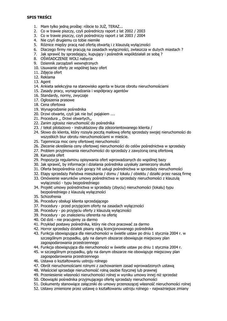SPIS TREŚCI 1. 2. 3. 4. 5. 6. 7. 8. 9. 10. 11. 12. 13. 14. 15. 16. 17. 18. 19. 20. 21. 22. 23. 24. 25. 26. 27. 28. 29. 30. 31. 32. 33. 34. 35. 36. 37. 38. 39. 40. 41. 42. 43. 44. 45. 46. 47. 48. 49. 50. 51. 52. Mam tylko jedną prośbę: róbcie to JUś, TERAZ... Co w trawie piszczy, czyli pośredniczy raport z lat 2002 / 2003 Co w trawie piszczy, czyli pośredniczy raport z lat 2003 / 2004 Nie czyń drugiemu co tobie niemiłe RóŜnice między pracą nad ofertą otwartą i z klauzulą wyłączności Dlaczego firmy nie pracują na zasadach wyłączności, zwłaszcza w duŜych miastach ? Jak sprawić by sprzedający, kupujący i pośrednik współdziałali ze sobą ? OŚWIADCZENIE WOLI nabycia Dziennik zarządzeń wewnętrznych Usuwanie oferty ze wspólnej bazy ofert Zdjęcia ofert Reklama Agent Ankieta selekcyjna na stanowisko agenta w biurze obrotu nieruchomościami Zasady pracy, wynagradzania i współpracy agentów Standardy, normy, zwyczaje Ogłoszenia prasowe Cena ofertowa Wynagrodzenie pośrednika Drzwi otwarte, czyli jak nie być pająkiem .... Procedura ,, Drzwi otwartych,, Zanim zgłosisz nieruchomość do pośrednika / tekst pilotaŜowo - instruktaŜowy dla zdezorientowanego klienta / Słowo do klienta, który rozsyła pocztą mailową ofertę sprzedaŜy swojej nieruchomości do wszystkich biur obrotu nieruchomościami w mieście. Tajemnicza moc ceny ofertowej nieruchomości Zlecenie określenia ceny ofertowej nieruchomości do celów pośrednictwa w sprzedaŜy Problem przyjmowania nieruchomości do sprzedaŜy z zawyŜoną ceną ofertową Karuzela ofert Propozycja regulaminu opisywania ofert wprowadzanych do wspólnej bazy Jak sprawić, by informacje i działania pośrednika uzyskały zamierzony skutek Oferta bezpośrednia czyli gorący hit usługi pośrednictwa w sprzedaŜy nieruchomości Etapy sprzedaŜy Państwa mieszkania / domu / lokalu / obiektu / działki przez naszą firmę Omówienie warunków umowy pośrednictwa w sprzedaŜy nieruchomości z klauzulą wyłączności - typu bezpośredniego Projekt umowy pośrednictwa w sprzedaŜy (zbyciu) nieruchomości (lokalu) typu bezpośredniego z klauzulą wyłączności Schizofrenia Procedury obsługi klienta sprzedającego Procedury - przed przyjęciem oferty na zasadach wyłączności Procedury - po przyjęciu oferty z klauzulą wyłączności Procedury - po znalezieniu oferenta na ofertę Od dziś - nie pracujemy za darmo Przykład postawy pośrednika, który nie chce pracować za darmo Horror sprzedaŜy działek pisany ręką licencjonowanego pośrednika Funkcja obowiązująca dla nieruchomości w świetle ustaw po dniu 1 stycznia 2004 r. w szczególnym przypadku, gdy na danym obszarze obowiązuje miejscowy plan zagospodarowania przestrzennego Funkcja obowiązująca dla nieruchomości w świetle ustaw po dniu 1 stycznia 2004 r. w szczególnym przypadku, gdy na danym obszarze nie obowiązuje miejscowy plan zagospodarowania przestrzennego Ustawa o kształtowaniu ustroju rolnego Obrót nieruchomościami rolnymi z zachowaniem zasad wprowadzonych ustawą Właściciel sprzedaje nieruchomość rolną osobie fizycznej lub prawnej Przeniesienie własności nieruchomości rolnej w wyniku umowy innej niŜ sprzedaŜ Obowiązki pośrednika przyjmującego ofertę sprzedaŜy nieruchomości Dokumenty stanowiące załączniki do umowy przenoszącej własność nieruchomości rolnej Ustawy zmienione przez ustawę o kształtowaniu ustroju rolnego - najwaŜniejsze zmiany 53. 54. 55. 1. 2. 56. 57. 58. 59. 60. 61. 62. 63. 64. 65. 66. 67. 68. 69. 70. 71. 72. 73. 74. 75. 76. 77. 78. 79. 80. 81. 82. 83. 84. 85. 86. Niechaj Wam ... klient przemówi do rozsądku RóŜnice w pracy nad produktem umowy z klauzulą wyłączności i typu otwartego. Procedury obsługi klienta poszukującego Procedury - przed znalezieniem oferty Procedury - po dokonaniu wyboru oferty Pośrednikiem być, ach być, czyli poradnik PFRN jak zostać pośrednikiem Pośrednictwo w obrocie nieruchomościami Licencje - komu i jak Polska Federacja Rynku Nieruchomości Stowarzyszenia Pośredników w Obrocie Nieruchomościami Państwowa Komisja Kwalifikacyjna Komisja Odpowiedzialności Zawodowej Ubezpieczenia Krok po kroku Praktyka zawodowa Podstawowe regulacje prawne dotyczące pośrednictwa w obrocie nieruchomościami: Przejście do Unii Europejskiej czyli Nieruchomości Grupa Alternatywna Współpraca - między nami pośrednikami Pośrednik do pośredników w sprawie wspólnego oferowania nieruchomości Polski pośrednik na rozdroŜu, czyli jak się dostać do sieci i jak ?pracować Integrujące spotkania firm - członków sieci wymiany ofert Przykład regulaminu współpracy między firmami obrotu nieruchomościami tworzącymi sieć wymiany ofert, Katalog zachowań NIEDOPUSZCZALNYCH dla członków sieci wymiany ofert Mędrca szkiełko i oko, czyli jak osiągnąć sukces Opowieść o człowieku, mieszkającym w Szczęśliwej Dolinie NGA Sp. z o. o Szkolenia z zakresu Studium Obsługi Klienta Biura Obrotu Nieruchomościami Wzory dokumentów: Ankieta selekcyjna dla agenta w biurze obrotu nieruchomościami Notatka ze spotkania Oświadczenie woli nabycia Oświadczenie o nie prowadzeniu działalności gospodarczej Oświadczenie przy zastosowaniu techniki ,Drzwi otwarte,, Rejestr transakcji Umowa pośrednictwa w sprzedaŜy typu bezpośredniego, z klauzulą wyłączności Zlecenie wyjazdowe w celu określenia ceny ofertowej nieruchomości Pozostałe wzory w ,,Instrukcji obsługi biura pośrednictwa w obrocie nieruchomościami,,