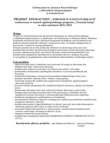 Gimnazjum im. Janusza Kusocińskiego z oddziałami integracyjnymi w Łobudzicach PROJEKT EDUKACYJNY „ ZDROWIE W NASZYCH RĘKACH” realizowany w ramach ogólnopolskiego programu „Trzymaj formę” w roku szkolnym 2012 / 2013 Wstęp: Projekt ten został skonstruowany dla potrzeb Gimnazjum im. Janusza Kusocińskiego z oddziałami integracyjnymi w Łobudzicach. Jest skorelowany ze Statutem Szkoły, Szkolnym Programem Wychowawczym, Szkolnym Programem Profilaktyki oraz przedmiotowymi planami realizacji materiału i planami wychowawców klas. W projekt zaangażowani są nauczyciele i uczniowie naszego gimnazjum. Powyższy projekt ma na celu zachęcanie młodzieży do aktywnego stylu życia oraz kształtowania nawyków prozdrowotnych poprzez poszerzanie wiedzy dotyczącej zdrowego żywienia, zbilansowanej diety, aktywności fizycznej, zachowań konsumenckich czyli kształtowania umiejętności niezbędnych do utrzymania zdrowia i kondycji fizycznej, ze szczególnym uwzględnieniem odpowiedzialności indywidualnej i świadomego wyboru. Cele projektu: - zaktywizowanie dzieci i młodzieży oraz zwrócenie ich uwagi na zdrowotna rolę zbilansowanej diety i aktywności fizycznej, - kształtowanie właściwych nawyków żywieniowych uczniów i ich rodzin - przekonanie o konieczności zapobiegania chorobom i wyższości profilaktyki nad leczeniem, - kształcenie przekonania o konieczności prowadzenia higienicznego trybu życia, - poznanie sposobów radzenia sobie z własną i cudzą agresją , - stwarzanie sytuacji dla rozładowania negatywnych emocji(złość, agresja) poprzez aktywność ruchową, - tworzenie klimatu dezaprobaty dla wszelkich przejawów przemocy, agresji oraz łamania prawa - promowanie zdrowego stylu życia, zdrowej żywności, aktywnego wypoczynku, - propagowanie systematycznej aktywności fizycznej poprzez wyrabianie nawyku regularnych ćwiczeń fizycznych w celu prawidłowego funkcjonowania organizmu, - kształcenie umiejętności współdziałania z rówieśnikami, - uświadomienie młodzieży zagrożeń wynikających z nadużywania telefonów komórkowych, komputera, Internetu i telewizji, - kształtowanie postawy odpowiedzialności za obecny i przyszły stan środowiska poprzez eliminację zagrożeń, jakie niesie ze sobą rozwój cywilizacji, - stwarzanie bezpiecznej atmosfery w szkole poprzez modelowanie konstruktywnych wzorców zachowania, chroniących zdrowie i życie, - integracja środowiska uczniowskiego, - kształtowanie umiejętności budowania OSOBISTEGO MODELU ZDROWEGO STYLU ŻYCIA. Koordynator główny projektu: mgr Małgorzata Dylewicz – nauczyciel biologii i chemii Harmonogram działań realizowanych w ramach projektu „Zdrowie w naszych rękach” Tematyka zajęć Cele szczegółowe I. Spotkanie organizacyjne. - opracowanie projektu - przygotowanie do jego realizacji II. - zwiększenie świadomości dotyczącej wpływu żywienia i aktywności fizycznej na zdrowie, - kształtowanie postaw i zachowań związanych z prawidłowym żywieniem i zbilansowaną dietą, - pogłębianie wiedzy w zakresie zasad racjonalnego żywienia z uwzględnieniem wartości kalorycznych spożywanych pokarmów, - dostarczanie wiedzy i umiejętności korzystania z informacji zamieszczonych na opakowaniach produktów spożywczych - propagowanie zasad Dzień Biologa w naszej szkole pod hasłem: „Zdrowym być, to zdrowo żyć” (zajęcia prowadzone według harmonogramu uwzględnionego w ramach pracy SK LOP) I Dzień Promocji Zdrowia i Sportu Termin realizacji IX. 2012 XI. 2012 Osoby odpowiedzialne - opiekunki SK LOP - koordynator programu „Trzymaj formę” - pedagog szkolny - lider zespołu profilaktycznego - nauczyciele wychowania fizycznego - opiekunki sklepiku szkolnego - opiekunki SK PCK - opiekun harcerzy - koordynator ds. bezpieczeństwa - SK LOP - nauczyciele biologii - pedagog szkolny - członkowie zespołu profilaktycznego - wychowawcy klas - nauczyciele wychowania fizycznego - opiekunki sklepiku szkolnego - opiekun harcerzy zdrowego stylu życia, zarówno w szkole, jak i rodzinie, - dostrzeganie znaczenia aktywności ruchowej dla zdrowego, higienicznego trybu życia, - kształcenie nawyku dbania o swoją sprawność fizyczną poprzez wypoczynek czynny i umiejętność jego planowania, - rozwijanie zainteresowań dyscyplinami sportowymi, zabawami, grami ruchowymi, rekreacją jako alternatywnymi formami spędzania wolnego czasu, - poznanie zasad prawidłowego odżywiania się i stosowanie ich w praktyce, - upowszechnianie wzorców i postaw prozdrowotnych, - wykształcenie umiejętności zapobiegania uzależnieniom i nałogom. - stworzenie „zdrowej alternatywy” spędzania wolnego czasu z dala III. Aktywne spędzanie wolnego od naładowanych czasu, obcowanie ze sztuką, przemocą i agresją kulturą i przyrodą jako programów alternatywa dla agresji, telewizyjnych i gier nudy i apatii. komputerowych, - rozwijanie talentów, umiejętności i uzdolnień uczniów jako forma walki z agresją i stresem, - nauczyciele gimnazjum cały rok - poznawanie sposobów radzenia sobie z własną i cudzą agresją i złością, - rozwijanie umiejętności mówienia o sobie, swoich potrzebach i uczuciach, - kształtowanie umiejętności samokontroli - poznanie metod unikania stresu, zapanowania nad nim, - rozwijanie umiejętności korzystania z wybranych technik relaksacyjnych, - kształtowanie pozytywnych relacji uczeń – uczeń, uczeńnauczyciel poprzez udział w wycieczkach i imprezach szkolnych. -poznanie szkodliwego wpływu telefonu komórkowego, IV. komputera i telewizji Zagrożenia wynikające z nadużywania telefonów na zdrowie człowieka, komórkowych, komputera - uświadomienie uczniom, że każde i Internetu oraz MP3. uzależnienie powoduje uszczerbek na zdrowiu fizycznym i wywołuje zmiany w psychice człowieka, - określenie wpływu hałasu na zdrowie człowieka, - wskazanie negatywnych skutków częstego używania MP3 do słuchania muzyki (utrata słuchu) V. Zdrowy s