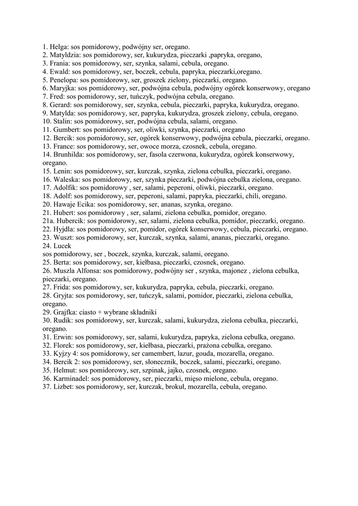 1. Helga: sos pomidorowy, podwójny ser, oregano. 2. Matyldzia: sos pomidorowy, ser, kukurydza, pieczarki ,papryka, oregano, 3. Frania: sos pomidorowy, ser, szynka, salami, cebula, oregano. 4. Ewald: sos pomidorowy, ser, boczek, cebula, papryka, pieczarki,oregano. 5. Penelopa: sos pomidorowy, ser, groszek zielony, pieczarki, oregano. 6. Maryjka: sos pomidorowy, ser, podwójna cebula, podwójny ogórek konserwowy, oregano 7. Fred: sos pomidorowy, ser, tuńczyk, podwójna cebula, oregano. 8. Gerard: sos pomidorowy, ser, szynka, cebula, pieczarki, papryka, kukurydza, oregano. 9. Matylda: sos pomidorowy, ser, papryka, kukurydza, groszek zielony, cebula, oregano. 10. Stalin: sos pomidorowy, ser, podwójna cebula, salami, oregano. 11. Gumbert: sos pomidorowy, ser, oliwki, szynka, pieczarki, oregano 12. Bercik: sos pomidorowy, ser, ogórek konserwowy, podwójna cebula, pieczarki, oregano. 13. France: sos pomidorowy, ser, owoce morza, czosnek, cebula, oregano. 14. Brunhilda: sos pomidorowy, ser, fasola czerwona, kukurydza, ogórek konserwowy, oregano. 15. Lenin: sos pomidorowy, ser, kurczak, szynka, zielona cebulka, pieczarki, oregano. 16. Waleska: sos pomidorowy, ser, szynka pieczarki, podwójna cebulka zielona, oregano. 17. Adolfik: sos pomidorowy , ser, salami, peperoni, oliwki, pieczarki, oregano. 18. Adolf: sos pomidorowy, ser, peperoni, salami, papryka, pieczarki, chili, oregano. 20. Hawaje Ecika: sos pomidorowy, ser, ananas, szynka, oregano. 21. Hubert: sos pomidorowy , ser, salami, zielona cebulka, pomidor, oregano. 21a. Hubercik: sos pomidorowy, ser, salami, zielona cebulka, pomidor, pieczarki, oregano. 22. Hyjdla: sos pomidorowy, ser, pomidor, ogórek konserwowy, cebula, pieczarki, oregano. 23. Wuszt: sos pomidorowy, ser, kurczak, szynka, salami, ananas, pieczarki, oregano. 24. Lucek sos pomidorowy, ser , boczek, szynka, kurczak, salami, oregano. 25. Berta: sos pomidorowy, ser, kiełbasa, pieczarki, czosnek, oregano. 26. Muszla Alfonsa: sos pomidorowy, podwójny ser , szynka, majonez , zielona cebulka, pieczarki, oregano. 27. Frida: sos pomidorowy, ser, kukurydza, papryka, cebula, pieczarki, oregano. 28. Gryjta: sos pomidorowy, ser, tuńczyk, salami, pomidor, pieczarki, zielona cebulka, oregano. 29. Grajfka: ciasto + wybrane składniki 30. Rudik: sos pomidorowy, ser, kurczak, salami, kukurydza, zielona cebulka, pieczarki, oregano. 31. Erwin: sos pomidorowy, ser, salami, kukurydza, papryka, zielona cebulka, oregano. 32. Florek: sos pomidorowy, ser, kiełbasa, pieczarki, prażona cebulka, oregano. 33. Kyjzy 4: sos pomidorowy, ser camembert, lazur, gouda, mozarella, oregano. 34. Bercik 2: sos pomidorowy, ser, słonecznik, boczek, salami, pieczarki, oregano. 35. Helmut: sos pomidorowy, ser, szpinak, jajko, czosnek, oregano. 36. Karminadel: sos pomidorowy, ser, pieczarki, mięso mielone, cebula, oregano. 37. Lizbet: sos pomidorowy, ser, kurczak, brokuł, mozarella, cebula, oregano.