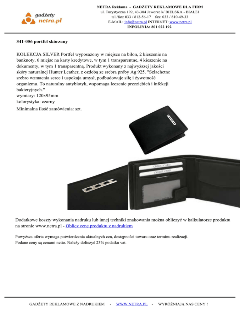 NETRA Reklama - GADŻETY REKLAMOWE DLA FIRM ul. Turystyczna 192, 43-384 Jaworze k/ BIELSKA - BIAŁEJ tel./fax: 033 / 812-56-17 fax: 033 / 810-49-33 E-MAIL: [email protected] INTERNET: www.netra.pl INFOLINIA: 801 022 192 341-056 portfel skórzany KOLEKCJA SILVER Portfel wyposażony w miejsce na bilon, 2 kieszenie na banknoty, 6 miejsc na karty kredytowe, w tym 1 transparentne, 4 kieszenie na dokumenty, w tym 1 transparentną. Produkt wykonany z najwyższej jakości skóry naturalnej Hunter Leather, z ozdobą ze srebra próby Ag 925. "Szlachetne srebro wzmacnia serce i uspokaja umysł, podbudowuje siłę i żywotność organizmu. To naturalny antybiotyk, wspomaga leczenie przeziębień i infekcji bakteryjnych." wymiary: 120x95mm kolorystyka: czarny Minimalna ilość zamówienia: szt. Dodatkowe koszty wykonania nadruku lub innej techniki znakowania można obliczyć w kalkulatorze produktu na stronie www.netra.pl - Oblicz cenę produktu z nadrukiem Powyższa oferta wymaga potwierdzenia aktualnych cen, dostępności towaru oraz terminu realizacji. Podane ceny są cenami netto. Należy doliczyć 23% podatku vat. GADŻETY REKLAMOWE Z NADRUKIEM - WWW.NETRA.PL - WYRÓŻNIAJĄ NAS CENY !