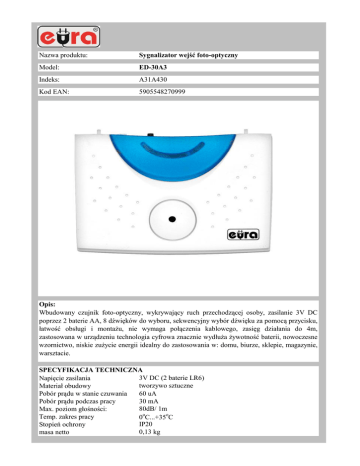 Nazwa produktu: Sygnalizator wejść foto-optyczny Model: ED-30A3 Indeks: A31A430 Kod EAN: 5905548270999 Opis: Wbudowany czujnik foto-optyczny, wykrywający ruch przechodzącej osoby, zasilanie 3V DC poprzez 2 baterie AA, 8 dźwięków do wyboru, sekwencyjny wybór dźwięku za pomocą przycisku, łatwość obsługi i montażu, nie wymaga połączenia kablowego, zasięg działania do 4m, zastosowana w urządzeniu technologia cyfrowa znacznie wydłuża żywotność baterii, nowoczesne wzornictwo, niskie zużycie energii idealny do zastosowania w: domu, biurze, sklepie, magazynie, warsztacie. SPECYFIKACJA TECHNICZNA 3V DC (2 baterie LR6) Napięcie zasilania tworzywo sztuczne Materiał obudowy Pobór prądu w stanie czuwania 60 uA Pobór prądu podczas pracy 30 mA 80dB/ 1m Max. poziom głośności: Temp. zakres pracy 0oC...+35oC IP20 Stopień ochrony 0,13 kg masa netto