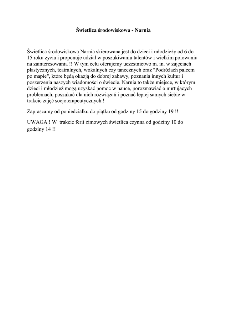 Świetlica środowiskowa - Narnia Świetlica środowiskowa Narnia skierowana jest do dzieci i młodzieży od 6 do 15 roku życia i proponuje udział w poszukiwaniu talentów i wielkim polowaniu na zainteresowania !! W tym celu oferujemy uczestnictwo m. in. w zajęciach plastycznych, teatralnych, wokalnych czy tanecznych oraz "Podróżach palcem po mapie", które będą okazją do dobrej zabawy, poznania innych kultur i poszerzenia naszych wiadomości o świecie. Narnia to także miejsce, w którym dzieci i młodzież mogą uzyskać pomoc w nauce, porozmawiać o nurtujących problemach, poszukać dla nich rozwiązań i poznać lepiej samych siebie w trakcie zajęć socjoterapeutycznych ! Zapraszamy od poniedziałku do piątku od godziny 15 do godziny 19 !! UWAGA ! W trakcie ferii zimowych świetlica czynna od godziny 10 do godziny 14 !!