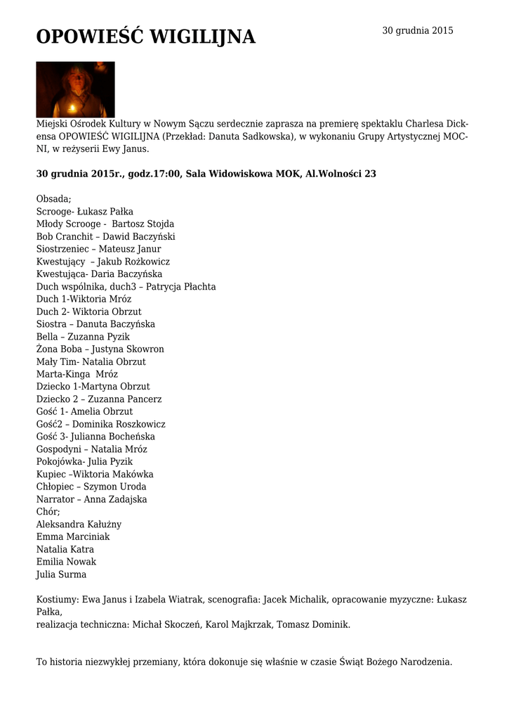 OPOWIEŚĆ WIGILIJNA 30 grudnia 2015 Miejski Ośrodek Kultury w Nowym Sączu serdecznie zaprasza na premierę spektaklu Charlesa Dickensa OPOWIEŚĆ WIGILIJNA (Przekład: Danuta Sadkowska), w wykonaniu Grupy Artystycznej MOCNI, w reżyserii Ewy Janus. 30 grudnia 2015r., godz.17:00, Sala Widowiskowa MOK, Al.Wolności 23 Obsada; Scrooge- Łukasz Pałka Młody Scrooge - Bartosz Stojda Bob Cranchit – Dawid Baczyński Siostrzeniec – Mateusz Janur Kwestujący – Jakub Rożkowicz Kwestująca- Daria Baczyńska Duch wspólnika, duch3 – Patrycja Płachta Duch 1-Wiktoria Mróz Duch 2- Wiktoria Obrzut Siostra – Danuta Baczyńska Bella – Zuzanna Pyzik Żona Boba – Justyna Skowron Mały Tim- Natalia Obrzut Marta-Kinga Mróz Dziecko 1-Martyna Obrzut Dziecko 2 – Zuzanna Pancerz Gość 1- Amelia Obrzut Gość2 – Dominika Roszkowicz Gość 3- Julianna Bocheńska Gospodyni – Natalia Mróz Pokojówka- Julia Pyzik Kupiec –Wiktoria Makówka Chłopiec – Szymon Uroda Narrator – Anna Zadajska Chór; Aleksandra Kałużny Emma Marciniak Natalia Katra Emilia Nowak Julia Surma Kostiumy: Ewa Janus i Izabela Wiatrak, scenografia: Jacek Michalik, opracowanie myzyczne: Łukasz Pałka, realizacja techniczna: Michał Skoczeń, Karol Majkrzak, Tomasz Dominik. To historia niezwykłej przemiany, która dokonuje się właśnie w czasie Świąt Bożego Narodzenia. Scrooge człowiek bardzo dziwny… zły opryskliwy obojętny na biedę innych liczący tylko pieniądze i zysk nie wierzący w magię świąt nagle… doświadcza obecności duchów przeszłości teraźniejszości przyszłości… to dla niego koszmar Co z tego wyniknie Czy Scrooge zmieni Siebie Swoje serce Swoje życie Przyjdź - przekonaj się- w święta wszystko może się stać jest to czas pełen magii miłości i nadziei To może być też Twoja historia… fot. Andrzej RAMS Aktualność powiązana z: Grupa Artystyczna MOCNI Galeria zdjęć