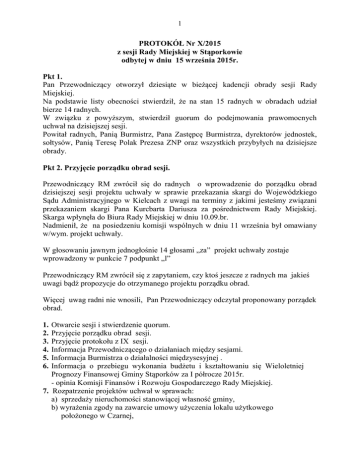1 PROTOKÓŁ Nr X/2015 z sesji Rady Miejskiej w Stąporkowie odbytej w dniu 15 września 2015r. Pkt 1. Pan Przewodniczący otworzył dziesiąte w bieżącej kadencji obrady sesji Rady Miejskiej. Na podstawie listy obecności stwierdził, że na stan 15 radnych w obradach udział bierze 14 radnych. W związku z powyższym, stwierdził guorum do podejmowania prawomocnych uchwał na dzisiejszej sesji. Powitał radnych, Panią Burmistrz, Pana Zastępcę Burmistrza, dyrektorów jednostek, sołtysów, Panią Teresę Polak Prezesa ZNP oraz wszystkich przybyłych na dzisiejsze obrady. Pkt 2. Przyjęcie porządku obrad sesji. Przewodniczący RM zwrócił się do radnych o wprowadzenie do porządku obrad dzisiejszej sesji projektu uchwały w sprawie przekazania skargi do Wojewódzkiego Sądu Administracyjnego w Kielcach z uwagi na terminy z jakimi jesteśmy związani przekazaniem skargi Pana Kurcbarta Dariusza za pośrednictwem Rady Miejskiej. Skarga wpłynęła do Biura Rady Miejskiej w dniu 10.09.br. Nadmienił, że na posiedzeniu komisji wspólnych w dniu 11 września był omawiany w/wym. projekt uchwały. W głosowaniu jawnym jednogłośnie 14 głosami „za” projekt uchwały zostaje wprowadzony w punkcie 7 podpunkt „l” Przewodniczący RM zwrócił się z zapytaniem, czy ktoś jeszcze z radnych ma jakieś uwagi bądź propozycje do otrzymanego projektu porządku obrad. Więcej uwag radni nie wnosili, Pan Przewodniczący odczytał proponowany porządek obrad. 1. 2. 3. 4. 5. 6. Otwarcie sesji i stwierdzenie quorum. Przyjęcie porządku obrad sesji. Przyjęcie protokołu z IX sesji. Informacja Przewodniczącego o działaniach między sesjami. Informacja Burmistrza o działalności międzysesyjnej . Informacja o przebiegu wykonania budżetu i kształtowaniu się Wieloletniej Prognozy Finansowej Gminy Stąporków za I półrocze 2015r. - opinia Komisji Finansów i Rozwoju Gospodarczego Rady Miejskiej. 7. Rozpatrzenie projektów uchwał w sprawach: a) sprzedaży nieruchomości stanowiącej własność gminy, b) wyrażenia zgody na zawarcie umowy użyczenia lokalu użytkowego położonego w Czarnej, 2 c) powołania Zespołu do zaopiniowania kandydatów na ławnika do Sądu Rejonowego w Końskich, na kadencję 2016 – 2019, d) zasięgnięcia od Komendanta Wojewódzkiego Policji w Kielcach informacji o kandydatach na ławnika do Sądu Rejonowego w Końskich, e) potwierdzenia członkostwa i ustalenia sposobu reprezentacji Gminy Stąporków w Stowarzyszeniu „Lokalna Grupa Działania- U ŹRÓDEŁ”, f) wprowadzenia zmiany do Uchwały Nr XVII/101/2008 Rady Miejskiej w Stąporkowie z dnia 20 marca 2008r. w sprawie przekazania sołectwom Gminy Stąporków lokali świetlic wiejskich i określenia zasad gospodarowania tymi lokalami, g)ustalenia regulaminu głosowania w wyborach ławnika do sądu powszechnego na kadencję 2016 – 2019, h) określenia trybu powoływania członków oraz organizacji i trybu działania Gminnej Rady Działalności Pożytku Publicznego, i) zmiany uchwały Nr XXIX/258/2012 Rady Miejskiej w Stąporkowie z dnia 15 listopada 2012r. w sprawie wysokości stawek podatku od nieruchomości oraz określenia inkasentów i stawek za inkaso podatku od nieruchomości, rolnego i leśnego, j) zmiany Wieloletniej Prognozy Finansowej Gminy Stąporków na lata 20152026, k) zmian w budżecie Gminy Stąporków na 2015r. l) przekazania skargi do Wojewódzkiego Sądu Administracyjnego w Kielcach. 8. Zapytania i interpelacje radnych. 9. Odpowiedzi na zapytania i interpelacje radnych. 10. Sprawy różne. 11. Zamknięcie obrad sesji. W głosowaniu jawnym porządek obrad dzisiejszej sesji został przyjęty przez radnych jednogłośnie 14 głosami „za”. Ustawowy skład Rady wynosi 15 radnych, obecnych na sesji jest 14 radnych. Pkt 3. Przyjęcie protokołu z IX Sesji W głosowaniu jawnym głosami „za”. protokół został przyjęty przez radnych jednogłośnie 14 Pkt 4. Informacja Przewodniczącego o działaniach między sesjami. Wiceprzewodniczący RM odczytał informację o działalności międzysesyjnej. ( w załączeniu do protokołu) Pkt 5. Informacja Burmistrza o działalności międzysesyjnej Pan Z-ca Burmistrza odczytał informację o działalności międzysesyjnej. ( w załączeniu do protokołu) 3 Pkt 6. Informacja o przebiegu wykonania budżetu i kształtowaniu się Wieloletniej Prognozy Finansowej Gminy Stąporków za I półrocze 2015r. Przewodnicząca Komisji Finansów i Rozwoju Gospodarczego RM Jedynak Danuta odczytała opinię Komisji. Radni nie wzięli udziału w dyskusji na temat ”Informacji o przebiegu wykonania budżetu i kształtowaniu się Wieloletniej Prognozy Finansowej Gminy Stąporków za I półrocze 2015r. W głosowaniu jawnym Informacja o przebiegu wykonania budżetu i kształtowaniu się Wieloletniej Prognozy Finansowej Gminy Stąporków za I półrocze 2015r. została przyjęta przez radnych jednogłośnie 14 głosami „za”. Ustawowy skład Rady wynosi 15 radnych, obecnych na sesji jest 14 radnych. Pkt 7. Rozpatrzenie projektów uchwał w sprawach: Na wspólnym posiedzeniu Komisji Rady zostały omówione wszystkie projekty uchwał. Ponieważ radni mają je przed sobą Pan Przewodniczący ich nie odczytywał. Pkt 7 „a” Projekt uchwały w sprawie sprzedaży nieruchomości stanowiącej własność gminy Przewodniczący RM poinformował, że na posiedzeniu komisji wspólnych projekt uchwały był omawiany, radni wyrazili zgodę na udzielenie 95% bonifikaty na sprzedaż nieruchomości w Gosaniu na rzecz najemcy lokalu mieszkalnego. Do projektu uchwały radni nie wnosili żadnych uwag ani pytań. W głosowaniu jawnym jednogłośnie 14 głosami „za” została podjęta Uchwała Nr X/60 /2015 w powyższej sprawie. Ustawowy skład Rady wynosi 15 radnych, obecnych na sesji jest 14 radnych. Pkt 7 „b” Projekt uchwały w sprawie wyrażenia zgody na zawarcie umowy użyczenia lokalu użytkowego położonego w Czarnej, Na posiedzeniu komisji wspólnych był omawian
