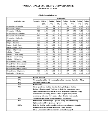 TABELA OPŁAT ZA BILETY JEDNORAZOWE od dnia: 18.03.2015 Oświęcim Głębowice Cena biletu Odcinek trasy : Normalny Zniżka Oświęcim Oświęcim Oświęcim Poręba Oświęcim Polanka Oświęcim Osiek Dolny Oświęcim Osiek Górny Oświęcim Głębowice Poręba Poręba Poręba Polanka Poręba Osiek Dolny Poręba Osiek Górny Poręba Głębowice Polanka Polanka Polanka Osiek Dolny Polanka Osiek Górny Polanka Głębowice Osiek Dolny Osiek Dolny Osiek Dolny Osiek Górny Osiek Dolny Głębowice Osiek Górny Osiek Górny Osiek Górny Głębowice Głębowice Głębowice 20% 37% 49% 51% 78% 93% 95% 100% 20% 2.50 3.00 3.20 3.50 3.50 4.00 2.50 3.00 3.20 3.20 3.50 2.50 3.20 3.20 3.50 2.50 2.50 3.20 2.50 3.20 2.50 2.00 2.40 2.56 2.80 2.80 3.20 2.00 2.40 2.56 2.56 2.80 2.00 2.56 2.56 2.80 2.00 2.00 2.56 2.00 2.56 2.00 Zniżka Zniżka Zniżka Zniżka Zniżka Zniżka 37% 49% 51% 78% 93% 95% 1.58 1.89 2.02 2.21 2.21 2.52 1.58 1.89 2.02 2.02 2.21 1.58 2.02 2.02 2.21 1.58 1.58 2.02 1.58 2.02 1.58 1.28 1.53 1.63 1.79 1.79 2.04 1.28 1.53 1.63 1.63 1.79 1.28 1.63 1.63 1.79 1.28 1.28 1.63 1.28 1.63 1.28 1.23 1.47 1.57 1.72 1.72 1.96 1.23 1.47 1.57 1.57 1.72 1.23 1.57 1.57 1.72 1.23 1.23 1.57 1.23 1.57 1.23 0.55 0.66 0.70 0.77 0.77 0.88 0.55 0.66 0.70 0.70 0.77 0.55 0.70 0.70 0.77 0.55 0.55 0.70 0.55 0.70 0.55 0.18 0.21 0.22 0.25 0.25 0.28 0.18 0.21 0.22 0.22 0.25 0.18 0.22 0.22 0.25 0.18 0.18 0.22 0.18 0.22 0.18 0.13 0.15 0.16 0.18 0.18 0.20 0.13 0.15 0.16 0.16 0.18 0.13 0.16 0.16 0.18 0.13 0.13 0.16 0.13 0.16 0.13 Uczeń, Student Weteran inwalida, Niewidomy, Inwalida wojenny, Dziecko 45 lat, Osoba niesamodzielna, Kombatant Straż granicznasłużba, Celniksłużba, Policjantsłużba, Żołnierz Żandarmerii Wojskowej, Dziecko niepełnosprawne, Opiekun dziecka niepełnosprawnego, Inwalida wojenny I grupy Żołnierz niezawodowy, Dziecko do 4 lat przy korzystaniu z osobnego miejsca, Niewidoma ofiara działań wojennych, Niewidomy niezdolny do samodzielnej egzystencji Przewodnik niewidomego, Opiekun osoby niesamodzielnej, Opiekun inwalidy wojennego I grupy Dziecko do 4 lat pod warunkiem niekorzystania przez dziecko z oddzielnego miejsca do siedzenia, Poseł, Senator, Straż Granicznaochrona szlaków komunikacyjnych