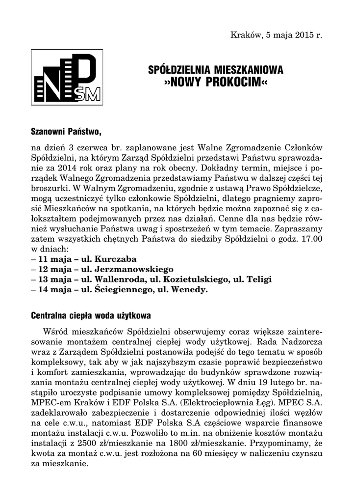 Kraków, 5 maja 2015 r. SPÓŁDZIELNIA MIESZKANIOWA »NOWY PROKOCIM« Szanowni Państwo, na dzień 3 czerwca br. zaplanowane jest Walne Zgromadzenie Członków Spółdzielni, na którym Zarząd Spółdzielni przedstawi Państwu sprawozdanie za 2014 rok oraz plany na rok obecny. Dokładny termin, miejsce i porządek Walnego Zgromadzenia przedstawiamy Państwu w dalszej części tej broszurki. W Walnym Zgromadzeniu, zgodnie z ustawą Prawo Spółdzielcze, mogą uczestniczyć tylko członkowie Spółdzielni, dlatego pragniemy zaprosić Mieszkańców na spotkania, na których będzie można zapoznać się z całokształtem podejmowanych przez nas działań. Cenne dla nas będzie również wysłuchanie Państwa uwag i spostrzeżeń w tym temacie. Zapraszamy zatem wszystkich chętnych Państwa do siedziby Spółdzielni o godz. 17.00 w dniach: – 11 maja – ul. Kurczaba – 12 maja – ul. Jerzmanowskiego – 13 maja – ul. Wallenroda, ul. Kozietulskiego, ul. Teligi – 14 maja – ul. Ściegiennego, ul. Wenedy. Centralna ciepła woda użytkowa Wśród mieszkańców Spółdzielni obserwujemy coraz większe zainteresowanie montażem centralnej ciepłej wody użytkowej. Rada Nadzorcza wraz z Zarządem Spółdzielni postanowiła podejść do tego tematu w sposób kompleksowy, tak aby w jak najszybszym czasie poprawić bezpieczeństwo i komfort zamieszkania, wprowadzając do budynków sprawdzone rozwiązania montażu centralnej ciepłej wody użytkowej. W dniu 19 lutego br. nastąpiło uroczyste podpisanie umowy kompleksowej pomiędzy Spółdzielnią, MPEC-em Kraków i EDF Polska S.A. (Elektrociepłownia Łęg). MPEC S.A. zadeklarowało zabezpieczenie i dostarczenie odpowiedniej ilości węzłów na cele c.w.u., natomiast EDF Polska S.A częściowe wsparcie finansowe montażu instalacji c.w.u. Pozwoliło to m.in. na obniżenie kosztów montażu instalacji z 2500 zł/mieszkanie na 1800 zł/mieszkanie. Przypominamy, że kwota za montaż c.w.u. jest rozłożona na 60 miesięcy w naliczeniu czynszu za mieszkanie. ZAWIADOMIENIE Zarząd Spółdzielni Mieszkaniowej „Nowy Prokocim” działając na mocy § 91 ust. 1 Statutu z w o ł u j e na dzień 3 czerwca 2015 roku (środa) o godz. 18-tej w hali KS Korona, ul. Kalwaryjska 9–15 w Krakowie WALNE ZGROMADZENIE SPÓŁDZIELNI MIESZKANIOWEJ „NOWY PROKOCIM” z następującym porządkiem obrad: 1. Otwarcie Zgromadzenia. 2. Wybór Prezydium Zgromadzenia. 3. Uchwalenie Regulaminu obrad. 4. Przyjęcie porządku obrad. 5. Wybór Komisji: Mandatowo-Wyborczej, Skrutacyjnej i Wnioskowej. 6. Sprawozdanie Zarządu z działalności za okres od 1.01.2014 r. do 31.12.2014 r. 7. Sprawozdanie Komisji Mandatowo-Wyborczej w przedmiocie obecności i prawidłowości zwołania Zgromadzenia. 8. Sprawozdanie finansowe Spółdzielni za okres od 1.01.2014 r. do 31.12.2014 r. 9. Sprawozdanie Rady Nadzorczej z działalności za okres od czerwca 2014 r. do maja 2015 r. 10. Wybory do Rady Nadzorczej – zgłaszanie kandydatów. 11. Sprawozdanie z realizacji wniosków zgłoszonych na Walnym Zgromadzeniu w dniu 4.06.2014 r. 12. Rozpatrzenie odwołania od uchwały Rady Nadzorczej dot. wykluczenia ze Spółdzielni – podjęcie uchwały. 13. Podjęcie uchwał w sprawie zmiany przynależności Spółdzielni do związku rewizyjnego. 14. Wybory do Rady Nadzorczej – tajne głosowanie. 15. DYSKUSJA. 16. Sprawozdanie Komisji Wnioskowej i podjęcie uchwał w sprawach: a. zatwierdzenia sprawozdania Zarządu Spółdzielni, b. zatwierdzenia sprawozdania finansowego Spółdzielni, c. podziału nadwyżki bilansowej, d. zatwierdzenia sprawozdania Rady Nadzorczej, e. udzielenia absolutorium dla członków Zarządu. 17. Przedstawienie przez Komisję Wnioskową zgłoszonych wniosków – głosowanie nad ich przyjęciem lub odrzuceniem. 18. Wybory do Rady Nadzorczej – ogłoszenie wyników wyborów przez Komisję Skrutacyjną. 19. Zamknięcie obrad. Projekt Regulaminu obrad Walnego Zgromadzenia, projekty uchwał będących przedmiotem obrad, roczne sprawozdanie z działalności Spółdzielni łącznie ze sprawozdaniem finansowym wraz z opinią biegłego rewidenta, sprawozdanie Rady Nadzorczej – wyłożone będą do wglądu w siedzibie Spółdzielni przy ul. Kurczaba 25 we wszystkie dni robocze w godz. 1100–1400 (poniedziałek do 1630), poczynając od dnia 20.05.2015 r. Prawo uczestniczenia w Walnym Zgromadzeniu SM „Nowy Prokocim” mają tylko członkowie Spółdzielni za okazaniem dowodu tożsamości. Centralna ciepła woda użytkowa c.d. W bieżącym roku wykonujemy instalację w budynkach Teligi 17, Kurczaba 7, Kozietulskiego 1, Ściegiennego 89, Wenedy 15 i Jerzmanowskiego 18. W budynkach tych ponad połowa mieszkańców zadeklarowała chęć podłączenia ciepłej wody do swoich mieszkań. W rezultacie, po zakończonych już pracach w czterech budynkach z podłączenia do instalacji ciepłej wody użytkowej skorzystało: – 87,5% z budynku przy ul. Teligi 17 – 82% z budynku przy ul. Kurczaba 7 – 85,4 z budynku przy ul. Kozietulskiego 1 – 75% z budynku przy ul. Ściegiennego 89. Cykl przygotowania inwestycji w budynku wynosi około pół roku. Gorąco namawiamy Państwa, którzy jeszcze nie zadeklarowali chęci montażu c.w.u. do składania deklaracji w siedzibie Spółdzielni. Przypominamy z „Informatora Ciepłej Wody Użytkowej”, który otrzymali Państwo w lipcu ubiegłego roku, że warunkiem rozpoczęcia inwestycji w konkretnym budynku jest co najmniej 50% chętnych do zamontowania w swoim mieszkaniu centralnej ciepłej wody użytkowej. Odpady wielkogabarytowe Od czasu wprowadzenia nowej „ustawy śmieciowej” minęło już sporo czasu. Jednak wiele osób nadal nie stosuje się do przekazywanych Państwu informacji dotyczących terminu wywozu odpadów wielkogabarytowych. Jak już informowaliśmy, wyrzucane w różnych terminach pod altany śmietnikowe odpady są zachętą do podpaleń a ponadto wpływają na obniżenie wizerunku naszego osiedla. Od marca br. MPO ustali