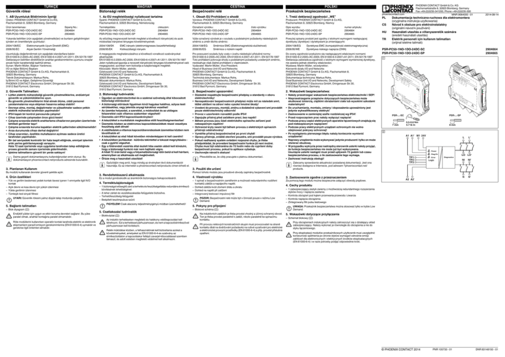 MAGYAR ČEŠTINA Güvenlik rölesi Biztonsági relék Bezpečnostní relé POLSKI Przekaźnik bezpieczeństwa 1. AB Uyumluluk Bildiriminin İçeriği 1. Az EU megfelelősségi nyilatkozat tartalma 1. Obsah EU Prohlášení o shodě 1. Treść deklaracji zgodności „WE” Üretici: PHOENIX CONTACT GmbH & Co.KG, Flachsmarktstr.8, 32825 Blomberg, Germany Gyártó: PHOENIX CONTACT GmbH & Co.KG, Flachsmarktstr.8, 32825 Blomberg, Németország Výrobce: PHOENIX CONTACT GmbH & Co.KG, Flachsmarktstr.8, 32825 Blomberg, Germany Producent: PHOENIX CONTACT GmbH & Co.KG, Flachsmarktstr.8, 32825 Blomberg, Niemcy PHOENIX CONTACT GmbH & Co. KG Flachsmarktstraße 8, 32825 Blomberg, Germany Fax +49-(0)5235-341200, Phone +49-(0)5235-300 MNR 9064000 - 01 phoenixcontact.com Sipariş No.: 2904664 2904665 Termékjelölés: PSR-PC50-1NO-1DO-24DC-SC PSR-PC50-1NO-1DO-24DC-SP cikkszám: 2904664 2904665 Označení výrobku: PSR-PC50-1NO-1DO-24DC-SC PSR-PC50-1NO-1DO-24DC-SP číslo výrobku: 2904664 2904665 Opis wyrobu: PSR-PC50-1NO-1DO-24DC-SC PSR-PC50-1NO-1DO-24DC-SP CS numer artykułu: 2904664 2904665 Yukarıda belirtilen ürün aşağıdaki yönetmelik(ler) ve bunların geliştirilmişleri içinden en önemlileriyle uyumludur: Az előzőleg megnevezett termék megfelel a következő irányelv(ek) és azok módosítási irányelvei lényeges követelményeinek: Výše označený výrobek je v souladu s podstatnými požadavky následujících směrnic a změn těchto směrnic: Powyżej opisany produkt jest zgodny z istotnymi wymogami następującej dyrektywy (dyrektyw) i dyrektywami je zmieniającymi: 2004/108/EC 2006/95/EC 2004/108/EK 2006/95/EK 2004/108/EG 2006/95/EG 2004/108/EG 2006/95/WE Elektromanyetik Uyum Direktifi (EMC) Alçak Gerilim Yönetmeliği Uyumluluğu değerlendirmek için aşağıdaki standartlara bakılır: EN 61000-6-2:2005+AC:2005; EN 61000-6-4:2007+A1:2011; EN 50178:1997 Deklarasyon belirtilen direktif(ler)in anahtar gereksinimlerine uyumunu onaylar ancak hiçbir karakteristiği taahhüt etmez. Sunan: Martin Müller, Başkan Yardımcısı; I/O ve Ağlar Bölümü Başkanı PHOENIX CONTACT GmbH & Co.KG, Flachsmarktstr.8, 32825 Blomberg, Germany Teknik Dokümantasyon: Markus Rohs, İş Birimi I/O ve Ağları, Geliştirme Güvenliği PHOENIX CONTACT Electronics GmbH, Dringenauer Str.30, 31812 Bad Pyrmont, Germany 2. Güvenlik Talimatları: • Lütfen elektrik mühendisliği güvenlik yönetmeliklerine, endüstriyel güvenlik ve yükümlülüklerine uyun. • Bu güvenlik yönetmeliklerini ihlal etmek ölüme, ciddi personel yaralanmalarına veya ekipman hasarına sebep olabilir! • Devreye alma, montaj, değiştirmeler ve yükseltmeler sadece yetkin elektrik mühendisi tarafından yapılmalıdır! • IP54 kapalı bir kontrol panosunda çalışma! • Cihaz üzerinde çalışmadan önce gücü kesin! • Çalışma sırasında elektrik anahtarlama cihazlarının parçaları üzerlerinde tehlikeli gerilimler taşır! • Çalışma sırasında koruma kapakları elektrik şalterinden sökülmemelidir! • Arıza durumunda cihazı derhal değiştirin! • Cihaz onarımları, özellikle muhafazanın açılması sadece üretici tarafından yapılmalıdır. • Bir üst seviyedeki kontrolör bir hata tespit ettiğinde, emniyet işlevinin artık yerine getirilemeyeceği varsayılır. Hata 72 saat içerisinde veya uygulama tarafından talep edildiğinde proses güvenlik zamanı içerisinde giderilmelidir. • İşletme talimatlarını güvenli bir yerde saklayın! Daima geçerli dokümantasyonu kullandığınızdan emin olunuz. Bu dokümantasyon phoenixcontact.net/products adresinde bulunabilir. EMC irányelv (elektromágneses összeférhetőség) Kisfeszültségű irányelv A megegyezés meghatározásához a következő vonatkozó szabványokat alkalmazták: EN 61000-6-2:2005+AC:2005; EN 61000-6-4:2007+A1:2011; EN 50178:1997 Jelen nyilatkozat igazolja a nevezett irányelv(ek) lényeges követelményeivel való megegyezést, azonban nem biztosítja a tulajdonságok meglétét. Kibocsátó: Martin Müller, alelnök; Üzletvezető Unit I/O and Networks PHOENIX CONTACT GmbH & Co.KG, Flachsmarktstr.8, 32825 Blomberg, Germany Műszaki dokumentáció: Markus Rohs, Üzletvezető Unit I/O and Networks, Development Safety PHOENIX CONTACT Electronics GmbH, Dringenauer Str.30, 31812 Bad Pyrmont, Germany 2. Biztonsági tudnivalók: • Ügyeljen az elektrotechnikai és a szakmai szövetség által kibocsátott biztonsági előírásokra! • A biztonsági előírások figyelmen kívül hagyása halálhoz, súlyos testi sérülésekhez, vagy jelentős anyagi károkhoz vezethet! • Az üzembe helyezést, a szerelést, a módosítást és az utólagos felszerelést csak villamos szakember végezheti! • Üzemelés zárt IP54 kapcsolószekrényben! • A készüléket a munkálatok megkezdése előtt feszültségmentesítse! • Üzemelés közben az elektromos kapcsolókészülékek részei veszélyes feszültség alatt állnak! • A védőfedelek a villamos kapcsolóberendezések üzemelése közben nem távolíthatók el! • A készüléket az első hibát követően mindenképpen ki kell cserélni! • A készüléken javításokat - különös tekintettel a tokozat megnyitására csak a gyártó végezhet. • Egy a fölérendelt vezérlés által észlelt hiba esetén abból kell kiindulni, hogy a biztonsági funkció már nem hajtható végre. A hibát 72 órán belül vagy a folyamatbiztonsági időn belül el kell hárítani, amennyiben az alkalmazás ezt megköveteli. • Őrizze meg a használati utasítást! Směrnice EMC (Elektromagnetická slučitelnost) Směrnice o nízkém napětí Pro posouzení souladu byly vzaty v úvahu následující příslušné normy: EN 61000-6-2:2005+AC:2005; EN 61000-6-4:2007+A1:2011; EN 50178:1997 Toto prohlášení potvrzuje shodu s podstatnými požadavky uvedených směrnic, neobsahuje však žádné prohlášení o vlastnostech. Vydavatel: Martin Müller, Vice 