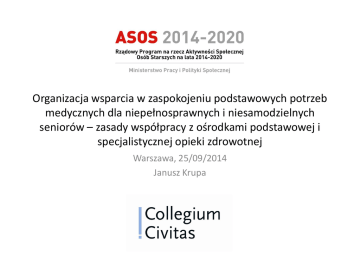 Organizacja wsparcia w zaspokojeniu podstawowych potrzeb medycznych dla niepełnosprawnych i niesamodzielnych seniorów – zasady współpracy z ośrodkami podstawowej i specjalistycznej opieki zdrowotnej Warszawa, 25/09/2014 Janusz Krupa Program sesji 1. Ochrona zdrowia (POZ i poradnictwo specjalistyczne) perspektywa lekarza POZ: role, zadania, koordynacja 2. Ochrona zdrowia (POZ i poradnictwo specjalistyczne) perspektywa pacjenta i opiekuna – warsztat/część interaktywna dla uczestników – 30’ 3. Identyfikacja niezaspokojonych potrzeb niepełnosprawnych i niesamodzielnych seniorów i ich opiekunów – warsztat – 15’ 4. Możliwe rozwiązania/rekomendacje dla niepełnosprawnych i niesamodzielnych seniorów i ich opiekunów – 15’ Problemy osób w starszym wieku Choroby ostre Odleżyny Upadki i złamania Zaburzenia wzroku Choroby przewlekłe Niesprawność fizyczna Codzienna higiena i toaleta Zaburzenia komunikacji Sprzęt rehabilitacyjny Zaburzenia funkcji poznawczych Rehabilitacja/fizykoterapia Opieka medyczna nad osobami starszymi Liczba osób pow. 70 rż w Polsce – 3 874 000 Liczba osób w wieku 65-69 w Polsce – 1 613 000 Liczba osób w wieku powyżej 65 r.ż. w Polsce – 5 487 000 Liczba geriatrów w Polsce - 250 Liczba pielęgniarek geriatrycznych - 300 Opieka geriatryczna jest niedostateczna – opiekę nad osobą starszą sprawuje więc zwykle praktyka POZ POZ i AOS POZ – Podstawowa Opieka Zdrowotna AOS – Ambulatoryjna Opieka Specjalistyczna Praktyka POZ Pielęgniarka POZ Lekarz POZ Lekarz POZ Pielęgniarka Środowiskowa POZ Położna POZ Pielęgniarska Opieka Długoterminowa Domowa - poza strukturą POZ!!! Rola lekarza POZ Skierowania Diagnostyka i leczenie Współpraca ze specjalistami Transport sanitarny Profilaktyka Zaświadczenia Koordynacja leczenia i opieki Rola lekarza POZ [1] • profilaktyka chorób, w tym badania i porady w ramach profilaktyki wieku rozwojowego oraz szczepienia ochronne, • świadczenia profilaktyki chorób układu krążenia, • udzielanie porad w leczeniu schorzeń, w tym zapewnienie diagnostyki laboratoryjnej oraz obrazowej i nieobrazowej (EKG, RTG, USG) zgodnie z obowiązującym wykazem, • wykonywanie zabiegów w gabinecie zabiegowym i w domu pacjenta, Rola lekarza POZ [2] • orzekanie o stanie zdrowia, • inne świadczenia wynikające z potrzeb populacji objętej opieką, w tym: kierowanie do poradni specjalistycznych i na leczenie szpitalne, kierowanie na rehabilitację i leczenie uzdrowiskowe, kwalifikowanie do świadczeń transportu sanitarnego w POZ i wystawianie zleceń przewozów, wystawianie zleceń na realizację świadczeń pozostających w zakresie zadań pielęgniarki POZ, wystawianie zaświadczeń dotyczących stanu zdrowia pacjenta. Rola pielęgniarki POZ („środowiskowej”) Przygotowanie i aktywizowanie do samoopieki i samopielęgnacji w chorobie i niepełnosprawności, Świadczenia pielęgnacyjne Iniekcje i zabiegi Zakładanie opatrunków na rany, odleżyny, oparzenia Świadczenia rehabilitacyjne ocena i monitorowanie bólu Pobieranie materiałów diagnostycznych Ocena wydolności pielęgnacyjno-opiekuńczej rodziny, w tym pielęgniarska kwalifikacja do objęcia pacjenta pielęgniarską opieką długoterminową Rola pielęgniarki POZ [1] Świadczenia pielęgniarki POZ obejmują kompleksową opiekę pielęgniarską nad osobą, rodziną, społecznością w środowisku zamieszkania, z uwzględnieniem miejsca udzielania świadczeń, takie jak: • świadczenia profilaktyczne u dzieci w wieku 0-6 r.ż., • świadczenia profilaktyki gruźlicy; Rola pielęgniarki POZ [2] • świadczenia lecznicze, w tym: wykonywanie iniekcji i zabiegów na podstawie zleceń lekarzy ubezpieczenia zdrowotnego w gabinecie pielęgniarki POZ i w domu pacjenta; • świadczenia diagnostyczne, w tym: pobieranie materiałów do badań diagnostycznych na podstawie zlecenia lekarza POZ, w sytuacji gdy pobranie z przyczyn medycznych powinno być zrealizowane w domu pacjenta; • świadczenia pielęgnacyjne i rehabilitacyjne, w szczególności dla osób, u których występuje ograniczenie sprawności psychofizycznej w wyniku choroby. Rola pielęgniarki środowiskowej [1] • rozpoznawanie potrzeb pielęgnacyjnych i problemów zdrowotnych pacjentów oraz realizacja opieki pielęgnacyjnej w różnych stanach zdrowia i choroby zgodnie z aktualną wiedzą medyczną i współczesnymi standardami opieki pielęgniarskiej, • przygotowanie i aktywizowanie do samoopieki i samopielęgnacji w chorobie i niepełnosprawności, • wykonywanie testów diagnostycznych poza laboratorium w oparciu o zestawy i aparaturę przeznaczoną do wykonywania oznaczeń w miejscu zamieszkania świadczeniobiorcy, • ocena i monitorowanie bólu, • ocena wydolności pielęgnacyjno-opiekuńczej rodziny, w tym pielęgniarska kwalifikacja do objęcia pacjenta pielęgniarską opieką długoterminową Rola pielęgniarki środowiskowej [2] • zakładanie opatrunków na rany, odleżyny, oparzenia, • cewnikowanie pęcherza u kobiet, • wykonywanie zabiegów pielęgnacyjno-leczniczych w stomiach, przetokach i ranach trudno gojących się, w porozumieniu z lekarzem, • ustalanie diety w żywieniu przewlekle chorych i dobór technik karmienia w zależności od stanu chorego, • rehabilitacja przyłóżkowa w celu zapobiegania powikłaniom wynikającym z procesu chorobowego i długotrwałego unieruchomienia, usprawnianie ruchowe, drenaż ułożeniowy, gimnastyka oddechowa. Pielęgniarska Opieka Długoterminowa Domowa [1] Do Pielęgniarskiej Opieki Długoterminowej Domowej może zostać przyjęta osoba ubezpieczona, z rozpoznaniem choroby przewlekłej, wymagająca świadczeń pielęgniarskich, której stan w skali Barthel oceniono na nie więcej niż 40 punktów. Oceny dokonuje lekarz kierujący pacjenta (lekarz POZ lub lekarz wypisujący pacjenta ze szpitala) oraz pielęgniarka PODD w dniu przyjęcia pacjenta. Pielęgniarska Opieka Długoterminowa Domowa [2] Pielęg