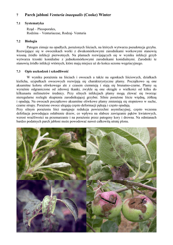 7 Parch jabłoni Venturia inaequalis (Cooke) Winter 7.1 Systematyka Rząd – Pleosporales, Rodzina – Venturiaceae, Rodzaj- Venturia 7.2 Biologia Patogen zimuje na opadłych, porażonych liściach, na których wytwarza pseudotecja grzyba. Rozwijające się w owocnikach worki z dwukomórkowymi zarodnikami workowymi stanowią wiosną źródło infekcji pierwotnych. Na plamach rozwijających się w wyniku infekcji grzyb wytwarza trzonki konidialne z jednokomórkowymi zarodnikami konidialnymi. Zarodniki te stanowią źródło infekcji wtórnych, które mają miejsce aż do końca sezonu wegetacyjnego. 7.3 Opis uszkodzeń i szkodliwość W wyniku porażenia na liściach i owocach a także na ogonkach liściowych, działkach kielicha, szypułkach owocowych rozwijają się charakterystyczne plamy. Początkowo są one aksamitne koloru oliwkowego ale z czasem ciemnieją i stają się brunatno-czarne. Plamy są wyraźnie odgraniczone od zdrowej tkanki, zwykle są one okrągłe o wielkości od kilku do kilkunastu milimetrów średnicy. Przy silnych infekcjach plamy mogą zlewać się tworząc nieregularne rozległe skupienia zarodnikującej grzybni. Silnie porażone liście więdną, żółkną i opadają. Na owocach początkowo aksamitne oliwkowe plamy zmieniają się stopniowo w suche, czarne strupy. Porażone owoce ulegają często deformacji pękają i często opadają. Przy silnym porażeniu liści następuje redukcja powierzchni asymilacyjnej, często wczesna defoliacja powodująca osłabienie drzew, co wpływa na słabsze zawiązanie pąków kwiatowych, wzrost wrażliwości na przemarzanie i na porażenie przez patogeny kory i drewna. Na odmianach bardzo podatnych parch jabłoni może powodować nawet całkowitą utratę plonu. 7.4 Metodyka obserwacji W okresie infekcji pierwotnych, począwszy od trzeciego tygodnia po pierwszym wysiewie zarodników workowych (skala BBCH 56-57), lustracje prowadzić co 2 tygodnie przeglądając liście, ogonki liściowe, szypułki owocowe i zawiązki na 10 losowo wybranych drzewach. Do lustracji należy wybrać odmiany podatne na parch i różniące się rozwojem wegetatywnym. Ważnym terminem lustracji jest czas zakończenia infekcji pierwotnych (około 2-3 tygodnie po ostatnim wysiewie, (skala BBCH 73-75). Wyniki tej lustracji pozwolą na ustalenie wytycznych ochrony w późniejszym okresie. Po zakończeniu okresu infekcji pierwotnych lustracje powinny być prowadzone co 3-4 tygodnie, przede wszystkim po okresach długotrwałych opadów. W celu oceny stopnia porażenia liści i owoców jabłoni przez V. inaequalis wykorzystuje się 6-cio stopniową skalę: (rys. 1) dla liści: 0 - zdrowe liście, I – średnio 0,5% powierzchni liści zajętej przez plamy, II – 3%, III – 12,5%, IV – 35%, V – 75%; (rys. 2) dla owoców: 0 - zdrowe, I – 0,5% powierzchni owoców zajętej przez plamy, II – 3%, III – 7,5%, IV – 15%, V – 30%. Każdorazowo ocenia się po 200 losowo wybranych liści oraz po 100 owoców w 4 powtórzeniach. Rys. 1. Skala nasilenia objawów parcha jabłoni na liściach Rys. 2. Skala nasilenia objawów parcha jabłoni na owocach 7.5 Terminy zabiegów, progi szkodliwości Zabiegi rozpocząć tuż przed pierwszym wysiewem zarodników workowych i do około dwu tygodni po kwitnieniu jabłoni wykonywać je przede wszystkim zapobiegawczo. Wskazania sygnalizatorów okresów krytycznych są bardzo przydatne po kwitnieniu i zabiegi mogą być wykonywane według programu zapobiegawczo-interwencyjnego. W sadach, w których po zakończeniu infekcji pierwotnych nie stwierdzono objawów parcha jabłoni, ochronę chemiczną można ograniczyć do zabiegów w okresie wystąpienia długotrwałych opadów. W innych sadach powinna być kontynuowana do okresu zbiorów.
