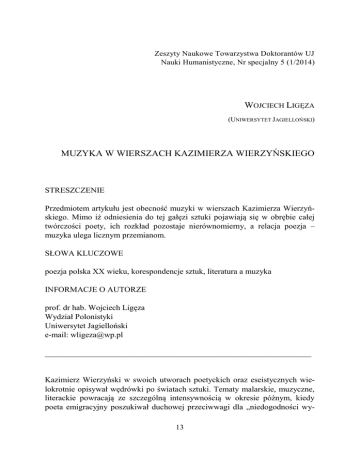 Zeszyty Naukowe Towarzystwa Doktorantów UJ Nauki Humanistyczne, Nr specjalny 5 (1/2014) WOJCIECH LIGĘZA (UNIWERSYTET JAGIELLOŃSKI) MUZYKA W WIERSZACH KAZIMIERZA WIERZYŃSKIEGO STRESZCZENIE Przedmiotem artykułu jest obecność muzyki w wierszach Kazimierza Wierzyńskiego. Mimo iż odniesienia do tej gałęzi sztuki pojawiają się w obrębie całej twórczości poety, ich rozkład pozostaje nierównomierny, a relacja poezja – muzyka ulega licznym przemianom. SŁOWA KLUCZOWE poezja polska XX wieku, korespondencje sztuk, literatura a muzyka INFORMACJE O AUTORZE prof. dr hab. Wojciech Ligęza Wydział Polonistyki Uniwersytet Jagielloński e-mail: [email protected] ________________________________________________________________ Kazimierz Wierzyński w swoich utworach poetyckich oraz eseistycznych wielokrotnie opisywał wędrówki po światach sztuki. Tematy malarskie, muzyczne, literackie powracają ze szczególną intensywnością w okresie późnym, kiedy poeta emigracyjny poszukiwał duchowej przeciwwagi dla „niedogodności wy13 Wojciech Ligęza __________________________________________________________________________________________________________________________________________________________________________________________________________________________________ gnania”. Przebywając w Nowym Jorku, podróżując po Europie, zyskał szerszą perspektywę oglądu zjawisk artystycznych, nie tylko nowoczesnych. Wtajemniczenia kulturowe poety łączą się integralnie z wewnętrzną biografią artysty, pośredniczą w przekazywaniu emocji i przeżyć, formułowaniu pytań egzystencjalnych oraz metafizycznych. Świadectwa sztuki, które mają zdolność przekraczania granic czasu i przestrzeni, mogą być włączone w obszar własnych doświadczeń poety, nadając im większą trwałość, gdyż to, co zostało zapisane w znakach kultury, opiera się nagłym zmianom w dziejach, nie podlega ulotności życia, nie przepada. Kazimierz Wierzyński jest zafascynowany sztuką słowa – celnością sformułowań, rytmami fraz językowych, które sam układał i które znajdował u innych poetów, walorami rozłożenia barw na płaszczyźnie, oddziaływaniem kompozycji muzycznych. Szczególnie interesowały Wierzyńskiego biografie artystów – demiurgów szczęśliwych i męczenników sztuki, opuszczonych, samotnych. Przy tej sposobności poeta gromadził przemyślenia na temat uwikłań twórcy w dzieje oraz związków pomiędzy percepcją sztuki a rozumieniem egzystencji. Warto wspomnieć o kompensacyjnych właściwościach liryków Wierzyńskiego poświęconych sztuce, o poszukiwaniu trwałych wartości, które można by przeciwstawić wyrokom historii w wieku XX oraz niszczącemu działaniu losu. Poeta, wygnaniec i emigrant, dostrzegał katastrofy złego wieku, a podejmując refleksję nad odziedziczoną przeszłością, starał się dotrzeć do zrozumienia tego, co aktualne, a także – za pośrednictwem dialogu z tekstami kultury – opanować cierpienia, oswoić niedogodności życia na emigracji. W tym szkicu rozległe zagadnienie obecności literatury i sztuki w dziele Kazimierza Wierzyńskiego ograniczę do obszaru muzyki. Najogólniej rzecz ujmując, interesować mnie będą rozmaite postaci doświadczenia muzycznego w lirykach autora Korca maku. Warto jednak zapytać, czym jest to doświadczenie i dlaczego język poetycki jest tak przydatny, kiedy usiłujemy przybliżyć istotę muzyki, zwerbalizować nasze reakcje na przekaz utworzony z dźwięków. Opis form domaga się wyspecjalizowanego muzykologicznego dyskursu, ale ani świadomość metody, ani precyzja terminów nie przybliżają jeszcze pełni doświadczenia, o którym w tych rozważaniach mowa. Poetycka muzykologia, która wykracza poza stosowane w nauce standardy, często bywa nieprzewidywalna, jeżeli chodzi o rodzaj namysłu. Co oczywiste, doświadczenie muzyczne łączy się z przeżywaniem czasu. Przebiegi zmiennych jakości melodycznych, kolorystycznych i agogicznych w utworze muzycznym przypominają fluktuacje uczuć ludzkich. Skoro „życiem [muzyki] jest artykulacja, nie zaś wypowiadanie sądów, ekspresyjność, a nie 14 Muzyka w wierszach Kazimierza Wierzyńskiego __________________________________________________________________________________________________________________________________________________________________________________________________________________________________ ekspresja”1, to znaczenie powstawać będzie na linii przecięcia form muzycznych i postaci uczuć ludzkich. Zapewne w rozumieniu muzyki i przybliżaniu jej znaczeń symbolicznych w istotny sposób dopomaga poetyckie postrzeganie rzeczy czy też – poetycka wrażliwość. Próby nazwania doznań muzycznych nie mogą obyć się bez metafor, a zatem odsłania się tutaj bliskie sąsiedztwo z poezją, a szczególnie z jej odmianą liryczną, medytacyjną. Zatem poezja w tym wymiarze sensów odpowiada na przekaz z „innego świata”, usytuowanego ponad grą przypadków, uporządkowanego wedle zasad kompozycji muzycznej. Jak przeczytamy w książce Anny Chęćki-Gotkowicz Ucho i umysł (tytuł jest parafrazą dzieła Maurice’a Merleau-Ponty’ego Oko i umysł): Muzyka potrzebuje metafor, aby się słuchaczowi ucieleśnić nie tylko jako rezultat doświadczenia, ale też jako właściwa substancja. […] Nieusuwalność tego rodzaju [konstrukcji językowych – W. L.] z naszych mniej czy bardziej fachowych relacji doświadczenia dźwięków świadczy o tym, że muzyki słuchamy p o p r z e z m e t a f o r y. Jeśli zgodzimy się na ujęcie jej w kategoriach doświadczenia egzystencjalnego, to język figuratywny okaże się […] jedynym sposobem zwerbalizowania2. Te zdania o percepcji muzycznej i związkach między słuchaniem a rozumieniem naprowadzają nas na trop refleksji o tematach muzycznych w poezji, o muzyce, która nie może zostać oderwana od podmiotowego przeżycia, i o tym także, czym jest wejście w s