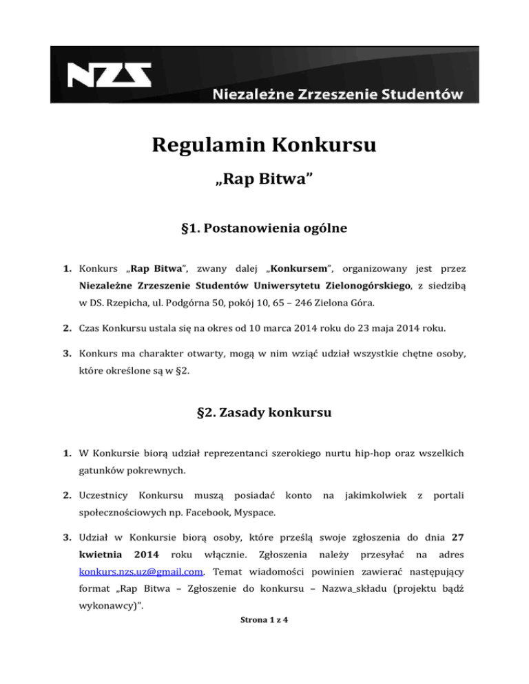 Regulamin Konkursu „Rap Bitwa” §1. Postanowienia ogólne 1. Konkurs „Rap Bitwa”, zwany dalej „Konkursem”, organizowany jest przez Niezależne Zrzeszenie Studentów Uniwersytetu Zielonogórskiego, z siedzibą w DS. Rzepicha, ul. Podgórna 50, pokój 10, 65 – 246 Zielona Góra. 2. Czas Konkursu ustala się na okres od 10 marca 2014 roku do 23 maja 2014 roku. 3. Konkurs ma charakter otwarty, mogą w nim wziąć udział wszystkie chętne osoby, które określone są w §2. §2. Zasady konkursu 1. W Konkursie biorą udział reprezentanci szerokiego nurtu hip-hop oraz wszelkich gatunków pokrewnych. 2. Uczestnicy Konkursu muszą posiadać konto na jakimkolwiek z portali społecznościowych np. Facebook, Myspace. 3. Udział w Konkursie biorą osoby, które prześlą swoje zgłoszenia do dnia 27 kwietnia 2014 roku włącznie. Zgłoszenia należy przesyłać na adres [email protected]. Temat wiadomości powinien zawierać następujący format „Rap Bitwa – Zgłoszenie do konkursu – Nazwa_składu (projektu bądź wykonawcy)”. Strona 1 z 4 4. Zgłoszenie powinno zawierać: Nazwę składu/wykonawcy; Gatunek muzyczny; Historię składu/wykonawcy (fakultatywnie); Zdjęcie składu/wykonawcy (fakultatywnie); Zapis minimum dwóch nagrań wybranych utworów (demo); Rider techniczny; Link do konta na portalu społecznościowym; Numer telefonu. 5. Lista wykonawców, którzy zostaną zaproszeni do Finału Konkursu w Klubie Wyspa, będzie ogłoszona przez Organizatora 30 kwietnia 2014 roku. Uczestnicy Finału zostaną poinformowani telefonicznie oraz drogą elektroniczną. Lista wykonawców będzie również dostępna na stronie www.nzs.uz.zgora.pl oraz www.facebook.com/NZSUZ. 6. Konkurs składa się z następujących etapów: I etap Konkursu będzie polegał na wybraniu w drodze głosowania przez Członków Niezależnego Zrzeszenia Studentów Uniwersytetu Zielonogórskiego, zakwalifikowanych wykonawców, którzy wezmą udział w Finale Konkursu; Finał Konkursu odbędzie się dnia 15 maja 2014 roku w Klubie Wyspa, przy ul. Wojska Polskiego 65 w Zielonej Górze, gdzie publiczność wybierze najlepszy skład/wykonawcę, który zostanie zwycięzcą Konkursu. Organizator Konkursu przyzna także specjalne wyróżnienie dla jednego z wykonawców. 7. Głosowanie odbędzie się na następujących zasadach: Głosy oddawać będzie można za pomocą specjalnie przygotowanych kart do głosowania, na których będą widnieli wykonawcy biorący udział w Finale Konkursu; Karty do głosowania będą rozdawane przy wejściu do Klubu Wyspa; Strona 2 z 4 Spośród osób biorących udział w głosowaniu wylosujemy „Nagrodę Niespodziankę”; Głosowanie odbędzie się po występach wszystkich wykonawców. Karty do głosowania będą wrzucane do dwóch przeznaczonych do tego celu urn; Wyniki Konkursu zostaną ogłoszone po zebraniu wszystkich głosów oraz ich zliczeniu przez Organizatora Konkursu. §3. Nagrody 1. Zwycięzca Konkursu: Wystąpi jako support przed gwiazdą wieczoru podczas jednego z Koncertów Bachanaliowych; Otrzyma pamiątkowy dyplom oraz statuetkę; Otrzyma „Wielką Studencką Niespodziankę” od Organizatora Konkursu. §4. Postanowienia końcowe 1. Regulamin jest jedynym dokumentem określającym zasady Konkursu „Rap Bitwa”. 2. Udział w Konkursie jest równoznaczny z akceptacją niniejszego Regulaminu. 3. Organizator zastrzega sobie prawo do zmiany postanowień niniejszego Regulaminu, o ile nie wpłynie to na pogorszenie warunków uczestnictwa w Konkursie. 4. Wszystkie spory odnoszące się i wynikające z udziału w Konkursie będą rozwiązywane przez Organizatora Konkursu. Wszelkie decyzje Organizatora będą wiążące i ostateczne. 5. Organizator nie jest odpowiedzialny za wadliwość lub usterki nagrody otrzymanej w Konkursie. Strona 3 z 4 6. Organizator nie ponosi kosztów związanych z transportem składów/wykonawców, sprzętu muzycznego i innych kosztów, które pokrywają wykonawcy biorący udział w Konkursie. 7. Wszelkie informacje i pytania powinny być zgłaszane Organizatorowi Konkursu pod adresem e-mail: [email protected] lub pod numerami telefonów: 726-278-715 - Marcin Nowak; 669-094-329 - Przemysław Nowak. Strona 4 z 4