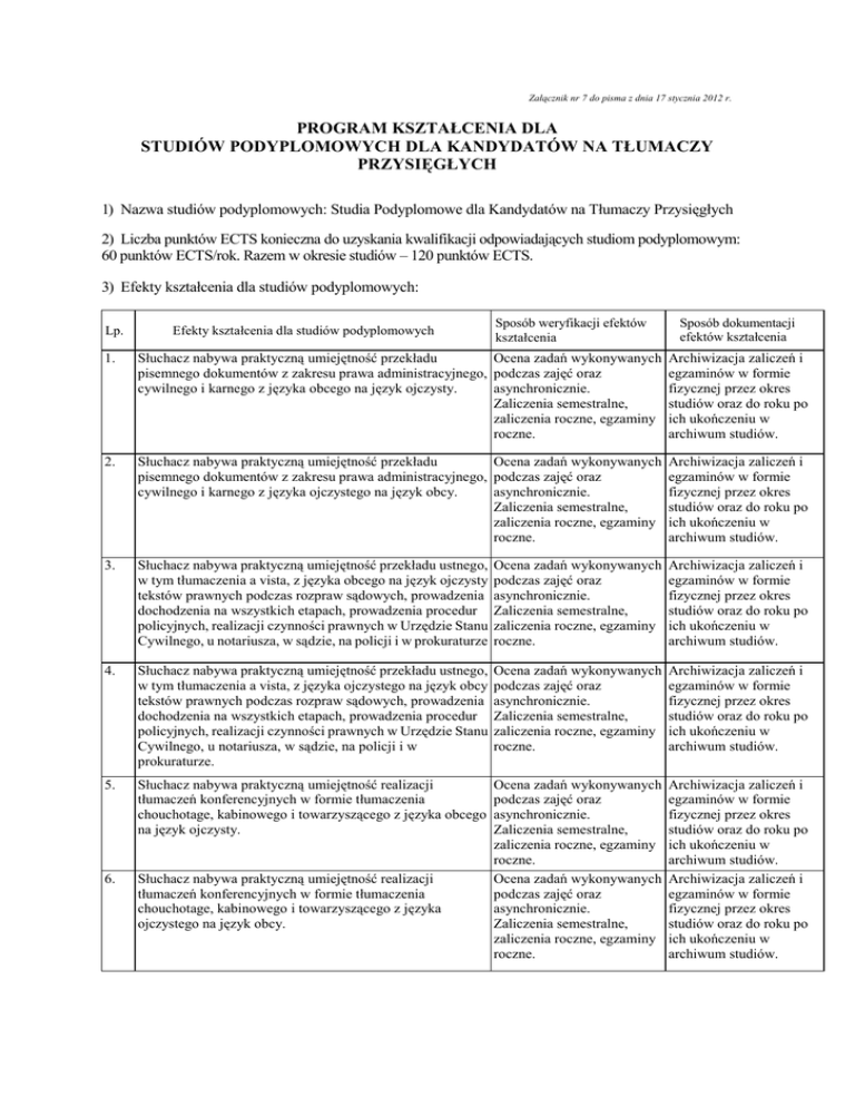 Załącznik nr 7 do pisma z dnia 17 stycznia 2012 r. PROGRAM KSZTAŁCENIA DLA STUDIÓW PODYPLOMOWYCH DLA KANDYDATÓW NA TŁUMACZY PRZYSIĘGŁYCH 1) Nazwa studiów podyplomowych: Studia Podyplomowe dla Kandydatów na Tłumaczy Przysięgłych 2) Liczba punktów ECTS konieczna do uzyskania kwalifikacji odpowiadających studiom podyplomowym: 60 punktów ECTS/rok. Razem w okresie studiów – 120 punktów ECTS. 3) Efekty kształcenia dla studiów podyplomowych: Lp. Efekty kształcenia dla studiów podyplomowych Sposób weryfikacji efektów kształcenia Sposób dokumentacji efektów kształcenia 1. Słuchacz nabywa praktyczną umiejętność przekładu Ocena zadań wykonywanych pisemnego dokumentów z zakresu prawa administracyjnego, podczas zajęć oraz cywilnego i karnego z języka obcego na język ojczysty. asynchronicznie. Zaliczenia semestralne, zaliczenia roczne, egzaminy roczne. Archiwizacja zaliczeń i egzaminów w formie fizycznej przez okres studiów oraz do roku po ich ukończeniu w archiwum studiów. 2. Słuchacz nabywa praktyczną umiejętność przekładu Ocena zadań wykonywanych pisemnego dokumentów z zakresu prawa administracyjnego, podczas zajęć oraz cywilnego i karnego z języka ojczystego na język obcy. asynchronicznie. Zaliczenia semestralne, zaliczenia roczne, egzaminy roczne. Archiwizacja zaliczeń i egzaminów w formie fizycznej przez okres studiów oraz do roku po ich ukończeniu w archiwum studiów. 3. Słuchacz nabywa praktyczną umiejętność przekładu ustnego, w tym tłumaczenia a vista, z języka obcego na język ojczysty tekstów prawnych podczas rozpraw sądowych, prowadzenia dochodzenia na wszystkich etapach, prowadzenia procedur policyjnych, realizacji czynności prawnych w Urzędzie Stanu Cywilnego, u notariusza, w sądzie, na policji i w prokuraturze Ocena zadań wykonywanych podczas zajęć oraz asynchronicznie. Zaliczenia semestralne, zaliczenia roczne, egzaminy roczne. Archiwizacja zaliczeń i egzaminów w formie fizycznej przez okres studiów oraz do roku po ich ukończeniu w archiwum studiów. 4. Słuchacz nabywa praktyczną umiejętność przekładu ustnego, w tym tłumaczenia a vista, z języka ojczystego na język obcy tekstów prawnych podczas rozpraw sądowych, prowadzenia dochodzenia na wszystkich etapach, prowadzenia procedur policyjnych, realizacji czynności prawnych w Urzędzie Stanu Cywilnego, u notariusza, w sądzie, na policji i w prokuraturze. Ocena zadań wykonywanych podczas zajęć oraz asynchronicznie. Zaliczenia semestralne, zaliczenia roczne, egzaminy roczne. Archiwizacja zaliczeń i egzaminów w formie fizycznej przez okres studiów oraz do roku po ich ukończeniu w archiwum studiów. 5. Słuchacz nabywa praktyczną umiejętność realizacji tłumaczeń konferencyjnych w formie tłumaczenia chouchotage, kabinowego i towarzyszącego z języka obcego na język ojczysty. 6. Słuchacz nabywa praktyczną umiejętność realizacji tłumaczeń konferencyjnych w formie tłumaczenia chouchotage, kabinowego i towarzyszącego z języka ojczystego na język obcy. Ocena zadań wykonywanych podczas zajęć oraz asynchronicznie. Zaliczenia semestralne, zaliczenia roczne, egzaminy roczne. Ocena zadań wykonywanych podczas zajęć oraz asynchronicznie. Zaliczenia semestralne, zaliczenia roczne, egzaminy roczne. Archiwizacja zaliczeń i egzaminów w formie fizycznej przez okres studiów oraz do roku po ich ukończeniu w archiwum studiów. Archiwizacja zaliczeń i egzaminów w formie fizycznej przez okres studiów oraz do roku po ich ukończeniu w archiwum studiów. Ocena zadań wykonywanych podczas zajęć oraz asynchronicznie. Zaliczenia semestralne, zaliczenia roczne, egzaminy roczne. Słuchacz zdobywa wiedzę teoretyczną z zakresu narzędzi Ocena zadań wykonywanych komputerowych wspomagających przekład tekstu. Słuchacz podczas zajęć oraz potrafi wykorzystać praktycznie technologie tłumaczenia asynchronicznie. maszynowego oraz pamięci tłumaczeniowych. Słuchacz Zaliczenia semestralne, potrafi wykorzystywać oprogramowania komputerowe pod zaliczenia roczne, egzaminy kątem pracy tłumacza (oprogramowanie biurowe). roczne. Słuchacz zdobywa wiedzę z zakresu polskiego systemu Ocena zadań wykonywanych prawnego. Słuchacz zdobywa wiedzę o głównych podczas zajęć oraz instytucjach polskiego prawa cywilnego materialnego i asynchronicznie. procesowego oraz prawa karnego materialnego i Zaliczenia semestralne, procesowego. zaliczenia roczne, egzaminy roczne. Archiwizacja zaliczeń i egzaminów w formie fizycznej przez okres studiów oraz do roku po ich ukończeniu w archiwum studiów. Archiwizacja zaliczeń i egzaminów w formie fizycznej przez okres studiów oraz do roku po ich ukończeniu w archiwum studiów. Archiwizacja zaliczeń i egzaminów w formie fizycznej przez okres studiów oraz do roku po ich ukończeniu w archiwum studiów. 10. Słuchacz zdobywa wiedzę z zakresu obcych systemów prawnych. Słuchacz zdobywa wiedzę o głównych instytucjach obcego prawa cywilnego materialnego i procesowego oraz prawa karnego materialnego i procesowego. Ocena zadań wykonywanych podczas zajęć oraz asynchronicznie. Zaliczenia semestralne, zaliczenia roczne, egzaminy roczne. Archiwizacja zaliczeń i egzaminów w formie fizycznej przez okres studiów oraz do roku po ich ukończeniu w archiwum studiów. 11. Słuchacz zdobywa wiedzę o podstawowych zagadnieniach z zakresu prawoznawstwa, głównych instytucji prawnych, historii i rozwoju systemów prawnych. Słuchacz zdobywa wiedzę na temat ustroju państwowego oraz podstawowych zagadnień prawa administracyjnego. 12. Słuchacz ćwiczy kompetencje w zakresie języka polskiego poprzez analizę najczęściej popełnianych przez tłumaczy błędów stylistycznych, gramatycznych i interpunkcyjnych 13. Słuchacz poznaje sztukę przemawiania publicznego, podstawowe techniki tłumaczenia ustnego. Słuchacz zdobywa wiedzę w zakresie podstawowych zasad i systemów prowadzenia notacji w tłumaczeniu k