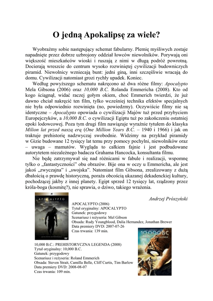 O jedną Apokalipsę za wiele? Wyobraźmy sobie następujący schemat fabularny. Plemię myśliwych zostaje napadnięte przez dobrze uzbrojony oddział łowców niewolników. Porywają oni większość mieszkańców wioski i ruszają z nimi w długą podróŜ powrotną. Docierają wreszcie do centrum wysoko rozwiniętej cywilizacji budowniczych piramid. Niewolnicy wzniecają bunt: jedni giną, inni szczęśliwie wracają do domu. Cywilizacji natomiast grozi rychły upadek. Koniec. Według powyŜszego schematu nakręcono aŜ dwa róŜne filmy: Apocalypto Mela Gibsona (2006) oraz 10,000 B.C. Rolanda Emmericha (2008). Kto od kogo ściągnął, widać raczej gołym okiem, choć Emmerich twierdzi, Ŝe juŜ dawno chciał nakręcić ten film, tylko wcześniej technika efektów specjalnych nie była odpowiednio rozwinięta (no, powiedzmy). Oczywiście filmy nie są identyczne – Apocalypto opowiada o cywilizacji Majów tuŜ przed przybyciem Europejczyków, a 10,000 B.C. o cywilizacji Egiptu tuŜ po zakończeniu ostatniej epoki lodowcowej. Poza tym drugi film nawiązuje wyraźnie tytułem do klasyka Milion lat przed naszą erą (One Million Years B.C. – 1940 i 1966) i jak on traktuje prehistorię nadzwyczaj swobodnie. Widzimy na przykład piramidy w Gizie budowane 12 tysięcy lat temu przy pomocy pochylni, niewolników oraz – uwaga – mamutów. Wygląda to całkiem fajnie i jest podbudowane autorytetem niezaleŜnego badacza Grahama Hancocka, konsultanta filmu. Nie będę zatrzymywał się nad róŜnicami w fabule i realizacji, wspomnę tylko o „fantastyczności” obu obrazów. Bije ona w oczy u Emmericha, ale jest jakoś „zwyczajna” i „swojska”. Natomiast film Gibsona, zrealizowany z duŜą dbałością o prawdę historyczną, poraŜa obcością ukazanej dekadenckiej kultury, pochodzącej jakby z innej planety. Egipt sprzed 12 tysięcy lat, rządzony przez króla-boga (kosmitę?), nie sprawia, o dziwo, takiego wraŜenia. Andrzej Prószyński APOCALYPTO (2006) Tytuł oryginalny: APOCALYPTO Gatunek: przygodowy Scenariusz i reŜyseria: Mel Gibson Obsada: Rudy Youngblood, Dalia Hernandez, Jonathan Brewer Data premiery DVD: 2007-07-26 Czas trwania: 139 min. 10,000 B.C.: PREHISTORYCZNA LEGENDA (2008) Tytuł oryginalny: 10,000 B.C. Gatunek: przygodowy Scenariusz i reŜyseria: Roland Emmerich Obsada: Steven Strait, Camilla Belle, Cliff Curtis, Tim Barlow Data premiery DVD: 2008-08-07 Czas trwania: 109 min.