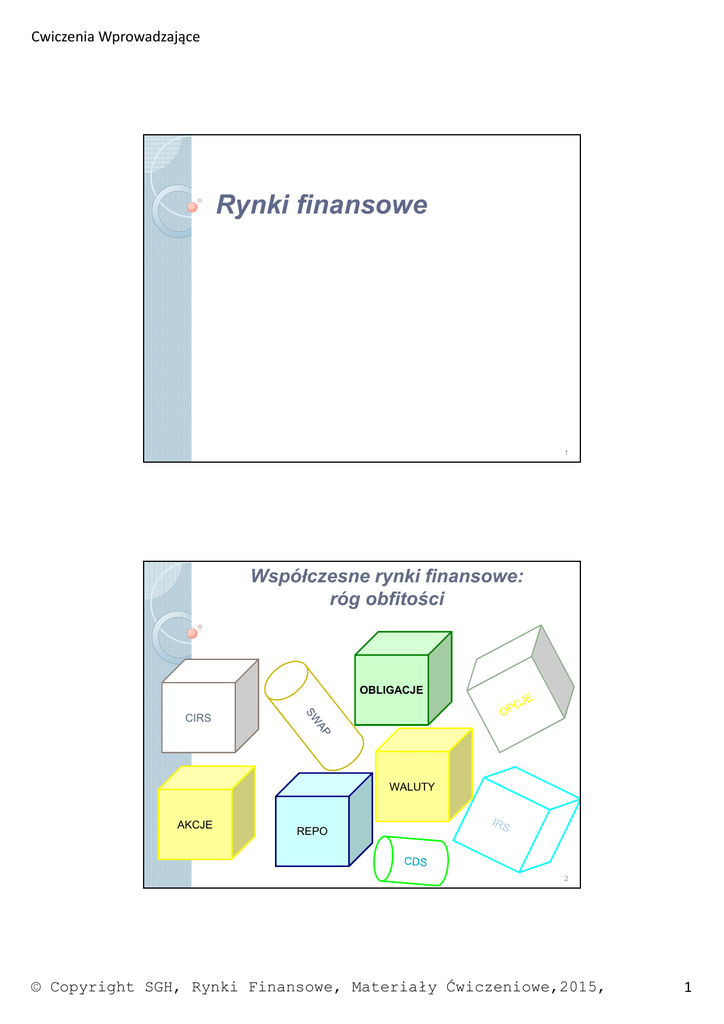 Cwiczenia Wprowadzające Rynki finansowe 1 Współczesne rynki finansowe: róg obfitości OBLIGACJE CIRS WALUTY AKCJE REPO 2 © Copyright SGH, Rynki Finansowe, Materiały Ćwiczeniowe,2015, 1 Cwiczenia Wprowadzające Program Ćwiczeń Bloki tematyczne Rynek terminowy Rynek pieniężny Swapy: IRS i CIRS Opcje Pochodne Kredytowe Materiały: www.rynkifinansowe.pl Zaliczenie – wspólne dla wykładu i ćwiczeń (test) 3 Kontakt: [email protected] Dzisiejsze zajęcia – wspólny język Miejsce pochodnych w systemie finansowym Wartość pieniądza w czasie – klucz do wyceny Podstawowe pojęcia rynku stopy procentowej ◦ ◦ ◦ krzywa dochodowości obligacje, rentowność, duration, bpv WIBOR, Polonia, podstawy kwotowań Podstawowe pojęcia rynku walutowego ◦ ◦ ◦ Spekulacja, a arbitraż Pozycja walutowa Kwotowania na rynku walutowym 4 © Copyright SGH, Rynki Finansowe, Materiały Ćwiczeniowe,2015, 2 Cwiczenia Wprowadzające Pochodne w systemie finansowym 5 Elementy systemu finansowego (1) Rynkowy system finansowy tworzą: Rynki na których dokonuje się transakcji instrumentami finansowymi: rynek pieniężny, rynek kapitałowy, rynek walutowy, rynek instrumentów pochodnych. Instytucje finansowe operujące na rynkach finansowych: banki (uniwersalne, inwestycyjne, spółdzielcze) i instytucje parabankowe (np. SKOK-i), instytucje wspólnego inwestowania – fundusze inwestycyjne, fundusze emerytalne, zakłady ubezpieczeń (majątkowych i na życie), firmy inwestycyjne (domy i biura maklerskie), 6 © Copyright SGH, Rynki Finansowe, Materiały Ćwiczeniowe,2015, 3 Cwiczenia Wprowadzające Elementy systemu finansowego (2) firmy leasiangowe i firmy faktoringowe, fundusze private equity, hedge funds i sovereign wealth funds. Infrastruktura oraz regulacje i zasady dotyczące rynków i instytucji finansowych: systemy płatnicze (wysokokwotowe, detaliczne), giełdy i platformy obrotu instrumentami finansowymi, depozyty papierów wartościowych i izby rozliczeniowe (CCP), systemy gwarancyjne (np. BFG, UFG), agencje ratingowe i biura informacji kredytowej, nadzór finansowy, regulacje ostrożnościowe, prawo / regulacje krajowe i międzynarodowe (UE), regulaminy, kodeksy, zasady dobrych praktyk (…) 7 Transakcje (instrumenty) pochodne Klasyfikacja finansowych instrumentów pochodnych Finansowe instrumenty pochodne Podział wg rodzajów transakcji – transakcje terminowe (futures i forward) – transakcje zamiany (tzw. swapy) – opcje – kombinacje wyżej wymienionych Podział wg rodzaju instrumentu bazowego Podział wg sposobu rozliczenia transakcji – rozliczane poprzez fizyczną dostawę instrumentu bazowego – rozliczane różnicowo – walutowe instrumenty Podział wg sposobu pochodne organizacji handlu – instrumenty pochodne na stopy procentowe – giełdowe instrumenty – instrumenty pochodne, pochodne których wartość jest – pozagiełdowe uzależniona od cen akcji instrumenty – kredytowe instrumenty pochodne (OTC) pochodne – instrumenty pochodne, których wartość jest uzależniona od cen metali szlachetnych Źródło: opracowanie własne. 8 © Copyright SGH, Rynki Finansowe, Materiały Ćwiczeniowe,2015, 4 Cwiczenia Wprowadzające Po co na rynek instrumentów pochodnych? Umożliwiają zabezpieczanie się przed ryzykiem finansowym (ang. hedging). Są wykorzystywane do spekulacji na rynkach finansowych (efekt dźwigni finansowej): • spekulacja stabilizująca • spekulacja destabilizująca Zwiększenie możliwości arbitrażu. Inwestowanie. 9 Inne zastosowania instrumentów pochodnych Stwarzają możliwość większego wyboru rodzaju podejmowanego ryzyka finansowego. Znacznie ułatwiają dywersyfikację aktywów. Umożliwiają lokowanie środków na wielu rynkach zagranicznych przy ograniczaniu ryzyka walutowego. Banki mogą transferować ryzyko kredytowe, a uwolnione w ten sposób kapitały pozwalają na podejmowanie dalszej akcji kredytowej. Umożliwiają obniżenie kosztów finansowania na tradycyjnym rynku finansowym. Płynne rynki instrumentów pochodnych dostarczają informacji o oczekiwaniach ich uczestników cen instrumentów bazowych itd. 10 © Copyright SGH, Rynki Finansowe, Materiały Ćwiczeniowe,2015, 5 Cwiczenia Wprowadzające Wartość pieniądza w czasie 11 Wartość pieniądza w czasie (1) Ile jest warte dziś 100 złotych otrzymane w przyszłości? 100 80 po roku 60 po 2 latach 40 po 5 latach po 10 latach 20 0 1% 3% 5% 7% 9% 11% 13% 15% 17% 19% 12 © Copyright SGH, Rynki Finansowe, Materiały Ćwiczeniowe,2015, 6 Cwiczenia Wprowadzające Wartość pieniądza w czasie (2) Wartość pieniądza w czasie maleje: • 100 zł otrzymane za rok jest dziś warte mniej niż 100 zł otrzymane jutro Malejąca wartość pieniądza w czasie jest wyrażona przez stopy procentowe, które stanowią cenę pieniądza: • oprocentowanie „wyrównuje” ubytek wartości pieniądza wynikający z upływu czasu Wartość przyszłych przepływów pieniężnych zazwyczaj maleje w rosnącym tempie • zarówno ryzyko, jak i koszt alternatywny rosną w tempie nieliniowym, coraz szybciej dla coraz odleglejszych terminów oraz coraz większych kwot, m.in. z uwagi na możliwość reinwestycji odsetek 13 Wartość pieniądza w czasie (3) Źródła malejącej wartości pieniądza w czasie: • ryzyko (pożyczający kapitał nie wie, czy otrzyma go z powrotem – im większa premia za to ryzyko, tym szybciej maleje wartość pieniądza w czasie) • koszt alternatywny (pożyczający kapitał na określony termin musi ograniczyć częściowo konsumpcję oraz inne inwestycje – odsetki stanowią formę rekompensaty za to wyrzeczenie) • inflacja (zwykle dodatnie tempo zmian cen w gospodarce sprawia, że dziś można za określoną kwotę nabyć więcej dóbr niż w przyszłości) 14 © Copyright SGH, Rynki Finansowe, Materiały Ćwiczeniowe,2015, 7 Cwiczenia Wprowadzające Wartość pieniądza w czasie (4) Kapitalizacja zapewnia porównywalność wartości pieniężnych określonyc