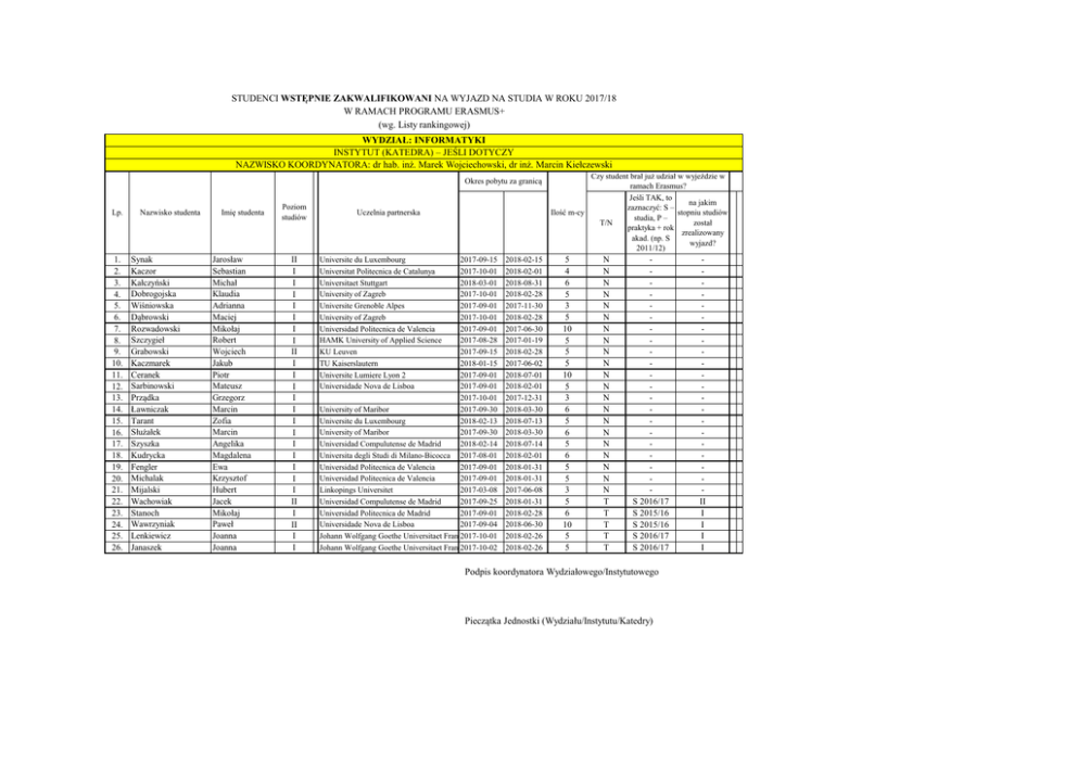 STUDENCI WSTĘPNIE ZAKWALIFIKOWANI NA WYJAZD NA STUDIA W ROKU 2017/18 W RAMACH PROGRAMU ERASMUS+ (wg. Listy rankingowej) WYDZIAŁ: INFORMATYKI INSTYTUT (KATEDRA) – JEŚLI DOTYCZY NAZWISKO KOORDYNATORA: dr hab. inż. Marek Wojciechowski, dr inż. Marcin Kiełczewski Okres pobytu za granicą Lp. 1. 2. 3. 4. 5. 6. 7. 8. 9. 10. 11. 12. 13. 14. 15. 16. 17. 18. 19. 20. 21. 22. 23. 24. 25. 26. Nazwisko studenta Synak Kaczor Kałczyński Dobrogojska Wiśniowska Dąbrowski Rozwadowski Szczygieł Grabowski Kaczmarek Ceranek Sarbinowski Prządka Ławniczak Tarant Służałek Szyszka Kudrycka Fengler Michalak Mijalski Wachowiak Stanoch Wawrzyniak Lenkiewicz Janaszek Imię studenta Jarosław Sebastian Michał Klaudia Adrianna Maciej Mikołaj Robert Wojciech Jakub Piotr Mateusz Grzegorz Marcin Zofia Marcin Angelika Magdalena Ewa Krzysztof Hubert Jacek Mikołaj Paweł Joanna Joanna Poziom studiów II I I I I I I I II I I I I I I I I I I I I II I II I I Uczelnia partnerska Universite du Luxembourg Universitat Politecnica de Catalunya Universitaet Stuttgart University of Zagreb Universite Grenoble Alpes University of Zagreb Universidad Politecnica de Valencia HAMK University of Applied Science KU Leuven TU Kaiserslautern Universite Lumiere Lyon 2 Universidade Nova de Lisboa 2017-09-15 2017-10-01 2018-03-01 2017-10-01 2017-09-01 2017-10-01 2017-09-01 2017-08-28 2017-09-15 2018-01-15 2017-09-01 2017-09-01 2017-10-01 University of Maribor 2017-09-30 Universite du Luxembourg 2018-02-13 University of Maribor 2017-09-30 Universidad Compulutense de Madrid 2018-02-14 Universita degli Studi di Milano-Bicocca 2017-08-01 Universidad Politecnica de Valencia 2017-09-01 Universidad Politecnica de Valencia 2017-09-01 Linkopings Universitet 2017-03-08 Universidad Compulutense de Madrid 2017-09-25 Universidad Politecnica de Madrid 2017-09-01 Universidade Nova de Lisboa 2017-09-04 Johann Wolfgang Goethe Universitaet Frankfurt 2017-10-01 Johann Wolfgang Goethe Universitaet Frankfurt 2017-10-02 2018-02-15 2018-02-01 2018-08-31 2018-02-28 2017-11-30 2018-02-28 2017-06-30 2017-01-19 2018-02-28 2017-06-02 2018-07-01 2018-02-01 2017-12-31 2018-03-30 2018-07-13 2018-03-30 2018-07-14 2018-02-01 2018-01-31 2018-01-31 2017-06-08 2018-01-31 2018-02-28 2018-06-30 2018-02-26 2018-02-26 Czy student brał już udział w wyjeździe w ramach Erasmus? Jeśli TAK, to na jakim zaznaczyć: S – Ilość m-cy stopniu studiów studia, P – T/N został praktyka + rok zrealizowany akad. (np. S wyjazd? 2011/12) 5 4 6 5 3 5 10 5 5 5 10 5 3 6 5 6 5 6 5 5 3 5 6 10 5 5 N N N N N N N N N N N N N N N N N N N N N T T T T T S 2016/17 S 2015/16 S 2015/16 S 2016/17 S 2016/17 Podpis koordynatora Wydziałowego/Instytutowego Pieczątka Jednostki (Wydziału/Instytutu/Katedry) II I I I I