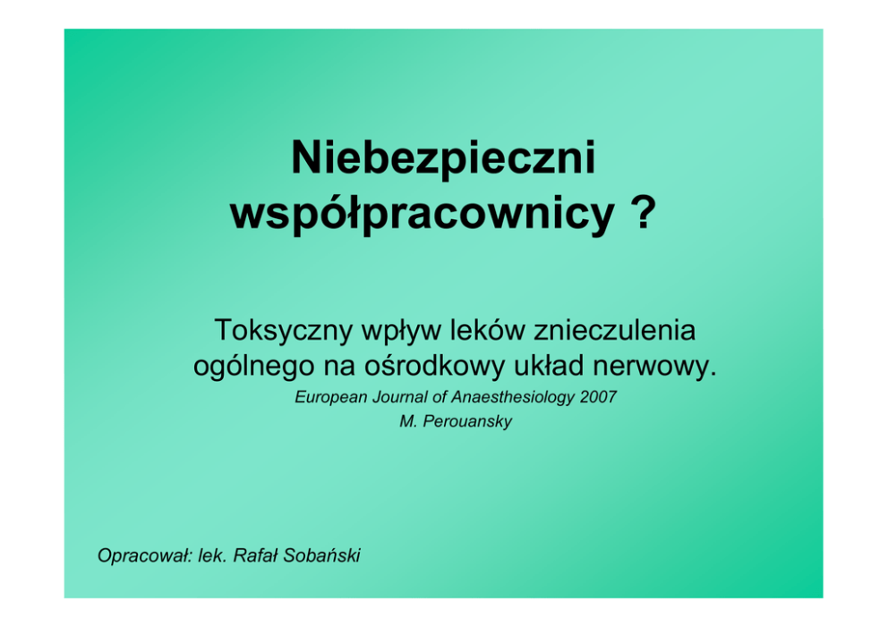 Niebezpieczni współpracownicy ? Toksyczny wpływ leków znieczulenia ogólnego na ośrodkowy układ nerwowy. European Journal of Anaesthesiology 2007 M. Perouansky Opracował: lek. Rafał Sobański Toksyczne działanie anestetyków na ośrodkowy układ nerwowy: Najlepiej uchwytne w ekstremalnych przedziałach wiekowych. Okres noworodkowy – intensywna synaptogeneza indukowanie nadmiernej apoptozy- pogorszenie zdolności uczenia się w wieku późniejszym. Wiek podeszły - przyspieszenie procesów neurodegeneracyjnych, zaburzenia funkcji poznawczych i pogorszenie pamięci. Trwałość zmian zaistniałych pod wpływem anestetyków: Wycofują się po eliminacji anestetyku np. supresja układu immunologicznego. Przetrwałe pomimo eliminacji anestetyku np. rozprzestrzenienie komórek nowotworowych, betaoligomeryzacja białek. Nieodwracalne, np. apoptoza komórek nerwowych, punktowe zmiany w genomie człowieka. Powstaje nowy organizm. Badanie Fuetterera: Znieczulenie szczurów 5,7% desfluranem przez 3 godz. Badanie składu homogenatu białkowego z mózgu bezpośrednio po znieczuleniu, po 24 godz., po 72 godz. I porównywanie ze szczurami nie poddanymi znieczuleniu. Stwierdzono, że zmiana liczby wykrytych białek wahała się od spadku o 60% do wzrostu o 179%. Wniosek: anestezja nie jest całkowicie odwracalnym procesem. Możliwe niespodziewane korzyści, np. kardioprotekcja dzięki zmianom w proteomie miokardium. Badanie Eckenhoffa Potwierdzenie teorii mechanizmów zachodzących w chorobach neurodegeneracyjnych, np. w chorobie Alzheimera (AD): Niekontrolowana oligomeryzacja (mikroagregacja) białka amyloid Beta (AB) prowadząca do zmiany struktury drugorzędowej i wytrącania złogów tego białka. Złogi AB są neurotoksyczne, blokują na poziomie komórkowym procesy uczenia się i procesy pamięciowe. Anestetyki: molekularne katalizatory neurodegeneracji. C.D. Bad. Eckenhoffa : Badanie wpływu anestetyków (halotan lub isofluran w ilości 3 MAC) na wolną od komórek zawiesinę białkową: znaczące przyspieszenie oligomeryzacji AB. Propofol i alkohol etylowy w małych stężeniach powodowały inhibicję oligomeryzacji, natomiast wzmagały oligomeryzację w dużych stężeniach. Wzmożona oligomeryzacja po halotanie wykryta nawet 3 doby po ekspozycji. C.D. Bad. Eckenhoffa : Druga faza: badanie wpływu kombinacji oligomer AB i anestetyku (1 MAC) na komórki pheochromocytoma szczurów (używane jako model komórek nerwowych). Toksyczność mierzona poziomem wydzielanej dehydrogenazy mleczanowej (LDH). Brak toksyczności w obecności samych anestetyków. Wyższa toksyczność w obecności AB. Najwyższą toksyczność zanotowano w obecności anestetyku i AB. Brak toksyczności Propofolu i Etanolu. Zanotowano powstanie punktowych mutacji, które uczyniły badane komórki bardziej wrażliwe na toksyczne działanie izofluranu. POCD (Post operative cognitive dysfunction) Pooperacyjne zaburzenia funkcji poznawczych Jednostka chorobowa obecna u pacjentów w wieku podeszłym związana z przyspieszeniem procesów neurodegeneracyjnych. MCI ( Mild Cognitive Impairment )- łagodne zaburzenia poznawcze - poprzedzają POCD. Udowodniono, że te zespoły chorobowe są związane z działaniem anestetyków, ale niepełne są badania nad wpływem hipoglikemii i hipotensji. Badanie Crosbyego : Ocena wpływu anestezji: 1,2% Isofluranu, 70% N2O, 30% O2 przez 2 godz. na przestrzenną orientację szczurów w różnym wieku. Starsze szczury gorzej przypominały sobie informacje. Efekt zanikał 8 tygodni po anestezji. Łatwiej zaburzyć procesy uczenia się: upośledzenie w każdym wieku nawet po 2 tygodniach od anestezji. FIZJOLOGIA : Transmitery pobudzające: Ach, adenozyna, aminy (dopamina, noradrenalina, serotonina), aminokwasy (sole kwasu asparaginowego i glutaminowego). Aminokwasy pobudzające (75% pobudzającej transmisji w mózgowiu) działają za pośrednictwem receptorów metabolitotropowych i jonotropowych (rec.AMPA, NMDA, Kainianowe). Transmiter hamujący to kwas gamma-aminomasłowy GABA, wiąże się z receptorami GABA a i b. Neurotoksyczność anestetyków dla rozwijającego się mózgu: Anestetyki zmieniają stężenie receptorów: zwiększają GABA, a zmniejszają NMDA. W rozwijającym się mózgu (szczególnie w okresie synaptogenezy) blokada rec. NMDA powoduje nadmierną apoptozę neuronów. W okresie rozwoju niedostatecznie stymulowane i nadmiernie blokowane neurony skazane są podwójnie na apoptozę. Pod tym względem etanol działa identycznie jak anestetyki. Badanie Jevtowica-Todorovica : Znieczulenie: midazolamem, isofluranem i N2O nowonarodzonych szczurów. Ocena trzech grup: histopatologiczna, rozwoju dorosłych osobników, elektrofizjologiczna mózgu (głównie hipokampa). Isofluran-zależny od dawki efekt apoptozy. Brak efektu w przypadku midazolamu i N2O podawanych osobno. Większy efekt dla iso.+ midazolam, największy efekt przy użyciu trzech leków. Po użyciu trzech leków największe zaburzenia synaptogenezy, co miało odzwierciedlenie w deficytach zdolności uczenia się i pamięci przestrzennej u dorosłych szczurów. Chirurgia idealna, pozbawiona stresu, może być trudniejsza do osiągnięcia niż nam się wydaje, szczególnie dla najbardziej bezbronnych pacjentów . M. Perouansky