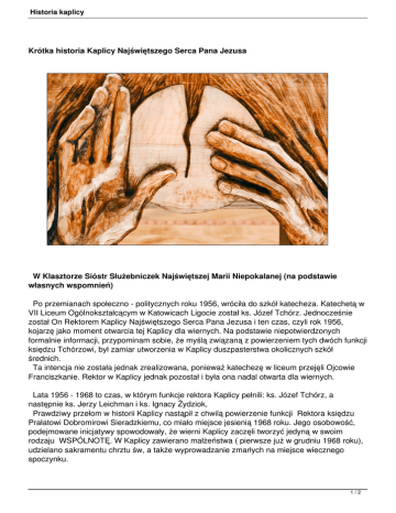 Historia kaplicy Krótka historia Kaplicy Najświętszego Serca Pana Jezusa W Klasztorze Sióstr Służebniczek Najświętszej Marii Niepokalanej (na podstawie własnych wspomnień) Po przemianach społeczno - politycznych roku 1956, wróciła do szkół katecheza. Katechetą w VII Liceum Ogólnokształcącym w Katowicach Ligocie został ks. Józef Tchórz. Jednocześnie został On Rektorem Kaplicy Najświętszego Serca Pana Jezusa i ten czas, czyli rok 1956, kojarzę jako moment otwarcia tej Kaplicy dla wiernych. Na podstawie niepotwierdzonych formalnie informacji, przypominam sobie, że myślą związaną z powierzeniem tych dwóch funkcji księdzu Tchórzowi, był zamiar utworzenia w Kaplicy duszpasterstwa okolicznych szkół średnich. Ta intencja nie została jednak zrealizowana, ponieważ katechezę w liceum przejęli Ojcowie Franciszkanie. Rektor w Kaplicy jednak pozostał i była ona nadal otwarta dla wiernych. Lata 1956 - 1968 to czas, w którym funkcje rektora Kaplicy pełnili: ks. Józef Tchórz, a następnie ks. Jerzy Leichman i ks. Ignacy Żydziok, Prawdziwy przełom w historii Kaplicy nastąpił z chwilą powierzenie funkcji Rektora księdzu Prałatowi Dobromirowi Sieradzkiemu, co miało miejsce jesienią 1968 roku. Jego osobowość, podejmowane inicjatywy spowodowały, że wierni Kaplicy zaczęli tworzyć jedyną w swoim rodzaju WSPÓLNOTĘ. W Kaplicy zawierano małżeństwa ( pierwsze już w grudniu 1968 roku), udzielano sakramentu chrztu św, a także wyprowadzanie zmarłych na miejsce wiecznego spoczynku. 1/2 Historia kaplicy Kaplica nigdy nie miała problemów z naborem ministrantów, którzy byli dziećmi jej wiernych, a służbę zaczynali w wieku 5 , 6 lat. Ministrantami pozostawali do wieku dojrzałego, a zdarzało się, że przy ołtarzu spotykały się dwa pokolenia. Do Kaplicy wiernych przyciągały wspaniałe kazania ks. Prałata, a także prowadzone przez Niego spotkania mające na celu pogłębienie wiedzy religijnej i wiary. Tam też powstały zalążki duszpasterstwa akademickiego w Ligocie, które zaczęło w Kaplicy działać jeszcze przed FODĄ, a potem funkcjonowało równolegle. Początkowo duszpasterstwo to prowadził ks. Prałat, a następnie księża rekolekcjoniści Domu Rekolekcyjnego Sióstr, kolejno: śp. Ks. Engelbert Ramola i ks. Wojciech Zygmunt. Dynamiczny rozwój FODY spowodował naturalne wygaśnięcie duszpasterstwa w Kaplicy. 20 lat temu w Kaplicy powstała nowa służba liturgiczna i nowa mała wspólnota – szafarze nadzwyczajni komunii świętej. I tyle historii ponad 50 - ciu lat, w telegraficznym skrócie. Dzisiaj, po śmierci ks. Prałata, my, wierni Kaplicy i nasz nowy duszpasterz ks. Jacek Błaszczok, piszemy dalszy ciąg tej historii. Wojciech Gosiewski 2/2