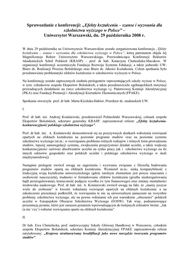 Sprawozdanie z konferencji: „Efekty kształcenia – szanse i wyzwania dla szkolnictwa wyŜszego w Polsce” – Uniwersytet Warszawski, dn. 29 października 2008 r. W dniu 29 października na Uniwersytecie Warszawskim została zorganizowana konferencja „Efekty kształcenia – szanse i wyzwania dla szkolnictwa wyŜszego w Polsce”, którą patronatem objęła Jej Magnificencja Rektor Uniwersytetu Warszawskiego, Przewodnicząca Konferencji Rektorów Akademickich Szkół Polskich (KRASP) – prof. dr hab. Katarzyna Chałasińska-Macukow. W organizacji konferencji uczestniczyła Fundacja Rozwoju Systemu Edukacji, a takŜe jednostki UW: Biuro ds. Realizacji Procesu Bolońskiego oraz Biuro ds. Jakości Kształcenia. Celem spotkania było przedstawienie problematyki efektów kształcenia w szkolnictwie wyŜszym w Polsce. Na konferencję zostało zaproszonych siedmiu prelegentów reprezentujących szkoły wyŜsze w Polsce, w tym: członkowie zespołu Ekspertów Bolońskich, a takŜe przedstawiciele ogólnopolskich instytucji prowadzących działalność na rzecz szkolnictwa wyŜszego t.j. Państwowej Komisji Akredytacyjnej (PKA) oraz Fundacji Promocji i Akredytacji Kierunków Ekonomicznych (FPAKE). Spotkanie otworzyła prof. dr hab. Marta Kicińska-Habior, Prorektor ds. studenckich UW. I. Prof. dr hab. inŜ. Andrzej Kraśniewski, przedstawiciel Politechniki Warszawskiej, członek zespołu Ekspertów Bolońskich, sekretarz generalny KRASP. zaprezentował referat: „Efekty kształceniakonkurencyjność polskiego szkolnictwa wyŜszego”. Prof. dr hab. inŜ. A. Kraśniewski skoncentrował się na pozytywnych skutkach wdroŜenia rozwiązań opartych na efektach kształcenia na poziomie programu studiów oraz na poziomie systemu szkolnictwa wyŜszego (m.in.: w rozwiązaniu problemu róŜnych rodzajów i róŜnych form prowadzenia studiów, lepszej samoregulacji systemu, zwiększeniu przejrzystości działań uczelni, a takŜe większej konkurencyjności zarówno absolwentów uczelni na rynku pracy jak i szkolnictwa wyŜszego na tle innych sektorów gospodarki oraz polskich uczelni i polskiego szkolnictwa wyŜszego w skali międzynarodowej). Następnie prelegent zwrócił uwagę na zagroŜenia i wyzwania związane z filozofią budowania programów studiów opartą na efektach kształcenia. Wymienił m.in.: niską kompatybilność z tradycyjną wizją kształcenia uniwersyteckiego (gdzie istotnym elementem jest proces nauczania i osobowość nauczyciela), trudności w formułowaniu efektów kształcenia (groźba niedoregulowania bądź przeregulowania), konieczność podjęcia wysiłku (w tym finansowego) oraz zmiany mentalności środowiska naukowego. Prof. dr hab. inŜ. A. Kraśniewski zwrócił uwagę na fakt, Ŝe „mamy jeszcze wiele do zrobienia” w kwestii wdraŜania rozwiązań opartych na efektach kształcenia; a na zakończenie prezentacji podkreślił, Ŝe rozwiązania te nie są uniwersalnym panaceum na wszystkie problemy szkolnictwa wyŜszego, ale na pewno wdraŜanie ich jest warunkiem „obecności” polskich uczelni w Europejskim Obszarze Szkolnictwa WyŜszego (EOSW). Tak więc, podsumowujące prezentację pytanie, które jest zarazem pytaniem wprowadzającym do kolejnych referatów brzmi: „Jak (a nie ‘czy’) wdraŜać rozwiązania oparte na efektach kształcenia”. II. Dr hab. Ewa Chmielecka, prof. nadzwyczajny Szkoły Głównej Handlowej w Warszawie, członkini zespołu Ekspertów Bolońskich, sekretarz Komisji Akredytacyjnej FPAKE zaprezentowała referat zatytułowany: „Krajowa struktura/ramy kwalifikacji jako nowe narzędzie tworzenia programów studiów”. Prelegentka przedstawiła skutki wdroŜenia struktury/ram kwalifikacji dla EOSW (są to m.in.: międzynarodowa przejrzystość, międzynarodowe uznanie kwalifikacji absolwentów, międzynarodowa mobilność studentów i absolwentów), zwracając jednocześnie uwagę na fakt, Ŝe punktami odniesienia struktury kwalifikacji dla EOSW są generyczne efekty kształcenia, a nie programy (treści). Struktura kwalifikacji zapewnia zatem róŜnorodność oraz porównywalność kształcenia. W dalszej części referatu dr hab. Ewa Chmielecka zwróciła uwagę na oczekiwania względem struktury/ram kwalifikacji dla EOSW, a takŜe zaprezentowała podejścia do budowy krajowej struktury/ram kwalifikacji (m.in.: sprecyzowanie zamierzonych efektów kształcenia). Na zakończenie swojej prezentacji dr hab. E. Chmielecka zastanowiła się nad oczekiwaniami i propozycjami związanymi z krajową strukturą kwalifikacji w Polsce, a takŜe sprecyzowała problemy wdraŜania tejŜe struktury w Polsce. Jako najwaŜniejsze wymieniła działania dotyczące istniejących i potrzebnych aktów prawnych, koordynacji relacji pomiędzy strukturą bolońską a strukturą europejską, problem wprowadzenia deskryptorów (na poziomie krajowym czy europejskim), problem nowej terminologii oraz akceptacji zmian przez środowisko naukowe. III. Prof. dr hab. Danuta Strahl, wiceprzewodnicząca PKA, zaprezentowała referat zatytułowany: „Efekty kształcenia w świetle wymogów akredytacyjnych”. Prelegentka skoncentrowała się na obszarach oceny jakości kształcenia PKA oraz zwróciła uwagę na orientację PKA na zachowanie właściwych proporcji między oceną procesów a oceną efektów kształcenia. Jednocześnie, prof. dr hab. D. Strahl podkreśliła, Ŝe PKA w ocenie jakości procesu dydaktycznego zorientowana jest na efekty kształcenia i zwraca szczególną uwagę na: spójność misji uczelni, misji jednostki prowadzącej kierunek i misji kierunku; realizację tych elementów procesu dydaktycznego, które budują strukturę kwalifikacji absolwenta (deklarowana wiedza, umiejętności, postawy) oraz na relację pomiędzy wewnętrznym systemem jakości kształcenia (potencjał) a efektami kształcenia (rezultaty). Prof. dr hab. Danuta Strahl omówiła problem pomiaru efektów kształcenia. Poruszyła m.in. kwestie: zdefiniowania efektów proc