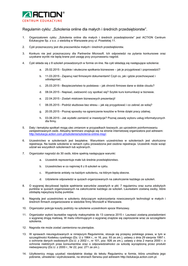 Regulamin cyklu: „Szkolenia online dla małych i średnich przedsiębiorstw”. 1. Organizatorem cyklu: „Szkolenia online dla małych i średnich przedsiębiorstw” jest ACTION Centrum Edukacyjne Sp. z o.o. z siedzibą w Warszawie przy ul. Poselskiej 11. 2. Cykl przeznaczony jest dla pracowników małych i średnich przedsiębiorstw. 3. Konkurs nie jest przeznaczony dla Partnerów Microsoft. Ich odpowiedzi na pytania konkursowe oraz uzyskane wyniki nie będą brane pod uwagę przy przyznawaniu nagród. 4. Cykl składa się z 8 szkoleń prowadzonych w formie on-line. Na cykl składają się następujące szkolenia: a. 25.02.2015 - Szybkie i skuteczne spotkania biznesowe – jak je przygotować i poprowadzić? b. 11.03.2015 - Zapanuj nad firmowymi dokumentami! Czyli co, jak i gdzie przechowywać i udostępniać. c. 25.03.2015 - Bezpieczeństwo to podstawa – jak chronić firmowe dane w dobie cloudu? d. 08.04.2015 - Napisać, zadzwonić czy spotkać się? Szybki kurs komunikacji w biznesie. e. 22.04.2015 - Zostań mistrzem biznesowych prezentacji! f. 06.05.2015 - Podróż służbowa bez stresu – jak się przygotować i co zabrać ze sobą? g. 20.05.2015 - Poznaj sposoby na ograniczenie kosztów w firmie dzięki pracy zdalnej. h. 03.06.2015 - Jak wydatki zamienić w inwestycje? Poznaj zasady wyboru usług informatycznych dla firmy. 5. Daty i tematyka spotkań mogą ulec zmianom w przypadkach losowych, po uprzednim poinformowaniu zarejestrowanych osób. Aktualny terminarz znajduje się na stronie internetowej organizatora pod adresem: http://edukacja.action.com.pl/szkolenia/szkolenia-online-msp/. 6. Uczestnictwo w szkoleniach jest bezpłatne. Warunkiem uczestnictwa w szkoleniach jest ukończona rejestracja. Na każde szkolenie w ramach cyklu prowadzona jest osobna rejestracja. Uczestnik może wziąć udział we wszystkich szkoleniach lub wybranych. 7. Organizator nagrodzi do 30 osób, które spełnią następujące warunki: a. Uczestnik reprezentuje małe lub średnie przedsiębiorstwo. b. Uczestnictwo w co najmniej 6 z 8 szkoleń w cyklu. c. Wypełnienie ankiety na każdym szkoleniu, na którym będą obecne. d. Udzielenie odpowiedzi w quizach organizowanych na zakończenie każdego ze szkoleń. 8. O wygranej decydować będzie spełnienie warunków zawartych w pkt. 7 regulaminu oraz suma zdobytych punktów w quizach organizowanych na zakończenie każdego ze szkoleń. Laureatami zostaną osoby, które zdobędą najwyższą liczbę punktów. 9. Nagrodą jest uczestnictwo w szkoleniu dotyczącym wykorzystania nowoczesnych technologii w małych i średnich firmach zorganizowane w siedzibie firmy Microsoft w Warszawie. 10. Organizator pokryje koszty podróży na szkolenie uczestnikom spoza Warszawy. 11. Organizator wyłoni laureatów nagrody maksymalnie do 13 czerwca 2015 r. Laureaci zostaną powiadomieni o wygranej drogą mailową. W mailu informującym o wygranej znajdzie się zaproszenie wraz ze szczegółami szkolenia. 12. Nagroda nie może zostać zamieniona na pieniądze. 13. W sprawach nieuregulowanych w niniejszym Regulaminie, stosuje się przepisy polskiego prawa, w tym w szczególności Kodeksu cywilnego (Dz. U z 1964 r., nr 16, poz. 93 ze zm.), ustawy z dnia 29 sierpnia 1997 r. o ochronie danych osobowych (Dz.U. z 2002 r., nr 101, poz. 926 ze zm.), ustawy z dnia 2 marca 2000 r. o ochronie niektórych praw konsumentów oraz o odpowiedzialności za szkodę wyrządzoną przez produkt niebezpieczny (Dz.U. z 2000 r., Nr 22, poz. 271 ze zm.). 14. Użytkownicy mogą uzyskać nieodpłatnie dostęp do tekstu Regulaminu w formie, która umożliwia jego pobranie, utrwalenie i wydrukowanie, na stronach Serwisu pod adresem http://edukacja.action.com.pl.