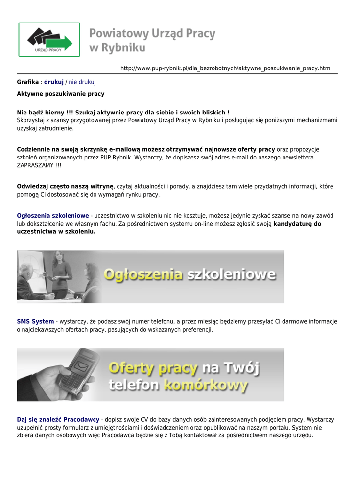 http://www.pup-rybnik.pl/dla_bezrobotnych/aktywne_poszukiwanie_pracy.html Grafika : drukuj / nie drukuj Aktywne poszukiwanie pracy Nie bądź bierny !!! Szukaj aktywnie pracy dla siebie i swoich bliskich ! Skorzystaj z szansy przygotowanej przez Powiatowy Urząd Pracy w Rybniku i posługując się poniższymi mechanizmami uzyskaj zatrudnienie. Codziennie na swoją skrzynkę e-mailową możesz otrzymywać najnowsze oferty pracy oraz propozycje szkoleń organizowanych przez PUP Rybnik. Wystarczy, że dopiszesz swój adres e-mail do naszego newslettera. ZAPRASZAMY !!! Odwiedzaj często naszą witrynę, czytaj aktualności i porady, a znajdziesz tam wiele przydatnych informacji, które pomogą Ci dostosować się do wymagań rynku pracy. Ogłoszenia szkoleniowe - uczestnictwo w szkoleniu nic nie kosztuje, możesz jedynie zyskać szanse na nowy zawód lub dokształcenie we własnym fachu. Za pośrednictwem systemu on-line możesz zgłosić swoją kandydaturę do uczestnictwa w szkoleniu. SMS System - wystarczy, że podasz swój numer telefonu, a przez miesiąc będziemy przesyłać Ci darmowe informacje o najciekawszych ofertach pracy, pasujących do wskazanych preferencji. Daj się znaleźć Pracodawcy - dopisz swoje CV do bazy danych osób zainteresowanych podjęciem pracy. Wystarczy uzupełnić prosty formularz z umiejętnościami i doświadczeniem oraz opublikować na naszym portalu. System nie zbiera danych osobowych więc Pracodawca będzie się z Tobą kontaktował za pośrednictwem naszego urzędu. Pliki video - jest to dział multimedialny, który za pośrednictwem filmów pokarze ci jak przygotować się do rozmowy kwalifikacyjnej, jak napisać CV oraz przekaże inne przydatne rady służące znalezieniu zatrudnienia czy też przekwalifikowania się. Materiały Klubu Pracy - osoby uczestniczące w Klubie Pracy PUP Rybnik mogą zalogować się do swojego kursu i otrzymać materiały szkoleniowe oraz informacje o planach pracy w Klubie.