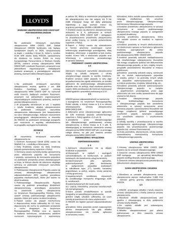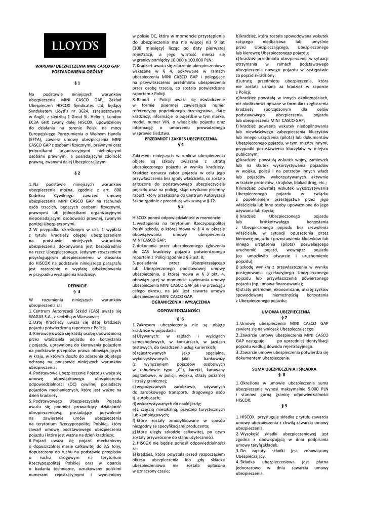w polisie OC, który w momencie przystąpienia do ubezpieczenia ma nie więcej niż 9 lat (108 miesięcy) licząc od daty pierwszej rejestracji, a jego wartość mieści się WARUNKI UBEZPIECZENIA MINI CASCO GAP POSTANOWIENIA OGÓLNE §1 Na podstawie niniejszych warunków ubezpieczenia MINI CASCO GAP, Zakład Ubezpieczeń HISCOX Syndicates Ltd, będący Syndykatem Lloyd’s nr 3624, zarejestrowany w Anglii, z siedzibą 1 Great St. Helen’s, London EC3A 6HX zwany dalej HISCOX, upoważniony do działania na terenie Polski na mocy Europejskiego Porozumienia o Wolnym Handlu (EFTA), zawiera umowy ubezpieczenia MINI CASCO GAP z osobami fizycznymi, prawnymi oraz jednostkami organizacyjnymi niebędącymi osobami prawnymi, a posiadającymi zdolność prawną, zwanymi dalej Ubezpieczającymi. §2 1. Na podstawie niniejszych warunków ubezpieczenia można, zgodnie z art. 808 Kodeksu Cywilnego zawrzeć umowę ubezpieczenia MINI CASCO GAP na rachunek osób trzecich, będących osobami fizycznymi, prawnymi lub jednostkami organizacyjnymi nieposiadającymi osobowości prawnej, zwanymi poniżej Ubezpieczonymi. 2. W przypadku określonym w ust. 1 wypłata z tytułu kradzieży objętej ubezpieczeniem na podstawie niniejszych warunków ubezpieczenia dokonywana jest bezpośrednio na rzecz Ubezpieczonego. Jedynym roszczeniem przysługującym ubezpieczonemu w stosunku do HISCOX na podstawie niniejszego paragrafu jest roszczenie o wypłatę odszkodowania w przypadku wystąpienia kradzieży. DEFINICJE § 3 W rozumieniu niniejszych warunków ubezpieczenia za: 1. Centrum Autoryzacji Szkód (CAS) uważa się WAGAS S.A., z siedzibą w Warszawie; 2. Datę Kradzieży uważa się datę kradzieży pojazdu potwierdzoną raportem z Policji; 3. Kierowcę uważa się każdą osobę upoważnioną przez właściciela pojazdu do korzystania z pojazdu, uprawnioną do kierowania pojazdem na podstawie przepisów prawa obowiązujących w kraju, w którym doszło do zdarzenia objętego ochroną na podstawie niniejszych warunków ubezpieczenia; 4. Podstawowe Ubezpieczenie Pojazdu uważa się umowę obowiązkowego ubezpieczenia odpowiedzialności (OC) cywilnej posiadaczy pojazdów mechanicznych, które jest ważne na dzień kradzieży. 5. Podstawowego Ubezpieczyciela Pojazdu uważa się podmiot prowadzący działalność ubezpieczeniową, posiadający pozwolenie na zawieranie umów ubezpieczenia na terytorium Rzeczypospolitej Polskiej, który zawarł umowę podstawowego ubezpieczenia pojazdu i które jest ważne na dzień kradzieży; 6. Pojazd uważa się pojazd mechaniczny o dopuszczalnej masie całkowitej do 3,5 tony, dopuszczony do ruchu na podstawie przepisów o ruchu drogowym na terytorium Rzeczypospolitej Polskiej oraz w oparciu o badania techniczne, oznakowany polskimi numerami rejestracyjnymi i wymieniony w granicy pomiędzy 10.000 a 100.000 PLN; 7. Kradzież uważa się zdarzenie ubezpieczeniowe wskazane w § 4, pokrywane w ramach ubezpieczenia MINI CASCO GAP i polegające na przywłaszczeniu przedmiotu ubezpieczenia przez osobę trzecią, co zostało potwierdzone raportem z Policji. 8. Raport z Policji uważa się oświadczenie w formie pisemnej zawierające numer referencyjny popełnionego przestępstwa, datę kradzieży, informacje o pojeździe w tym marka, model, numer VIN, o właścicielu pojazdu oraz informację o umorzeniu prowadzonego w sprawie śledztwa. PRZEDMIOT I ZAKRES UBEZPIECZENIA §4 Zakresem niniejszych warunków ubezpieczenia objęte są szkody związane z utratą ubezpieczonego pojazdu w wyniku kradzieży. Kradzież oznacza zabór pojazdu w celu jego przywłaszczenia bez zgody właściciela, co zostało zgłoszone do podstawowego ubezpieczyciela pojazdu oraz na policję, skąd uzyskano pisemny raport, który przekazano do Centrum Autoryzacji Szkód zgodnie z procedurą wskazaną w § 12. §5 HISCOX ponosi odpowiedzialność w momencie: 1. wystąpienia na terytorium Rzeczypospolitej Polski szkody, o której mowa w § 4 w okresie obowiązywania umowy ubezpieczenia MINI CASCO GAP; 2. dokonania przez ubezpieczonego zgłoszenia do CAS kradzieży pojazdu potwierdzonego reportem z Policji zgodnie z § 3 ust. 8; 3. posiadania przez Ubezpieczającego lub Ubezpieczonego podstawowej umowy ubezpieczenia, o której mowa w § 3 pkt. 4, obowiązującej w momencie zawierania umowy ubezpieczenia MINI CASCO GAP jak i w przeciągu całego okresu, na jaki jest zawarta umowa ubezpieczenia MINI CASCO GAP. OGRANICZENIA I WYŁĄCZENIA ODPOWIEDZIALNOŚCI § 6 1. Zakresem ubezpieczenia nie są objęte kradzieże w pojazdach: a) Używanych: w rajdach i wyścigach samochodowych, w konkursach, w jazdach testowych, do świadczenia usług kurierskich; b) rejestrowanych jako specjalne, wykorzystywanych jako bankowozy (z wyłączeniem pojazdów osobowych w zabudowie typu „C”), karetki, karawany pogrzebowe, w policji, wojsku, straży pożarnej i straży granicznej; c) wypożyczanych zarobkowo, używanych do zarobkowego transportu drogowego osób tj. autobusach; d) wykorzystywanych do nauki jazdy; e) z częścią mieszkalną, przyczep turystycznych lub kempingowych; f) które zostały zmodyfikowane w sposób niezgodny ze specyfikacjami producenta; g) które uległy szkodzie całkowitej, po czym zostały przywrócone do stanu użyteczności. 2. HISCOX nie będzie ponosił odpowiedzialności za: a) kradzież, która powstała przed rozpoczęciem okresu ubezpieczenia lub gdy składka ubezpieczeniowa nie została opłacona w oznaczony czasie; b) kradzież, która została spowodowana wskutek rażącego niedbalstwa lub umyślnie przez Ubezpieczającego, Ubezpieczonego lub kierowcę Ubezpieczonego pojazdu; c) kradzież przedmiotu ubezpieczenia w sytuacji otrzymania w ramach podstawowego ubezpieczenia nowego pojazdu w zastępstwie za pojazd skradziony; d) utratę przedmiotu ubezpieczenia, która nie została uznana za kradzież w raporcie z Policji; e) kradzież powstałą w innych okolicznościach, niż okoliczności opisane w formularzu zg