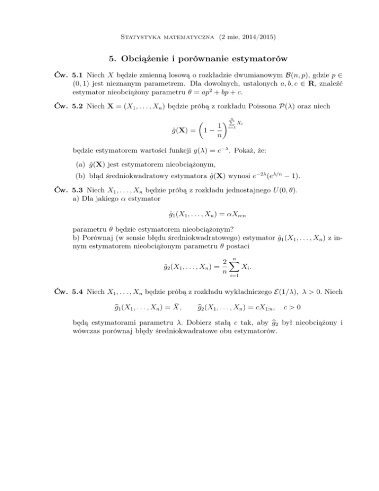 b) Porównaj (w sensie błędu średniokwadratowego) estymator ĝ1 (X1 , . . . , Xn ) z innym estymatorem nieobciążonym parametru θ postaci