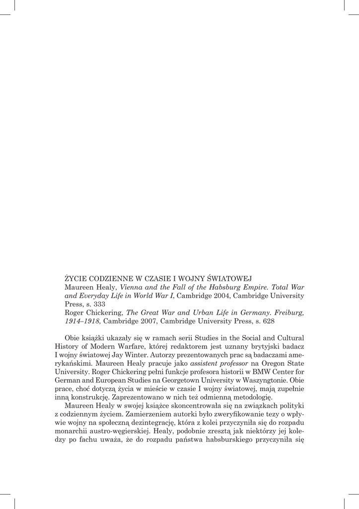 276 Recenzje [18] tknięcia podważają zaufanie czytelnika również do innych danych liczbowych przytaczanych w pracy (nawiasem mówiąc, dane te w większości odnoszą się do całości Królestwa Polskiego, tworząc obraz z pewnością odmienny niż w odniesieniu do samej Warszawy). Obie Autorki w swych rozważaniach pominęły okres rewolucji 1905 r. – niewątpliwie specyficzny i odmienny od „pokojowych” i w miarę stabilnych warun ków rozwoju społeczeństwa w drugiej połowie XIX w., ale przecież niezmiernie wiele mówiący o trawiących to społeczeństwo, a tłumionych prawno-administracyjnymi limitami nurtach podskórnych, które w 1905 r. nagle wytrysnęły na powierzchnię, lekceważąc paragrafy i żandarmskie pałki... Może tu należy szukać odpowiedzi na pytanie, na ile polskie fobie były immanentną cechą tego społeczeństwa, a na ile dewiacją rozwoju w granicach zaborczego prawa? Znamienne, że przy całej odmienności metod badawczych i zaprezentowanego obrazu inteligencji warszawskiej pochodzenia żydowskiego w drugiej połowie XIX w. obie Autorki niejako zwieńczyły swe dociekania tytułami podkreślającymi brak przynależności badanej grupy, jej usytuowanie pomiędzy dwoma skrystalizowanymi (i niezbyt sobie życzliwymi) środowiskami. Jest to być może najważniejsza konkluzja płynąca z lektury obu prac: zasymilowani Żydzi nie zostali zintegrowani ze społeczeństwem polskim, chociaż opuścili już tradycyjne społeczeństwo żydowskie. Znaleźli się pomiędzy tą (żydowską) i tamtą (polską) stroną – czego? Czyżby barykady? Dorota Zamojska ŻYCIE CODZIENNE W CZASIE I WOJNY ŚWIATOWEJ Maureen Healy, Vienna and the Fall of the Habsburg Empire. Total War and Everyday Life in World War I, Cambridge 2004, Cambridge University Press, s. 333 Roger Chickering, The Great War and Urban Life in Germany. Freiburg, 1914–1918, Cambridge 2007, Cambridge University Press, s. 628 Obie książki ukazały się w ramach serii Studies in the Social and Cultural History of Modern Warfare, której redaktorem jest uznany brytyjski badacz I wojny światowej Jay Winter. Autorzy prezentowanych prac są badaczami amerykańskimi. Maureen Healy pracuje jako assistent professor na Oregon State University. Roger Chickering pełni funkcje profesora historii w BMW Center for German and European Studies na Georgetown University w Waszyngtonie. Obie prace, choć dotyczą życia w mieście w czasie I wojny światowej, mają zupełnie inną konstrukcję. Zaprezentowano w nich też odmienną metodologię. Maureen Healy w swojej książce skoncentrowała się na związkach polityki z codziennym życiem. Zamierzeniem autorki było zweryfikowanie tezy o wpływie wojny na społeczną dezintegrację, która z kolei przyczyniła się do rozpadu monarchii austro-węgierskiej. Healy, podobnie zresztą jak niektórzy jej koledzy po fachu uważa, że do rozpadu państwa habsburskiego przyczyniła się [19] Recenzje 277 przede wszystkim sytuacja wewnątrz imperium podczas wojny. Proces rozpadu charakteryzowały jej zdaniem takie zjawiska jak głód, przemoc, rozluźnienie norm społecznych. Przedmiotem swoich obserwacji uczyniła Wiedeń, uznając go za miejsce, w którym jak w soczewce zogniskowały się wszystkie bolączki monarchii. Stolica, podobnie jak i całe imperium, miała charakter wielo etniczny, który w okresie wojny został wzmocniony przez napływające do miasta rzesze uciekinierów z terenów bezpośrednio narażonych na skutki działań zbrojnych, przede wszystkim Żydów i Słowian (Polaków i Czechów). Swoje badania Autorka potraktowała jako mikrohistorię i zaliczyła do nurtu case stu dies. We wstępie zadeklarowała też użycie w analizach kategorii i metodologii związanej z nurtem gender. Przyjęcie takiej optyki nie dziwi, jeśli weźmiemy pod uwagę fakt, że po zmobilizowaniu mężczyzn w populacji miejskiej zaznaczyła się znaczna przewaga kobiet i dzieci. Książka składa się z dwóch dużych części, w których wyodrębniono po trzy rozdziały. Część pierwsza nosi tytuł: Polityka i reprezentacja/wyobrażenie (Politics and representation), druga Państwo i rodzina (State and family). Pierwszy rozdział części pierwszej Jedzenie i polityka poświęcenia Autorka poświęciła wpływowi wzrastających niedoborów żywności i głodu na stosunek społeczeństwa do państwa. Przedstawiła dramatyczną sytuację wiedeńczyków próbujących najróżniejszymi sposobami (w tym i karanym szmuglem) zdobyć żywność. Autorce udało się ustalić, że ponad 50% karanych za tzw. drobne przestępstwa związane z aprowizacją stanowiły kobiety. Skoncentrowała się na szukaniu przyczyn i przejawów słabnięcia entuzjazmu wojennego. Z jej ustaleń jednoznacznie wynika, że starczyło go zaledwie na rok. Symbolem tego okresu i jednocześnie udziału cywilów w wojnie oraz ich poświęcenia dla ojczyzny stał się Wehrman im Eisen – pomnik wzniesiony w Wiedniu na Schwarzenbergplatz. Z czasem, gdy wojna się przeciągała, a życie codzienne stawało się coraz trudniejsze, poświęcenie zaczęło być definiowane jako „gorzka niesprawiedliwość”. Wiedeńczycy – coraz bardziej głodni i zmęczeni – zaczynali pytać o to, co otrzymają od państwa w zamian za swoje poświęcenie? Wraz z narastającym rozgoryczeniem przestawali też realizować rolę, którą państwo dla nich przewidziało – azylu i oazy spokoju dla walczących na frontach żołnierzy. Austriaccy mieszkańcy stolicy w coraz większym stopniu czuli się ofiarami wojny, czyli ofiarami imperium habsburskiego i jego struktur, urzędników, którzy nie radzili sobie z problemami zaopatrzenia i dystrybucji, w końcu ofiarami innych mieszkańców imperium – nie wiedeńczyków i nie Austriaków. Stopniowo cywilne ofiary wojny utożsamiały swoje poświęcenie z poświęceniem żołnierzy walczących na frontach. Taka postawa mieszkańców Wiednia stanowiła zdaniem władz zagrożeni
