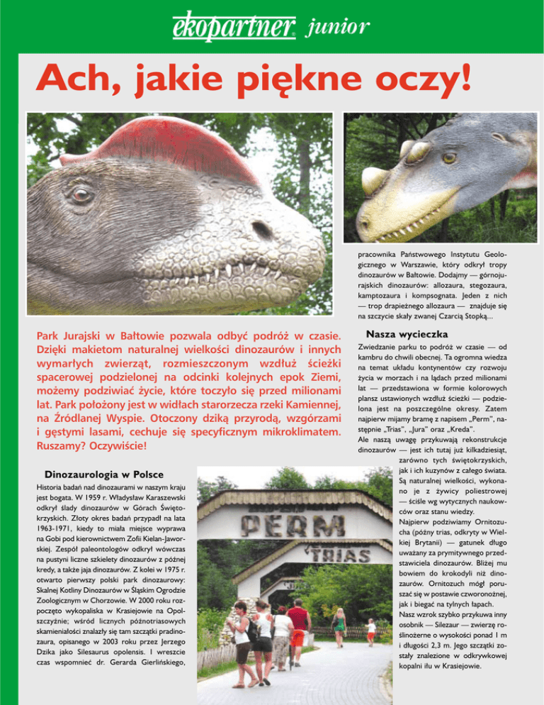 Ach, jakie piękne oczy! pracownika Państwowego Instytutu Geologicznego w Warszawie, który odkrył tropy dinozaurów w Bałtowie. Dodajmy — górnojurajskich dinozaurów: allozaura, stegozaura, kamptozaura i kompsognata. Jeden z nich — trop drapieżnego allozaura — znajduje się na szczycie skały zwanej Czarcią Stopką... Park Jurajski w Bałtowie pozwala odbyć podróż w czasie. Dzięki makietom naturalnej wielkości dinozaurów i innych wymarłych zwierząt, rozmieszczonym wzdłuż ścieżki spacerowej podzielonej na odcinki kolejnych epok Ziemi, możemy podziwiać życie, które toczyło się przed milionami lat. Park położony jest w widłach starorzecza rzeki Kamiennej, na Źródlanej Wyspie. Otoczony dziką przyrodą, wzgórzami i gęstymi lasami, cechuje się specyficznym mikroklimatem. Ruszamy? Oczywiście! Dinozaurologia w Polsce Historia badań nad dinozaurami w naszym kraju jest bogata. W 1959 r. Władysław Karaszewski odkrył ślady dinozaurów w Górach Świętokrzyskich. Złoty okres badań przypadł na lata 1963-1971, kiedy to miała miejsce wyprawa na Gobi pod kierownictwem Zofii Kielan-Jaworskiej. Zespół paleontologów odkrył wówczas na pustyni liczne szkielety dinozaurów z późnej kredy, a także jaja dinozaurów. Z kolei w 1975 r. otwarto pierwszy polski park dinozaurowy: Skalnej Kotliny Dinozaurów w Śląskim Ogrodzie Zoologicznym w Chorzowie. W 2000 roku rozpoczęto wykopaliska w Krasiejowie na Opolszczyźnie; wśród licznych późnotriasowych skamieniałości znalazły się tam szczątki pradinozaura, opisanego w 2003 roku przez Jerzego Dzika jako Silesaurus opolensis. I wreszcie czas wspomnieć dr. Gerarda Gierlińskiego, Nasza wycieczka Zwiedzanie parku to podróż w czasie — od kambru do chwili obecnej. Ta ogromna wiedza na temat układu kontynentów czy rozwoju życia w morzach i na lądach przed milionami lat — przedstawiona w formie kolorowych plansz ustawionych wzdłuż ścieżki — podzielona jest na poszczególne okresy. Zatem najpierw mijamy bramę z napisem „Perm”, następnie „Trias”, „Jura” oraz „Kreda”. Ale naszą uwagę przykuwają rekonstrukcje dinozaurów — jest ich tutaj już kilkadziesiąt, zarówno tych świętokrzyskich, jak i ich kuzynów z całego świata. Są naturalnej wielkości, wykonano je z żywicy poliestrowej — ściśle wg wytycznych naukowców oraz stanu wiedzy. Najpierw podziwiamy Ornitozucha (późny trias, odkryty w Wielkiej Brytanii) — gatunek długo uważany za prymitywnego przedstawiciela dinozaurów. Bliżej mu bowiem do krokodyli niż dinozaurów. Ornitozuch mógł poruszać się w postawie czworonożnej, jak i biegać na tylnych łapach. Nasz wzrok szybko przykuwa inny osobnik — Silezaur — zwierzę roślinożerne o wysokości ponad 1 m i długości 2,3 m. Jego szczątki zostały znalezione w odkrywkowej kopalni iłu w Krasiejowie. Zresztą w tej miejscowości odkryto około tysiąca kości różnych osobników tego gatunku, żyjącego ok. 223 mln lat temu (późny trias). Dalej mijamy Scelidozaura (wczesna jura), który jest jednym z najwcześniej opisanych naukowo dinozaurów: opisu dokonał już w 1868 r. Richard Owen, twórca pojęcia „dinozaury”. Masa ciała Scelidozaura wynosiła ok. 250 kg, długość — 4 m, żył on ok. 200 mln lat temu, na grzbiecie miał charakterystyczny pancerz. Szczątki znaleziono w Europie i Stanach Zjednoczonych, a także w Gromadzicach k. Ostrowca Świętokrzyskiego odkryto tropy pasujące wiekiem i budową do kończyn tego gatunku. Postanawiamy zajrzeć w oczy Dilofozaurowi (wczesna jura) — to jeden z najstarszych znanych dużych dinozaurów mięsożernych. Drapieżnik o dość znacznych rozmiarach (nawet do 6 m długości). I jego tropy znaleziono w niedalekiej okolicy, bo w Sołtykowie. Wciąż zagadką pozostaje funkcja charakterystycznego podwójnego grzebienia na głowie tego osobnika. Nie ustalono, czy służył on do termoregulacji, czy np. do wabienia samic w okresie godowym. Dalej przypatrujemy się groźnej postawie Ceratozaura — jest masywny i niebezpieczny, z ogromną szczęką i ostrymi jak żyletki zębami. Wprawdzie dochodzimy już do bramy z napi- sem “Kreda” (w tej części obejrzymy gatunki zamieszkujące w ostatnim okresie ery mezozoicznej, od 145 do 65 mln lat temu), ale postanawiamy jeszcze dotknąć Stegozaura — zwierzęcia o masywnym (7 m), ociężałym i niezgrabnym ciele, z charakterystycznymi romboidalnymi płytami kostnymi. Na moment przystajemy przed Diplodokiem (późna jura), o długości ciała 25 m, przez długi czas uznawanym za największe zwierzę lądowe. Zjadał on do 1 tony dziennie roślin (głównie paprocie). Ciężki i masywny ogon wraz z masą ciała to była jego potężna broń w walce z drapieżnikami. Wkraczamy do „Kredy”: od razu naszą uwagę przykuwa atak Deinonycha na roślinożernego dinozaura z gatunku iguanodonów. Podziwiamy także Cearadaktyla, żyjącego ok. 115 mln lat temu. To gad latający z ponad 5-metrową rozpiętością skrzydeł, o dobrym wzroku, polujący na ryby i inne organizmy morskie. Stajemy wreszcie przed bodaj najbardziej znanym dinozaurem drapieżnym — Tyranozaurem (późna kreda). Jego potężna głowa przekraczała 1,5 m długości, a szczęki mogły zacisnąć się z siłą ponad 2,5 tony. Na końcu czekają na nas młodziutkie Korytozaury — dinozaury kaczodziobe. Ponoć gniazdowały one gromadnie, blisko siebie, wracając co roku w te same miejsca. I jak — donoszą paleontolodzy — najprawdopodobniej pisklęta i młode osobniki tego gatunku były dokarmiane przez rodziców. To, co je wyróżnia spośród innych dinozaurów, to system dźwięków, dzięki któremu mogły porozumiewać się na duże odległości, tak jak dziś czynią to słonie. Przed nami jeszcze Muzeum Jurajskie, w którym zgromadzono skamieniałości okresu jurajskiego z licznych miejsc w Polsce i kilku zagranicznych lokalizacji. A zatem wpatrujemy się w eksponaty ślima