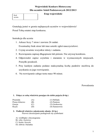 Wojewódzki Konkurs Historyczny Dla uczniów Szkół Podstawowych 2012/2013 Etap wojewódzki Kod ucznia Gratuluję jesteś w gronie najlepszych uczniów w województwie! Przed Tobą ostatni etap konkursu. Instrukcja dla ucznia 1. Arkusz liczy 7 stron i zawiera 26 zadań. Ewentualny brak stron lub inne usterki zgłoś nauczycielowi. 2. Czytaj uważnie wszystkie teksty i zadania. 3. Rozwiązania zapisuj długopisem lub piórem. Nie używaj korektora. 4. Odpowiedzi zapisz czytelnie i starannie w wyznaczonych miejscach. Pomyłki przekreśl. 5. Przy każdym zadaniu podano maksymalną liczbę punktów możliwą do uzyskania za jego rozwiązanie. 6. Na rozwiązanie całego testu masz 90 minut. Powodzenia 1. Połącz ze sobą właściwie pasujące do siebie pojęcia (0-4p.) Piramida Pismo klinowe Grecja Rzym (A) (B) (C) (D) (1) Hellada (2) Panteon (3) Grobowiec (4) Sumerowie 2. Podkreśl właściwe zakończenie zdania (0-1p.) Pierwsi chrześcijanie posługiwali się symbolami A) B) C) D) wielbłąda i chrystogramu ryby i kotwicy konia i krzyża żółwia i baranka 1 3. Zabaw się w budowniczego grodu i miasta średniowiecznego. Korzystając z ramki poniżej, dopasuj właściwie pojęcia występujące w danych budowlach. Niektóre pojęcia mogą wystąpić w obu budowlach. (0-6p.) brama, drewniane chaty, fosa, burmistrz, most, palisada, waga miejska, kościół drewniany, rynek, mury obronne, baszty, wieże z kamienia, siedziba księcia, barbakan, ratusz, podgrodzie, katedra, pręgierz, targ, kamienice, wał obronny, cech, kasztelan, sukiennice, drużyna. Gród 1)……………………. 2)……………………. 3)……………………. 4)…………………….. 5)…………………….. 6)…………………….. 7) ……………………. 8) ……………………. 9) ……………………. 10)……………………. 11) …………………… 12) …………………… Miasto średniowieczne 1)……………………. 2)……………………. 3)……………………. 4)…………………….. 5)…………………….. 6)…………………….. 7) ……………………. 8) ……………………. 9) ……………………. 10)……………………. 11) …………………… 12) …………………… 4. Do krótkiego życiorysu postaci dopisz imię i nazwisko. (0-2p.) Rzeźbiarz, pochodził z Norymbergi, stworzył jeden z najwspanialszych ołtarzy gotyckich w Polsce. Wyrzeźbił także marmurowy nagrobek króla Kazimierza Jagiellończyka. 1.………………………………………………………………………………………………… Źródło: http://www.krakow.travel/ Był księdzem, matematykiem, lekarzem, ekonomistą, prawnikiem, astronomem. Urodził się w Toruniu. Stworzył jedno z najważniejszych dzieł na świecie dotyczących pojmowania i funkcjonowania świata. Był doradcą Zygmunta I Starego w sprawach ekonomii. 2………………………………………………………………………………………………… Źródło: http://www.teachingpolish.com/polski/materialy8.htm 5. Wyjaśnij pojęcie pańszczyzna (0-1p.) ....................................................................................................................................................... ....................................................................................................................................................... 2 6. Na podstawie mapy i własnej wiedzy wykonaj polecenia. 1 3 2 Źródło: Książka Nauczyciela, Nowa Era,2007 r. A) Dokończ zdanie. (0-1p.) Podczas III rozbioru Polski Warszawa znalazła się w zaborze .......................................... B) W którym roku był II rozbiór Polski? (0-1p.) ………………………………. C) Zapisz, po którym rozbiorze Polska straciła Gdańsk. (0-1p.) Po……………rozbiorze Polski. D) Zapisz rok rozpoczęcia i zakończenia obrad Sejmu Wielkiego. (0-2p.) 1)............................... 2)............................... E) Zapisz nazwy państw, które zagarnęły zaznaczone na mapie cyframi 1, 2, 3, ziemie. (0-3p.) 1………………………………. 2………………………………. 3………………………………. F) Uporządkuj chronologicznie wydarzenia zapisując cyfry od 1 do 6.(0-3p.) ……Konfederacja barska ……Utworzenie Komisji Edukacji Narodowej ……Otwarcie Szkoły Rycerskiej ……Bitwa pod Zieleńcami ……Bitwa pod Racławicami ……Konfederacja Targowicka 3 7. Na podstawie zdjęcia i własnej wiedzy wykonaj polecenia. Źródło: http://monetowo.pl Awers Rewers A) Zapisz nazwę państwa, które emitowało ten pieniądz. (0-1p.) ……………………………………………………………………………………………… B) Czy to państwo posiadało instytucję monarchy? Właściwą odpowiedź podkreśl (0-1p.) - Tak (król Fryderyk I August) - Nie (rządził nim car Rosji Aleksander I ) C) Zapisz rok, w którym państwo emitujące tę monetę przestało istnieć. (0-1p.) ……………………………………. 8. Na podstawie zdjęcia i własnej wiedzy wykonaj polecenia. Źródło: muzeumwp.pl, www.wiadomosci24.pl/artykul/patriotyzm A) W okresie powstań narodowych takie przedmioty jak pierścionki, wisiorki, służyły do okazywania patriotyzmu. Jak dawniej i dzisiaj nazywa się takie elementy ubioru. (0-1p.) …………………………………………………………. B) Polacy podczas zaborów w różny sposób demonstrowali swój patriotyzm. Wymień dwa inne sposoby manifestowania polskości niż ten podany w punkcie A. (0-2p.) 1. ……………………………………………………………………………………… 2. …………………………………………………………………………………….... 9. Zapisz dzień, miesiąc i rok wybuchu powstania styczniowego. (0-2p.) …………………………………………. 10. Powstanie 