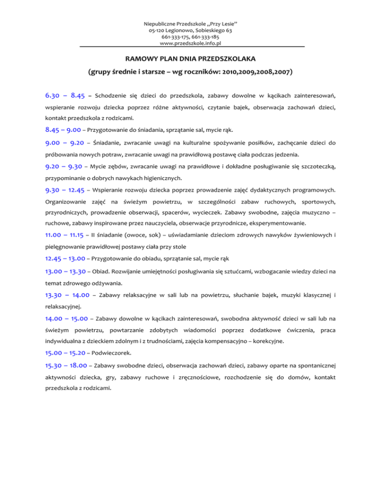 Niepubliczne Przedszkole „Przy Lesie” 05-120 Legionowo, Sobieskiego 63 661-333-175, 661-333-185 www.przedszkole.info.pl RAMOWY PLAN DNIA PRZEDSZKOLAKA (grupy średnie i starsze – wg roczników: 2010,2009,2008,2007) 6.30 – 8.45 – Schodzenie się dzieci do przedszkola, zabawy dowolne w kącikach zainteresowań, wspieranie rozwoju dziecka poprzez różne aktywności, czytanie bajek, obserwacja zachowań dzieci, kontakt przedszkola z rodzicami. 8.45 – 9.00 – Przygotowanie do śniadania, sprzątanie sal, mycie rąk. 9.00 – 9.20 – Śniadanie, zwracanie uwagi na kulturalne spożywanie posiłków, zachęcanie dzieci do próbowania nowych potraw, zwracanie uwagi na prawidłową postawę ciała podczas jedzenia. 9.20 – 9.30 – Mycie zębów, zwracanie uwagi na prawidłowe i dokładne posługiwanie się szczoteczką, przypominanie o dobrych nawykach higienicznych. 9.30 – 12.45 – Wspieranie rozwoju dziecka poprzez prowadzenie zajęć dydaktycznych programowych. Organizowanie zajęć na świeżym powietrzu, w szczególności zabaw ruchowych, sportowych, przyrodniczych, prowadzenie obserwacji, spacerów, wycieczek. Zabawy swobodne, zajęcia muzyczno – ruchowe, zabawy inspirowane przez nauczyciela, obserwacje przyrodnicze, eksperymentowanie. 11.00 – 11.15 – II śniadanie (owoce, sok) – uświadamianie dzieciom zdrowych nawyków żywieniowych i pielęgnowanie prawidłowej postawy ciała przy stole 12.45 – 13.00 – Przygotowanie do obiadu, sprzątanie sal, mycie rąk 13.00 – 13.30 – Obiad. Rozwijanie umiejętności posługiwania się sztućcami, wzbogacanie wiedzy dzieci na temat zdrowego odżywania. 13.30 – 14.00 – Zabawy relaksacyjne w sali lub na powietrzu, słuchanie bajek, muzyki klasycznej i relaksacyjnej. 14.00 – 15.00 – Zabawy dowolne w kącikach zainteresowań, swobodna aktywność dzieci w sali lub na świeżym powietrzu, powtarzanie zdobytych wiadomości poprzez dodatkowe ćwiczenia, praca indywidualna z dzieckiem zdolnym i z trudnościami, zajęcia kompensacyjno – korekcyjne. 15.00 – 15.20 – Podwieczorek. 15.30 – 18.00 – Zabawy swobodne dzieci, obserwacja zachowań dzieci, zabawy oparte na spontanicznej aktywności dziecka, gry, zabawy ruchowe i zręcznościowe, rozchodzenie się do domów, kontakt przedszkola z rodzicami. Niepubliczne Przedszkole „Przy Lesie” 05-120 Legionowo, Sobieskiego 63 661-333-175, 661-333-185 www.przedszkole.info.pl RAMOWY PLAN DNIA PRZEDSZKOLAKA (grupy młodsze i żłobkowe – wg roczników: 2011, 2012, 2013) 6.30 – 8.45 – Schodzenie się dzieci do przedszkola, zabawy dowolne w kącikach zainteresowań, wspieranie rozwoju dziecka poprzez różne aktywności, czytanie bajek, obserwacja zachowań dzieci, kontakt przedszkola z rodzicami. 8.45 – 9.00 – Przygotowanie do śniadania, sprzątanie sal, mycie rąk. 9.00 – 9.20 – Śniadanie, zwracanie uwagi na kulturalne spożywanie posiłków, zachęcanie dzieci do próbowania nowych potraw, zwracanie uwagi na prawidłową postawę ciała podczas jedzenia. 9.20 – 9.30 – Mycie zębów, zwracanie uwagi na prawidłowe i dokładne posługiwanie się szczoteczką, przypominanie o dobrych nawykach higienicznych. 9.30 – 11.35 – Wspieranie rozwoju dziecka poprzez prowadzenie zajęć dydaktycznych programowych. Organizowanie zajęć na świeżym powietrzu, w szczególności zabaw ruchowych, sportowych, przyrodniczych, prowadzenie obserwacji, spacerów, wycieczek. Zabawy swobodne, zajęcia muzyczno – ruchowe, zabawy inspirowane przez nauczyciela, obserwacje przyrodnicze, eksperymentowanie. 10.00 – 10.20 – II śniadanie (owoce, sok) – uświadamianie dzieciom zdrowych nawyków żywieniowych i pielęgnowanie prawidłowej postawy ciała przy stole 11.35 – 11.45 – Przygotowanie do obiadu, mycie rąk, porządkowanie sali. 11.45 – 12.00 – Zupa. Rozwijanie umiejętności posługiwania się sztućcami, wzbogacanie wiedzy dzieci na temat zdrowego odżywania. 12.00 – 13.45 – odpoczynek, czas na drzemkę 13.45 – 14.00 – Przygotowanie do II dania, sprzątanie, mycie rąk 14.00 – 14.20 – II danie. Rozwijanie umiejętności posługiwania się sztućcami, wzbogacanie wiedzy dzieci na temat zdrowego odżywania. 14.20 – 15.20 – Zabawy dowolne w kącikach zainteresowań, swobodna aktywność dzieci w sali lub na świeżym powietrzu, powtarzanie zdobytych wiadomości poprzez dodatkowe ćwiczenia, praca indywidualna z dzieckiem zdolnym i z trudnościami, zajęcia kompensacyjno – korekcyjne. 15.30 – 15.50 – Podwieczorek. 16.00 – 18.00 – Zabawy swobodne dzieci, obserwacja zachowań dzieci, zabawy oparte na spontanicznej aktywności dziecka, gry, zabawy ruchowe i zręcznościowe, rozchodzenie się do domów, kontakt przedszkola z rodzicami.