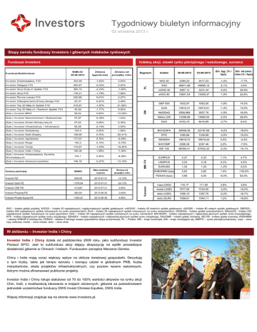 Tygodniowy biuletyn informacyjny 02 września 2013 r. Stopy zwrotu funduszy Investors i głównych indeksów rynkowych Indeksy akcji, stawki rynku pieniężnego i walutowego, surowce Fundusze Investors WAN/JU 30.08.2013 Zmiana tygodniowa Zmiana od początku roku Inv estor Zrównoważony FIO 343,58 -1,62% 3,93% WIG 20 Inv estor Obligacji FIO 284,87 -0,04% 0,54% WIG Inv estor Akcji Duży ch Spółek FIO 364,10 -2,24% -1,60% mWIG 40 Inv estor Akcji FIO 176,21 -1,79% 7,88% sWIG 80 Inv estor Pły nna Lokata FIO 222,68 0,01% 2,27% Inv estor Zabezpieczenia Emery talnego FIO 24,37 -0,81% 3,48% 219,87 -1,97% 21,56% Inv estor Top 50 Mały ch i Średnich Spółek FIO 46,58 -1,77% 8,83% (Sub.) Inv estor BRIC 58,54 0,84% -12,08% Inv estor Top 25 Mały ch Spółek FIO (Sub.) Inv estor Nieruchomości i Budownictwa 57,87 -0,38% PL Indeks 23.08.2013 Zm. tyg. (% / bps) Zm. od pocz. roku (% / bps) 2384,22 2417,23 -1,4% -7,7% 48871,98 49895,10 -2,1% 3,0% 3087,13 3231,44 -4,5% 20,9% 12801,04 13050,37 -1,9% 22,6% 30.08.2013 S&P 500 1632,97 1663,50 -1,8% 14,5% DJIA 14810,31 15010,51 -1,3% 13,0% NASDAQ 3589,868 3657,79 -1,9% 18,9% 1,03% Nikkei 225 13388,86 13660,55 -2,0% 28,8% DAX 8103,15 8416,99 -3,7% 6,4% (Sub.) Inv estor Zmian Klimaty czny ch 57,04 0,00% 6,30% (Sub.) Inv estor Inf rastruktury i Inf ormaty ki 58,38 -0,10% 3,53% (Sub.) Inv estor Gotówkowy Segment DM Fundusz/Subfundusz 0,00% 1,66% BOVESPA 50008,38 52197,06 -4,2% -18,0% 159,90 0,72% -20,41% RTS 1290,96 1330,99 -3,0% -15,5% (Sub.) Inv estor Agrobiznes 177,07 0,70% -6,59% SENSEX 18619,72 18519,44 0,5% -4,2% (Sub.) Inv estor Rosja 140,2 0,14% -5,75% SHCOMP 2098,38 2057,46 2,0% -7,5% (Sub.) Inv estor Turcja 174,67 -1,03% -19,20% ISE 100 66394,41 67932,32 -2,3% -15,1% (Sub.) Inv estor Indie i Chiny 156,36 1,09% -7,36% 134,1 0,44% -8,38% EURPLN 4,27 4,23 1,1% 4,7% 146,19 -0,27% -13,18% USDPLN 3,23 3,16 2,3% 4,4% EURUSD 1,32 1,34 -1,2% 0,2% WIBOR6M (bps) 2,63 2,62 1,0% -135,0% PZSW5 (bps) 3,98 4,04 -6,0% 62,5% Fundusz zam knięty WAN/CI Data ostatniej w yceny Zm iana od początku roku Investor FIZ 929,48 2013-07-31 -13,15% Investor Gold FIZ 1 876,84 2013-07-31 -24,13% Investor CEE FIZ 413,69 2013-07-31 2,95% 983,54 2013-06-30 -2,49% 1 642,27 2013-06-30 4,95% Investor Property FIZ Investor Private Equity FIZ MM / FX (Sub.) Inv estor Amery ka Łacińska Surowce (Sub.) Inv estor Zrównoważony Ry nków Wschodzący ch EM 124,5 (Sub.) Inv estor Gold Otwarty ropa (USD) 116,17 111,92 3,8% 3,8% miedź (USD) 7077,50 7333,00 -3,5% -10,5% złoto (USD) 1395,15 1397,75 -0,2% -16,7% złoto (EUR) 1056,61 1044,11 1,2% -16,8% WIG – Indeks giełdy polskiej, WIG20 – Indeks 20 największych i najpłynniejszych spółek giełdowych, mWIG40 - Indeks 40 średnich spółek giełdowych, sWIG80 – Indeks 80 małych spółek giełdowych, S&P500 Indeks 500 największych spółek notowanych na rynku amerykańskim, DIJA - Indeks 30 największych spółek notowanych na rynku amerykańskim, NASDAQ - Indeks spółek amerykańskich, Nikkei225 - Indeks 225 największych spółek notowanych na rynku japońskim, DAX – Indeks 30 największych spółek notowanych na rynku niemieckim, BOVESPA - Indeks największych i najbardziej płynnych spółek rynku brazylijskiego, RTS - Indeks największych spółek rynku rosyjskiego, SENSEX - Indeks największych i najbardziej płynnych spółek rynku indyjskiego, SHCOMP - Indeks giełdy chińskiej, ISE100 - Indeks giełdy tureckiej, WIBOR6M – stawka WIBOR 6 miesięczna, PZSW5 - stawka 5 letniego swapa (pięcioletnia stopa procentowa), PL – Polska, DM – kraje rozwinięte, EM – kraje rozwijające się, MM/FX – rynek pieniężny/walutowy, ropa – cena ropy naftowej, miedź – cena miedzi, złoto – cena złota. W zbliżeniu – Investor Indie i Chiny Investor Indie i Chiny działa od października 2008 roku, jako subfundusz Investor Parasol SFIO. Jest to subfundusz akcji dający ekspozycję na spółki prowadzące działalność głównie w Chinach i Indiach. Funduszem zarządza Marzena Górska. Chiny i Indie mają coraz większy wpływ na oblicze światowej gospodarki. Decydują o tym liczby, takie jak tempo wzrostu i rosnący udział w globalnym PKB, liczba mieszkańców, skala projektów infrastrukturalnych, czy poziom rezerw walutowych, którymi można sfinansować publiczne projekty. Investor Indie i Chiny lokuje statutowo od 70 do 100% wartości aktywów na rynku akcji Chin, Indii, z możliwością lokowania w krajach ościennych, głównie za pośrednictwem jednostek uczestnictwa funduszy DWS Invest Chinese Equities, DWS India. Więcej informacji znajduje się na stronie www.investors.pl. Komentarz rynkowy W minionym tygodniu opublikowano dane o wzroście PKB za drugi kwartał 2013, który wyniósł 0.8% r/r i był zgodny z wstępnym szacunkiem. Dane te potwierdzają, że głównym motorem wzrostu pozostaje eksport netto, taka tendencja powinna się utrzymywać w najbliższych miesiącach biorąc pod uwagę siłę niemieckiej gospodarki. Jednocześnie pojawiają się oznaki odbudowy konsumpcji prywatnej, wskazuje na to odczyt sprzedaży detalicznej za lipiec, który zaskoczył rynek pozytywnie. Sprzedaż wzrosła w lipcu o 3.8% m/m i 4.3% r/r. Dzisiaj opublikowany wskaźnik PMI, mierzący koniunkturę w sektorze przemysłowym, wzrósł w sierpniu do poziomu 52.6 pkt wobec oczekiwań na poziomie 51.7 pkt. W szybszym tempie niż w poprzednich miesiącach wzrosła wielkość produkcji, całkowita liczba nowych zamówień oraz zamówień eksportowych. Po raz pierwszy od roku producenci ponieśli poziom zatrudnienia. Pierwsza połowa ubiegłego tygodnia przyniosła znaczne osłabienie złotego. Złoty tracił w ślad za innymi walutami rynków wschodzących, pozostając jednocześnie jedną z najmocniejszych walut rynków wschodzących. Najbardziej przeceniły się waluty krajów, które mają problemy z bilansami płatniczymi (Indie, Turcja) a Polska nie należy do tej grupy. Jako główne powody przeceny można wymienić oczekiwa