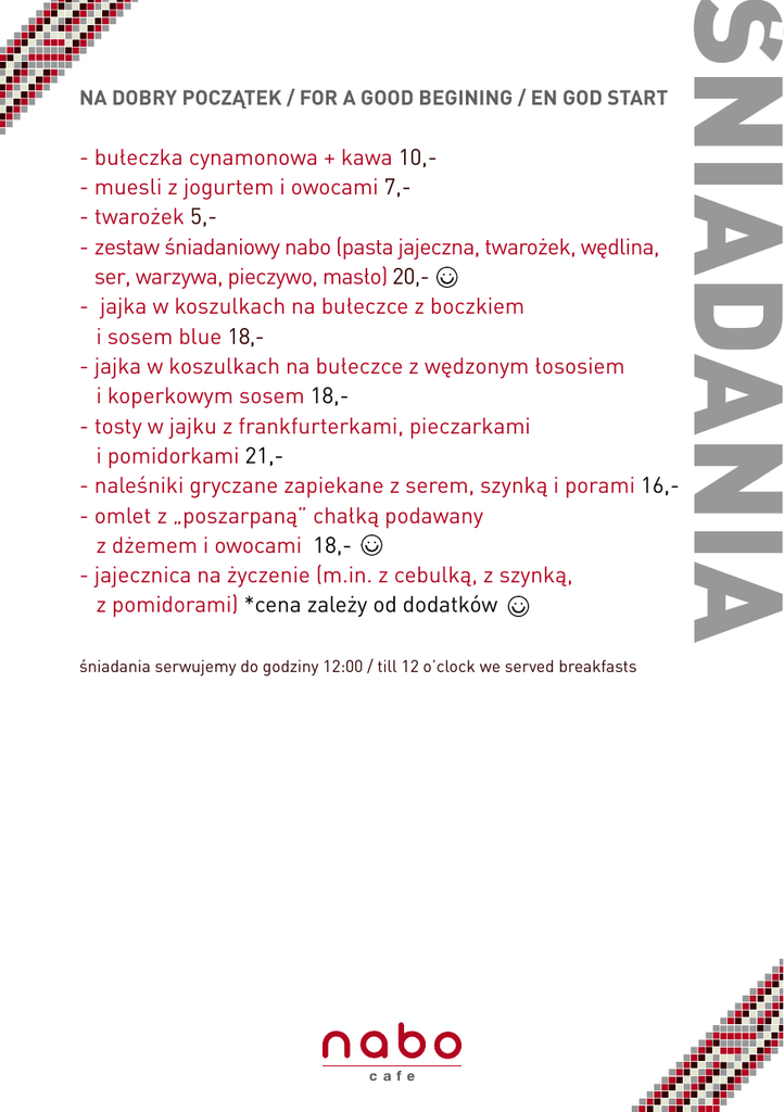 ŚNIADANIA na dobry początek / for a good begining / en god start - bułeczka cynamonowa + kawa 10,- muesli z jogurtem i owocami 7,- twarożek 5,- zestaw śniadaniowy nabo (pasta jajeczna, twarożek, wędlina, ser, warzywa, pieczywo, masło) 20,- jajka w koszulkach na bułeczce z boczkiem i sosem blue 18,- jajka w koszulkach na bułeczce z wędzonym łososiem i koperkowym sosem 18,- tosty w jajku z frankfurterkami, pieczarkami i pomidorkami 21,- naleśniki gryczane zapiekane z serem, szynką i porami 16,- omlet z „poszarpaną” chałką podawany z dżemem i owocami 18,- jajecznica na życzenie (m.in. z cebulką, z szynką, z pomidorami) *cena zależy od dodatków śniadania serwujemy do godziny 12:00 / till 12 o’clock we served breakfasts menuwiosna na mały głód / for a little hunger / lidt sulten - kanapki duńskie smørrebrød: z jajkiem, krewetkami, pomidorem i domowym majonezem 16,z marynowaną polędwicą ze szparagami i przepiórczymi jajkami marynowanymi w zalewie z buraków 16,- duńskie klopsiki rybne fiskefrikadeller z ziołowym remoulade i frytkami 19,- lub z sałatą 22,- sałatka z rybą maślaną, warzywami korzennymi i delikatnym limonkowym dressingiem 26,- sałatka z grzankami z kozim serem, gruszką i orzechami laskowymi 23,- sałatka z zieloną soczewicą, rucolą, pomidorkami, serem feta i klopsikami jagnięcymi 29,- sałatka z grillowanym kurczakiem, grzankami, żółtym serem, przepiórczymi jajkami marynowanymi w zalewie z buraków 26,- buraczane placki z łososiem gravlax i sałatą 27,- zupa dnia *zapytaj nas co dziś ugotowaliśmy na duży głód / for a big hunger / meget sulten - krewetki duszone na maśle z zielonym pieprzem, czosnkiem, chilli 32,- łosoś na warzywnym pęczaku z grillowaną cukinią i ziołowym pesto 41,- sztuka mięsa w sosie śmietanowo - chrzanowym z ziemniakami oraz z surówką z ogórka 29,- pieczona pierś kurczaka z ziołowym pesto, zapiekanym puree ziemniaczanym i sałatką 29,- - burger nabo (mięso wołowe, sos ziołowy, sałata, pomidor, ogórek, cebula, boczek, ser) serwowany z frytkami 31,lub z sałatką 34,- stek urugwajski serwowany z ziołowym masełkiem, zieloną sałatą i frytkami 45,- makaron z kurczakiem i sosem pomidorowym, posypany żółtym serem 23,- makaron zainspirowany duńsko hiszpańskim romansem… z chorizo, krewetkami i szpinakiem 32,- - tradycyjne duńskie placuszki aebleskiver z lodami i konfiturą 8,poza tym bywają u nas*: - sernik z karmelem 11,- sernik na zimno z owocami i galaretką 11,- ciasto owocowe z kruszonką 11,- ciasto czekoladowo - bananowe 11,- ciasto pomarańczowo - migdałowe 11,- tarta cytrynowa 11,*zapytaj, które ciasto jest dziś dostępne - dania polecane dla dzieci. W miarę możliwości możemy zmodyfikować inne dania tak aby spełniały potrzeby Twojego dziecka. sŁODKO słodkie zachcianki / need for sweet / til den søde tand