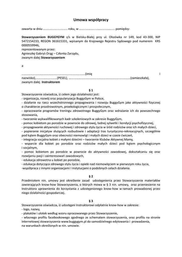 Umowa współpracy zawarta w dniu ….......................... roku, w ………………………………………. pomiędzy: Stowarzyszeniem BUGGYGYM z/s w Bielsku-Białej przy ul. Olszówka nr 149, kod 43-300, NIP 5472154233, REGON 361615331, wpisanym do Krajowego Rejestru Sądowego pod numerem KRS 0000559946, reprezentowanym przez: Agnieszkę Gabryś-Drąg – Członka Zarządu, zwanym dalej Stowarzyszeniem a ...........................................................................(imię nazwisko),.........................(PESEL), …......................................................................(zamieszkała), zwanym dalej Instruktorem i §1 Stowarzyszenie oświadcza, iż celem jego działalności jest: - organizacja, rozwój oraz popularyzacja BuggyGym w Polsce, - działanie na rzecz wszechstronnego propagowania i rozwoju BuggyGym jako aktywności fizycznej o charakterze prozdrowotnym, proekologicznym i prospołecznym, - opracowanie programów treningu zdrowotnego BuggyGym oraz wdrażanie ich do powszechnego stosowania, - tworzenie wykwalifikowanych kadr szkoleniowych w zakresie BuggyGym, - pomoc kobietom po porodzie w powrocie do zdrowej, ładnej sylwetki i kondycji psychofizycznej, - propagowanie aktywności ruchowej i zdrowego stylu życia w śród rodziców oraz ich małych dzieci, - popieranie inicjatyw służących rozbudowie i adaptacji tras turystyczno-rekreacyjnych, szczególnie pod kątem BuggyGym oraz obecności niemowląt i małych dzieci w czasie ćwiczeń, - integracja socjalna kobiet z małymi dziećmi – tworzenie Klubów Aktywnej Mamy, - wsparcie dla kobiet po porodzie oraz rodziców małych dzieci pod kątem psychologicznym i socjalnym, - pomoc kobietom po porodzie w powrocie do aktywności zawodowej, dokształcaniu się oraz rozwijaniu pasji i zainteresowań zawodowych, - edukacja zdrowotna u kobiet po porodzie, - edukacja dotycząca zdrowego stylu życia i opieki nad niemowlęciem w pierwszym roku życia, -współpraca z innymi organizacjami i instytucjami o podobnych celach działania. §2 Przedmiotem nin. umowy jest określenie zasad udostępnienia przez Stowarzyszenie materiałów zawierających know-how Stowarzyszenia, o których mowa w § 3 nin. umowy, oraz przeniesienie na Instruktora uprawnienia do korzystania z udostępnionego know-how w ramach prowadzonej przez niego działalności gospodarczej. §3 Stowarzyszenie oświadcza, iż udostępni Instruktorowi odpłatnie know-how w zakresie: - logo, nazwy, - plakatów i ulotek według wzoru opracowanego przez Stowarzyszenie, - własnego profilu facebookowego zgodnego ze schematem stowarzyszenia, oraz profilu na stronie internetowej stowarzyszenia www.buggygym.pl do samodzielnego edytowania i prowadzenia, na warunkach określonych w nin. umowie. §4 Zleceniobiorca oświadcza, iż zobowiązuje się prowadzić działalność instruktorską: - we własnym imieniu i na własny rachunek, - z wykorzystaniem udostępnionego know-how Stowarzyszenia, o którym mowa w § 3 nin. umowy, - zgodnie z celami Stowarzyszenia opisanymi w § 1 nin. umowy oraz należytą starannością. §5 Stowarzyszenie oświadcza, iż jest wyłącznie uprawnione i przysługują mu wszelkie autorskie prawa majątkowe i osobiste do logo, nazwy, strony internetowej, materiałów szkoleniowych i innych oznaczeń Stowarzyszenia. §6 Instruktor oświadcza, iż: - chce osiągnąć sukces dzięki metodzie prowadzenia działalności zgodnej z celami Stowarzyszenia, opisanymi w § 1 nin. umowy, a także jego renomie, wiedzy, doświadczeniu i stałej pomocy na warunkach określonych w nin. umowie, - jest przygotowany do podporządkowania się wymogom Stowarzyszenia i opracowanym przez nie standardom jakości. §7 1. Stowarzyszenie udostępnia Instruktorowi know-how, opisane w § 3 nin. umowy oraz udziela Instruktorowi licencji do używania znaków użytkowych oraz innych oznaczeń Stowarzyszenia wyłącznie do prowadzenia działalności w postaci prowadzenia zajęć fitness dla mam z wózkiem. 2. Stowarzyszenie może kontrolować w dowolnym i wybranym przez siebie czasie działalność Instruktora, a w szczególności, czy sposób prowadzenia tej działalności jest zgodny z umową i celami Stowarzyszenia. §8 Stowarzyszenie oświadcza, iż nie ponosi odpowiedzialności: - za wyniki finansowe działalności prowadzonej przez Instruktora zgodnie z postanowieniami nin. umowy, - wobec osób trzecich oraz pracowników Instruktora za działania Instruktora podejmowane zgodnie z postanowieniami nin. umowy. §9 1. Instruktor zobowiązuje się uczestniczyć w promocji Stowarzyszenia, w szczególności zobowiązany jest na bieżąco dostosowywać materiały reklamowe i promocyjne ( m.in. ulotki, plakaty ) swojego przedsiębiorstwa do wymogów i standardów Stowarzyszenia oraz w miarę możliwości i przy dochowaniu należytej staranności uczestniczyć w szkoleniach oraz imprezach organizowanych przez stowarzyszenie na terenie powiatu, w którym prowadzi działalność. 2. Instruktor zobowiązuje się uzupełnić, najpóźniej do dwóch tygodni od dnia zawarcia niniejszej umowy, swój profil na stronie internetowej stowarzyszenia www.buggygym.pl – w sposób umożliwiający zidentyfikowanie Instruktora, w tym poprzez określenie cech predestynujących go do wykonywanego przez niego zajęcia oraz posiadanego doświadczenia. W przypadku nie uzupełnienia przez Instruktora profilu na stronie internetowej Stowarzyszenia www.buggygym.pl w terminie określonym wyżej Stowarzyszenie może usunąć profil Instruktora. Profil może zostać przywrócony na wniosek Instruktora na zasadach opisanych wyżej. § 10 1. W zamian za udostępnienie know-how Stowarzyszenia oraz za udzielenie licencji Instruktor zapłaci Stowarzyszeniu coroczną opłatę w wysokości 50 zł. (pięćdziesiąt złotych) płatną przelewem na rachunek bankowy Stowarzyszenia w Mbank nr 78 1140 2017 0000 4702 1309 4583 do 14 stycznia każdego roku. 2. Stowarzyszenie zastrzega sobie prawo do