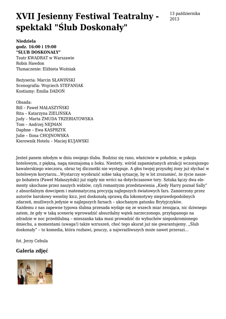 XVII Jesienny Festiwal Teatralny spektakl "Ślub Doskonały" 13 października 2013 Niedziela godz. 16:00 i 19:00 "ŚLUB DOSKONAŁY" Teatr KWADRAT w Warszawie Robin Hawdon Tłumaczenie: Elżbieta Woźniak Reżyseria: Marcin SŁAWIŃSKI Scenografia: Wojciech STEFANIAK Kostiumy: Emilia DADOŃ Obsada: Bill – Paweł MAŁASZYŃSKI Rita – Katarzyna ZIELIŃSKA Judy – Marta ŻMUDA TRZEBIATOWSKA Tom – Andrzej NEJMAN Daphne – Ewa KASPRZYK Julie – Ilona CHOJNOWSKA Kierownik Hotelu – Maciej KUJAWSKI Jesteś panem młodym w dniu swojego ślubu. Budzisz się rano, właściwie w południe, w pokoju hotelowym, z piękną, nagą nieznajomą u boku. Niestety, wśród zapamiętanych atrakcji wczorajszego kawalerskiego wieczoru, obraz tej ślicznotki nie występuje. A głos twojej przyszłej żony już słychać w hotelowym korytarzu…Wystarczy wyobrazić sobie taką sytuację, by w lot zrozumieć, że życie naszego bohatera (Paweł Małaszyński) już nigdy nie wróci na dotychczasowe tory. Sztuka łączy dwa elementy ukochane przez naszych widzów, czyli romantyzm przedstawienia „Kiedy Harry poznał Sally” z absurdalnym dowcipem i matematyczną precyzją najlepszych światowych fars. Zamierzony przez autorów barokowy weselny kicz, jest doskonałą oprawą dla lokomotywy nieprawdopodobnych zdarzeń, możliwych jedynie w najlepszych farsach – ukochanym gatunku Brytyjczyków. Każdemu z nas zapewne typowa ślubna przesada wydaje się ze wszech miar żenująca, nic dziwnego zatem, że gdy w taką scenerię wprowadzić absurdalny wątek narzeczonego, przyłapanego na zdradzie w noc przedślubną – mieszanka taka musi prowadzić do wybuchów nieposkromionego śmiechu, a momentami (uwaga!) także wzruszeń, choć tego akurat już nie gwarantujemy. „Ślub doskonały” – to komedia, która rozbawi, pouczy, a najwrażliwszych może nawet przerazi… fot. Jerzy Cebula Galeria zdjęć