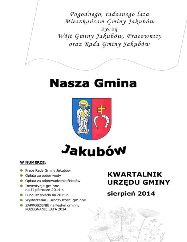 Pogodnego, radosnego lata Mieszkańcom Gminy Jakubów życzą Wójt Gminy Jakubów, Pracownicy oraz Rada Gminy Jakubów W NUMERZE: Prace Rady Gminy Jakubów Opłata za pobór wody Opłata za odprowadzenie ścieków Inwestycje gminne na II półrocze 2014 r. Fundusz sołecki na 2015 r. Wydarzenia i uroczystości gminne ZAPROSZENIE na Festyn gminny POŻEGNANIE LATA 2014 KWARTALNIK URZĘDU GMINY sierpień 2014 Prace Rady Gminy Jakubów W ostatnim czasie Rada Gminy spotkała się na trzech posiedzeniach (23 kwietnia, 29 maja, 26 czerwca), które dotyczyły następujących spraw: 1. Podjęcie uchwał w sprawach: - udzielenia odpowiedzi na skargę na uchwałę Rady Gminy Jakubów nr XXXVI /215/2013 z dnia 30 grudnia 2013 roku oraz przekazania skargi do Wojewódzkiego Sądu Administracyjnego w Warszawie; - zaciągnięcia pożyczki w Banku Gospodarstwa Krajowego na wyprzedzające finansowanie zadania „Przebudowy drogi powiatowej w miejscowości Turek – etap 3”; - zatwierdzenia taryf za odprowadzanie ścieków do zbiorowych urządzeń kanalizacyjnych na terenie Gminy Jakubów; - nadania nazw ulic w miejscowości Mistów; - zatwierdzenia rocznego sprawozdania finansowego Gminy Jakubów wraz ze sprawozdaniem z wykonania budżetu za 2013 rok; - udzielenia absolutorium dla Wójta Gminy Jakubów z tytułu wykonania budżetu za 2013 rok; - zmian w Wieloletniej Prognozie Finansowej gminy Jakubów na lata 20142020; - zmian w budżecie gminy na 2014 rok. 2. Sprawozdanie z realizacji Gminnego Programu Przeciwdziałania Przemocy w Rodzinie oraz Ochrony Ofiar Przemocy w Rodzinie za 2013 rok. 3. Przedstawienie oceny zasobów pomocy społecznej za 2013 rok dla Gminy Jakubów. 4. Informacja dotycząca 25-lecia pierwszych wolnych wyborów w powojennej Polsce. 5. Sprawozdanie z wykonania budżetu Gminy Jakubów za 2013 rok: - 6. - wysłuchanie opinii Regionalnej Izby Obrachunkowej o przedłożonym przez Wójta Gminy Jakubów sprawozdaniu z wykonania budżetu Gminy Jakubów za 2013 rok, wysłuchanie wniosku Komisji Rewizyjnej, wysłuchanie opinii Regionalnej Izby Obrachunkowej o wniosku ww. Komisji. Wysłuchanie sprawozdań z działalności w 2013 roku: Komisariatu Policji w Dobrem, Gminnego Ośrodka Pomocy Społecznej w Jakubowie, Gminnej Biblioteki Publicznej w Jakubowie, Komisji Rady Gminy Jakubów. Opłata za odprowadzenie ścieków Na podstawie Uchwały Nr XL/242/2014 Rady Gminy Jakubów z dnia 29 maja 2014 roku w sprawie zatwierdzenia taryf za odprowadzanie ścieków do zbiorowych urządzeń kanalizacyjnych stanowiących własność gminy Jakubów ustalono taryfy na okres od 1 lipca 2014 roku do 31 grudnia 2015 roku w następującej wysokości: a) cena za odprowadzenie 1 m³ ścieków – 3,25 zł netto (+ podatek VAT), b) cena za odebrane ścieki dowożone do oczyszczalni za 1 m³ ścieków – 7,80 zł netto (+ podatek VAT). Opłata za pobór wody Opłata została ustalona na podstawie Uchwały nr XII/60/2011 Rady Gminy Jakubów z dnia 14 listopada 2011 r. w sprawie ustalania opłaty za wodę dostarczaną z gminnych urządzeń wodociągowych Stacji Uzdatniania Wody w Mistowie i Garczynie Dużym. Zgodnie z ww. uchwałą opłata za 1 m3 wody wynosi 1,70 zł netto (+ podatek VAT), opłata stała wynosi 1,50 zł netto (+ podatek VAT) miesięcznie tytułem konserwacji sieci wodociągowej dla gospodarstw domowych i pozostałych jednostek. Inwestycje gminne na II półrocze 2014 r. 1. „Przebudowa (modernizacja) drogi dojazdowej do gruntów rolnych w miejscowości Rządza” (wykonanie nakładki mineralno-asfaltowej standard II sposobem mechanicznym) – przeprowadzono przetarg na wykonanie inwestycji, w wyniku której zostanie podpisana dnia 31.07.2014 r. umowa z wykonawcą. Koszt całkowity wykonania inwestycji wynosi 123 682,65 zł brutto z czego pozyskano środki finansowe na dofinansowanie w wysokości 50% tj. 61 841,32 zł pochodzące ze środków związanych z wyłączenia z produkcji gruntów rolnych (Departament Rolnictwa i Rozwoju Obszarów Wiejskich Urzędu Marszałkowskiego Województwa Mazowieckiego w Warszawie). 2. „Przebudowa drogi powiatowej w miejscowości Turek – etap III” (budowa chodnika dla pieszych ze zjazdami do posesji z kostki brukowej betonowej, rynienek ściekowych oraz umocnienie skarp płytami ECO). Inwestycja w trakcie realizacji. Koszt całkowity wykonania inwestycji wynosi 284 991,60zł brutto z czego pozyskano środki finansowe na dofinansowanie w wysokości 80% poniesionych kosztów kwalifikowanych operacji tj. 185 360,00 zł pochodzące ze środków Europejskiego Funduszu Rolnego na rzecz Rozwoju Obszarów Wiejskich (Departament Rolnictwa i Rozwoju Obszarów Wiejskich Urzędu Marszałkowskiego Województwa Mazowieckiego w Warszawie). 3. „Przebudowa drogi powiatowej w miejscowości Kamionka – Etap I” (budowa chodnika dla pieszych ze zjazdami do posesji z kostki brukowej betonowej, rynienek ściekowych oraz umocnienie skarp płytami ECO). Złożony został wniosek o przyznanie pomocy w ramach działania 413 Wdrażanie lokalnych strategii rozwoju PROW 2007-2013, inwestycja na etapie sprawdzania wniosku przed podpisaniem umowy o ww. przyznanie pomocy. Koszt całkowity wykonania inwestycji wynosi 93 184,93 zł brutto z czego zostaną pozyskane środki finansowe na dofinansowanie w wysokości 80% poniesionych kosztów kwalifikowanych operacji tj. 60 608,00 zł pochodzące ze środków Europejskiego Funduszu Rolnego na rzecz Rozwoju Obszarów Wiejskich (Departament Rolnictwa i Rozwoju Obszarów Wiejskich Urzędu Marszałkowskiego Województwa Mazowieckiego w Warszawie). 4. „Przebudowa drogi powiatowej w miejscowości Aleksandrów gmina Jakubów” (budowa chodnika dla pieszych ze zjazdami do posesji z kostki brukowej betonowej, rynienek ściekowych oraz umocnienie skarp płytami ECO). Złożony został wniosek o przyznanie pomocy w ramach działania 313, 322, 323 „Odnowa i rozwój wsi” objętej PROW 2007-2013, inwestycja na etapie sprawdzania wniosku przed podp