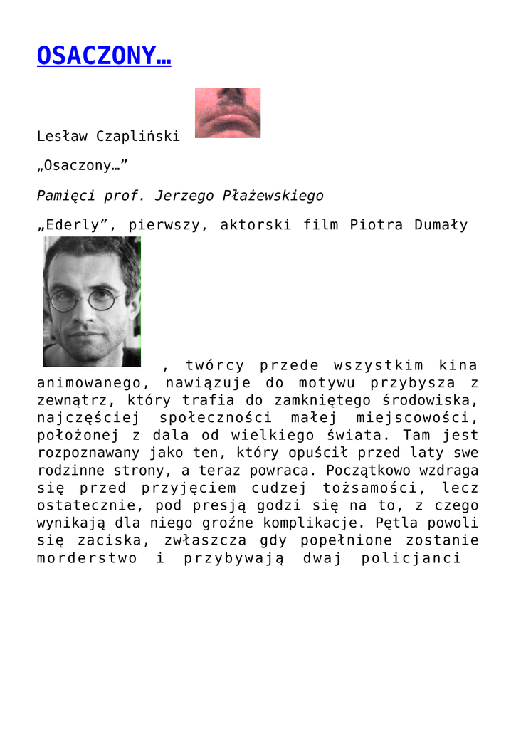 OSACZONY… Lesław Czapliński „Osaczony…” Pamięci prof. Jerzego Płażewskiego „Ederly”, pierwszy, aktorski film Piotra Dumały , twórcy przede wszystkim kina animowanego, nawiązuje do motywu przybysza z zewnątrz, który trafia do zamkniętego środowiska, najczęściej społeczności małej miejscowości, położonej z dala od wielkiego świata. Tam jest rozpoznawany jako ten, który opuścił przed laty swe rodzinne strony, a teraz powraca. Początkowo wzdraga się przed przyjęciem cudzej tożsamości, lecz ostatecznie, pod presją godzi się na to, z czego wynikają dla niego groźne komplikacje. Pętla powoli się zaciska, zwłaszcza gdy popełnione zostanie morderstwo i przybywają dwaj policjanci jakby żywcem wyjęci ze świata Kafkowskiego „Procesu”. Zarazem jednak aresztowanie okaże się ocaleniem i następuje „powrót do przyszłości”, czyli współczesności. Pamiętam z młodości tego rodzaju film „Droga do Saliny” Georges’a Lautnera, który być może oglądał wtedy i reżyser, będący, skądinąd, moim rówieśnikiem? W tym i w tamtym przypadku nieznajomy rozpoznany zostaje jako marnotrawny syn, brat i narzeczony, który porzucił rodzinę. W przypadku Dumały jest to zarazem podróż w czasie. Bohater, konserwator dzieł sztuki Słow, przybywa popularnym niegdyś „ogórkiem”, czyli starym modelem autobusu marki Jelcz. Tytułowe Ederly to nazwa wioski, której wyglądu dostarcza prawdopodobnie jakaś poniemiecka osada z Ziem Zachodnich. Realia wskazują na lata sześćdziesiąte, ale wkradają się do nich pewne anachronizmy jak ten, kiedy bohater oświeca sobie drogę komórką. Na początku i pod koniec spotyka tajemniczego chłopca w białej koszuli, który poza tymi dwoma przypadkami nie pojawia się więcej, nie należąc do grona mieszkańców, a więc uchodzić może za wysłannika z innego świata? Zmowa otoczenia tym bardziej okazuje się koszmarna i absurdalna, gdy bohater odkrywa brak jakiegokolwiek podobieństwa z tym, za kogo jest brany, co z drugiej strony świadczyć może o tym, że mamy do czynienia raczej z subiektywną projekcją jego własnego kryzysu tożsamości . Film utrzymany jest w monochromatycznej, sepiowej tonacji, przydającej mu znamion starych fotografij. Nie brak w nim wizualnego poczucia humoru, kiedy podczas „rodzinnej kolacji” , do której dokooptowany zostaje Słow jako syn , spada mu widelec, po który schyla się, a następnie wchodzi pod stół, a po pewnym czasie zaglądają tam pozostali, skonsternowani uczestnicy biesiady . W roli miejscowego Profesora wystąpił profesor Jerzy Płażewski (szyderczo obdarzony tym tytułem przez Zygmunta Kałużyńskiego w toczonych z nim polemikach, a w rzeczywistości doktor i znany krytyk filmowy), dla którego był to w wieku dziewięćdziesięciu lat jednocześnie ekranowy debiut i pożegnanie, albowiem wkrótce zmarł. Niepokojącą galerię zdziwaczałych postaci, zaludniających ten świat, uzupełniają: ćwicząca jogę rzekoma matka w wykonaniu Heleny Norowicz, zrzędząca księża gospodyni , którą zagrała Aleksandra Górska, czy arogancki starszy „brat” w ujęciu Piotra Lesława Skiby, ulubionego aktora Krystiana Lupy. Głównego bohatera zagrał Mariusz Banaszewski, a w roli organisty przypomniał o swoim istnieniu Piotr Bajor. Reżyserowi udało się też uchwycić senną atmosferę miejscowości, w której zatrzymał się czas (sam pamiętam podobne wrażenie, wyniesione z podłódzkiego Lutomierska, do którego można było dojechać tramwajem, a w którym wydawało się, iż wszystko trwa jak za carskiego panowania). Daje ona znać o sobie podczas spaceru bohatera główną ulicą, kiedy ze stojących domów nieufnie przypatrują mu się przyklejone do szyb ich okien twarze mieszkańców, nasuwając mi skojarzenie z podobnym efektem, zastosowanym przez Tadeusza Konwickiego w „Jak daleko stąd, jak blisko”, w odniesieniu do Drohiczyna. Z kolei trochę upiorna galeria postaci – mieszkańców Ederly, powoli osaczających Słowa – przywodzi nieco przed wyobraźnię „strasznych” mieszkańców, dybiących na tytułowego „Lokatora” Romana Polańskiego. „Ederly”. Scen. i reż. Piotr Dumała. Zdj. Adam Sikora. Muz. Selma Mutal. Obejrzane w krakowskim kinie Mikro dzięki uprzejmości p. Iwony Nowak.