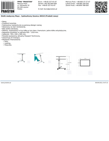 PPHU "PRAISTON" Mariusz Prais ul. Górowska 32 64-100 Leszno Polska Biuro: +48.65 527-01-67 Serwis:+48.782-844-000 Fax: +48.65 527-01-67 Mariusz Prais: +48.693-37-27-47 Łukasz Prais: +48.665-345-001 Zenon Prais: +48.609-788-830 E-mail: [email protected] Stolik medyczny Mayo – hydrauliczny Uzumcu 40410 (Produkt nowy) • Nowy, • Produkcji tureckiej, • Podnoszony hydraulicznie za pomocą dźwigni nożnej, • Wykonany ze stali nierdzewnej, • Blat stolika obrotowy, • Mobilny, wyposażony w trzy kółka w tym dwa z hamulcem, jedno kółko antystatyczne, • Regulacja wysokości w zakresie 920 – 1310 mm, • Gabaryty: 740 x 540 x 920 mm, • Posiada wystawiony aktualny Paszport Techniczny, • Gwarancja 24 miesiące, • Możliwość finansowania: ⚬ Raty, ⚬ Leasing, ⚬ Pożyczka. www.praiston.pl 06-09-2013, 9:47:13