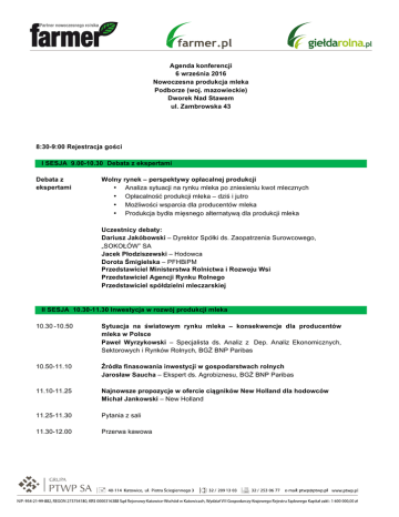 Agenda konferencji 6 września 2016 Nowoczesna produkcja mleka Podborze (woj. mazowieckie) Dworek Nad Stawem ul. Zambrowska 43 8:30-9:00 Rejestracja gości I SESJA 9.00-10.30 Debata z ekspertami Debata z ekspertami Wolny rynek – perspektywy opłacalnej produkcji • Analiza sytuacji na rynku mleka po zniesieniu kwot mlecznych • Opłacalność produkcji mleka – dziś i jutro • Możliwości wsparcia dla producentów mleka • Produkcja bydła mięsnego alternatywą dla produkcji mleka Uczestnicy debaty: Dariusz Jakóbowski – Dyrektor Spółki ds. Zaopatrzenia Surowcowego, „SOKOŁÓW” SA Jacek Płodziszewski – Hodowca Dorota Śmigielska – PFHBiPM Przedstawiciel Ministerstwa Rolnictwa i Rozwoju Wsi Przedstawiciel Agencji Rynku Rolnego Przedstawiciel spółdzielni mleczarskiej II SESJA 10.30-11.30 Inwestycja w rozwój produkcji mleka 10.30 -10.50 Sytuacja na światowym rynku mleka – konsekwencje dla producentów mleka w Polsce Paweł Wyrzykowski – Specjalista ds. Analiz z Dep. Analiz Ekonomicznych, Sektorowych i Rynków Rolnych, BGŻ BNP Paribas 10.50-11.10 Źródła finasowania inwestycji w gospodarstwach rolnych Jarosław Saucha – Ekspert ds. Agrobiznesu, BGŻ BNP Paribas 11.10-11.25 Najnowsze propozycje w ofercie ciągników New Holland dla hodowców Michał Jankowski – New Holland 11.25-11.30 Pytania z sali 11.30-12.00 Przerwa kawowa III SESJA 12.00-13.30 Ważne aspekty prowadzenia produkcji mleka Ważne aspekty prowadzenia produkcji mleka 12.00-12.30 Jak zjeść dobrze i tanio? – czyli ekonomika żywienia krów • Możliwości ograniczenia kosztów żywienia przez racjonalne wykorzystanie pasz • Żywienie oparte na regularnych badaniach wartości pokarmowej paszy • Wprowadzanie alternatywnych komponentów do dawki pokarmowej prof. dr hab. inż. Zygmunt M. Kowalski – Katedra Żywienia i Dietetyki Zwierząt, Wydział Hodowli i Biologii Uniwersytet Przyrodniczy w Krakowie 12.30-12.45 Alltech – naturalne rozwiązania w żywieniu krów mlecznych Jakub Kapuściński – Specjalista ds. Żywienia Bydła, Alltech 12.45-13.15 Zarobić na rozrodzie • Możliwości poprawy wyniku ekonomicznego w gospodarstwie za pomocą prawidłowo zarządzanego rozrodu • Poprawa wyników rozrodu wpływa w bezpośredni sposób na wydajność mleka, a w efekcie na wyprodukowany zysk • Wskazanie punktów w rozrodzie, których niedopilnowanie powoduje duże straty ekonomiczne prof. dr hab. Jan Twardoń – Katedra Rozrodu z Kliniką Zwierząt Gospodarskich, Wydział Medycyny Weterynaryjnej, Uniwersytet Przyrodniczy we Wrocławiu 13.15-13.25 Program opasu bydła „Razem w przyszłość” jako szansa dla rolników w obliczu zmian zachodzących na rynku mleka i wołowiny Leszek Jakielski – Zastępca Dyrektora ds. Skupu, „SOKOŁÓW” SA 13.25-13.40 Pytania z sali 13.40-14.15 Przerwa obiadowa IV SESJA 14.15-15.30 Elementy nowoczesnej produkcji mleka i wołowiny 14.15-14.45 Jak zwiększyć opłacalność produkcji wołowiny? • Perspektywy rozwoju produkcji bydła mięsnego w kraju • Możliwości wygenerowania większych zysków przy udziale w systemach jakości (QMP) oraz uczestnictwie w grupach producenckich Jerzy Wierzbicki – Polskie Zrzeszenie Producentów Bydła Mięsnego 14.45-15.15 Nowoczesna obora – czyli jaka? • Jak dopasować system utrzymania do posiadanych warunków w gospodarstwie? • Które rozwiązania są konieczne, a które niepotrzebnie podnoszą koszty inwestycji? • Jak zapewnić funkcjonalność budynku i jakich błędów unikać? dr Marcin Gołębiewski – Wydział Nauk o Zwierzętach, Katedra Szczegółowej Hodowli Zwierząt, Szkoła Główna Gospodarstwa Wiejskiego w Warszawie 15.15-15.30 Pytania z sali
