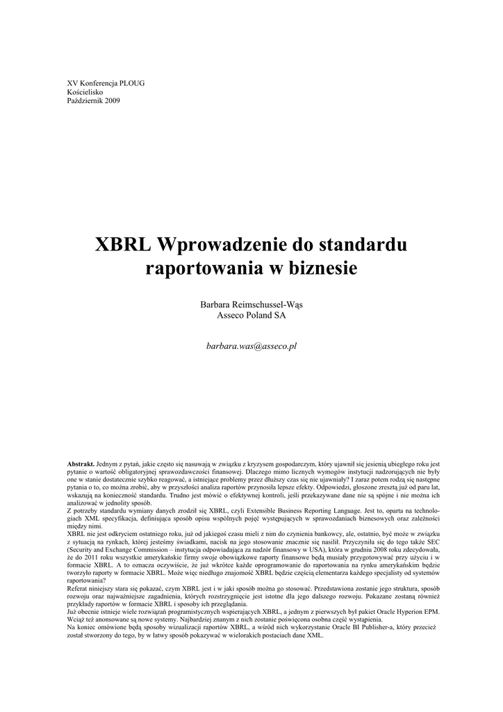 XV Konferencja PLOUG Kościelisko Październik 2009 XBRL Wprowadzenie do standardu raportowania w biznesie Barbara Reimschussel-Wąs Asseco Poland SA [email protected] Abstrakt. Jednym z pytań, jakie często się nasuwają w związku z kryzysem gospodarczym, który ujawnił się jesienią ubiegłego roku jest pytanie o wartość obligatoryjnej sprawozdawczości finansowej. Dlaczego mimo licznych wymogów instytucji nadzorujących nie były one w stanie dostatecznie szybko reagować, a istniejące problemy przez dłuższy czas się nie ujawniały? I zaraz potem rodzą się następne pytania o to, co można zrobić, aby w przyszłości analiza raportów przynosiła lepsze efekty. Odpowiedzi, głoszone zresztą już od paru lat, wskazują na konieczność standardu. Trudno jest mówić o efektywnej kontroli, jeśli przekazywane dane nie są spójne i nie można ich analizować w jednolity sposób. Z potrzeby standardu wymiany danych zrodził się XBRL, czyli Extensible Business Reporting Language. Jest to, oparta na technologiach XML specyfikacja, definiująca sposób opisu wspólnych pojęć występujących w sprawozdaniach biznesowych oraz zależności między nimi. XBRL nie jest odkryciem ostatniego roku, już od jakiegoś czasu mieli z nim do czynienia bankowcy, ale, ostatnio, być może w związku z sytuacją na rynkach, której jesteśmy świadkami, nacisk na jego stosowanie znacznie się nasilił. Przyczyniła się do tego także SEC (Security and Exchange Commission – instytucja odpowiadająca za nadzór finansowy w USA), która w grudniu 2008 roku zdecydowała, że do 2011 roku wszystkie amerykańskie firmy swoje obowiązkowe raporty finansowe będą musiały przygotowywać przy użyciu i w formacie XBRL. A to oznacza oczywiście, że już wkrótce każde oprogramowanie do raportowania na rynku amerykańskim będzie tworzyło raporty w formacie XBRL. Może więc niedługo znajomość XBRL będzie częścią elementarza każdego specjalisty od systemów raportowania? Referat niniejszy stara się pokazać, czym XBRL jest i w jaki sposób można go stosować. Przedstawiona zostanie jego struktura, sposób rozwoju oraz najważniejsze zagadnienia, których rozstrzygnięcie jest istotne dla jego dalszego rozwoju. Pokazane zostaną również przykłady raportów w formacie XBRL i sposoby ich przeglądania. Już obecnie istnieje wiele rozwiązań programistycznych wspierających XBRL, a jednym z pierwszych był pakiet Oracle Hyperion EPM. Wciąż też anonsowane są nowe systemy. Najbardziej znanym z nich zostanie poświęcona osobna część wystąpienia. Na koniec omówione będą sposoby wizualizacji raportów XBRL, a wśród nich wykorzystanie Oracle BI Publisher-a, który przecież został stworzony do tego, by w łatwy sposób pokazywać w wielorakich postaciach dane XML. XBRL Wprowadzenie do standardu raportowania w biznesie 81 1. Wstęp Dość często można się dzisiaj spotkać z poglądem, że obecny wokół nas i na rynkach finansowych kryzys dowodzi konieczności bardziej skutecznych działań różnych organów nadzoru finansowego. Niezależnie czy się z tym zgadzamy, czy nie, zauważyć trzeba, że jednym z koniecznych warunków wszelkiego nadzoru jest dostęp do informacji oraz możliwość efektywnego przetwarzania tych informacji. Można bowiem coraz to zwiększać wymagania związane z przekazywaniem danych, ale jeśli jedynym tego efektem będzie konieczność studiowania ton nieporównywalnych ze sobą, papierowych sprawozdań, niewiele to wniesie. Dlatego też tym pilniejsza stała się potrzeba ustalenia formatu wymiany informacji biznesowych, który zapewniałby: • łatwość przetworzenia takich informacji w systemie informatycznym, • przejrzystość i jednoznaczność, • możliwość porównywania między sobą danych pochodzących od różnych podmiotów. O ile pierwsze wymaganie jest dość proste do spełnienia i możemy zgodnie z prawdą zapewnić, że każdy nasz system je spełnia, bo z łatwością potrafi produkować dane w postaci elektronicznej, to już jeśli dłużej zastanowić się nad przejrzystością, okaże się, nie jest ona łatwa do osiągnięcia. Bo jeśli ktoś czyta raporty z różnych systemów, na których widnieją wartości liczbowe opatrzone nawet podobną etykietą słowną, to jaka jest podstawa do stwierdzenia, że ta wartość jest w obu przypadkach liczona w ten sam sposób? Aby tak było, raporty musiałyby być opatrywane wielkimi komentarzami opisującymi ich kontekst i sposób kalkulacji. A takie komentarze trudno byłoby już przetwarzać elektronicznie. Najgorzej jednak oczywiście wygląda sprawa spełnienia wymagania ostatniego. Formaty danych, nawet, jeśli uwzględnimy, że wiele z nich wykorzystuje dziś XML są ze sobą zupełnie nieporównywalne. Jeśli wpływają one do jednej instytucji nadzorującej, można je co najwyżej wspólnie przechowywać, angażując do każdej analizy merytorycznej człowieka. Pewnym rozwiązaniem, powszechnie dotąd stosowanym, jest w takiej sytuacji narzucenie jednego konkretnego formatu przez odbiorcę danych. Zapewnia ono pewną porównywalność (pewną, bo z ograniczeniami wynikającymi z braku dostatecznej przejrzystości, o których była mowa wcześniej), jest jednak mało elastyczne. Wymagania informacyjne się zmieniają, stąd stała potrzeba zmiany takiego interfejsu, z czego najbardziej są zadowoleni dostawcy systemów informatycznych. Wiadomo jednak, żę tam gdzie istnieją silne potrzeby, pojawiają się rozwiązania. I właśnie jednym z nich, coraz powszechniej przyjmowanym w wielu krajach, jest XBRL, czyli eXtesible Business Reporting Language. Pod koniec zeszłego roku amerykański nadzór finansowy SEC czyli Security and Exchange Comission (odpowiednik polskiej KPWiG) wydał regulację wymuszającą stopniowe przejście na XBRL dla wszystkich firm raportujących do SEC do połowy 2011 roku. Pierwsza grupa raportów od 500 największych przedsiębiorstw, zg