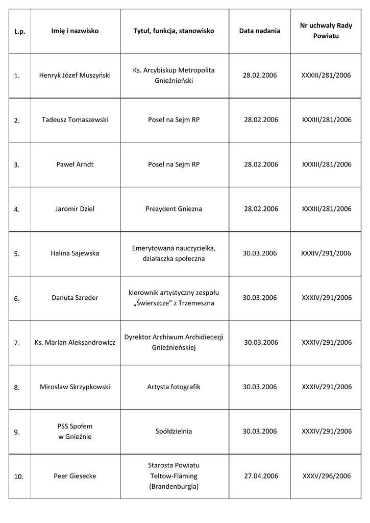 Imię i nazwisko Tytuł, funkcja, stanowisko Data nadania Nr uchwały Rady Powiatu 1. Henryk Józef Muszyński Ks. Arcybiskup Metropolita Gnieźnieński 28.02.2006 XXXIII/281/2006 2. Tadeusz Tomaszewski Poseł na Sejm RP 28.02.2006 XXXIII/281/2006 3. Paweł Arndt Poseł na Sejm RP 28.02.2006 XXXIII/281/2006 4. Jaromir Dziel Prezydent Gniezna 28.02.2006 XXXIII/281/2006 5. Halina Sajewska Emerytowana nauczycielka, działaczka społeczna 30.03.2006 XXXIV/291/2006 6. Danuta Szreder kierownik artystyczny zespołu „Świerszcze” z Trzemeszna 30.03.2006 XXXIV/291/2006 7. Ks. Marian Aleksandrowicz Dyrektor Archiwum Archidiecezji Gnieźnieńskiej 30.03.2006 XXXIV/291/2006 8. Mirosław Skrzypkowski Artysta fotografik 30.03.2006 XXXIV/291/2006 9. PSS Społem w Gnieźnie Spółdzielnia 30.03.2006 XXXIV/291/2006 Peer Giesecke Starosta Powiatu Teltow-Fläming (Brandenburgia) 27.04.2006 XXXV/296/2006 L.p. 10. 11. Klaus Bochow Przewodniczący Rady Powiatu Teltow-Fläming (Brandenburgia) 12. Teatr Im. Aleksandra Fredry w Gnieźnie - 27.04.2006 XXXV/296/2006 13. Bank Spółdzielczy w Gnieźnie - 27.04.2006 XXXV/296/2006 14. Powiatowy Oddział Związku Ochotniczych Straży Pożarnych RP w Gnieźnie - 29.06.2006 XXXVII/328/2006 15. Muzeum Początków Państwa Polskiego w Gnieźnie - 29.06.2006 XXXVII/328/2006 16. Stowarzyszenie Centrum Rehabilitacyjno-Kulturalne „Promyk” w Gnieźnie - 29.06.2006 XXXVII/328/2006 17. Wielkopolski Związek Inwalidów Narządu Ruchu Koło Gniezno - 29.06.2006 XXXVII/328/2006 18. Caritas Archidiecezji Gnieźnieńskiej - 25.09.2006 XXXVIII/348/2006 19. Zarząd Oddziału Rejonowego Polskiego Związku Emerytów, Rencistów i Inwalidów w Gnieźnie - 25.09.2006 XXXVIII/348/2006 20. Towarzystwo Miłośników Gniezna - 25.09.2006 XXXVIII/348/2006 21. Zenon Tadeusz Piwecki - 25.09.2006 XXXVIII/348/2006 22. Edmund Kaczmarek emeryt 28.12.2006 III/23/2006 27.04.2006 XXXV/296/2006 23. Helena Staniszewska emerytowany nauczyciel 21.02.2008 XV/157/2008 24. Janusz Sekulski emerytowany Z-ca Naczelnika Urzędu Skarbowego 20.11.2008 XXV/237/2008 25. Janina Fałdzińska emerytowany nauczyciel 20.11.2008 XXV/238/2008 26. Andrzej Leśniewski Kustosz Muzeum Regionalnego w Trzemesznie 20.11.2008 XXV/239/2008 27. Ryszard Szyda starszy asystent w oddziale paliatywnym 20.11.2008 XXV/240/2008 28. Anna Trocka ordynator oddziału otolaryngologii 20.11.2008 XXV/241/2008 29. Jolanta Kucharska – Kochańska Ordynator oddziału chorób wewnętrznych „B” 20.11.2008 XXV/242/2008 30. Włodzimierz Pilarczyk Prezes PCK w Gnieźnie 29.12.2008 XXIX/247/2008 31. Krystyna Król Sekretarz PCK w Gnieźnie 29.12.2008 XXIX/248/2008 32. Maria Nowak Emerytowany Dyrektor Szkoły Podstawowej w Zdziechowie 2.04.2009 XXXIII/280/2009 33. Marian Wierzbicki Prezes Powiatowego Stowarzyszenia na Rzecz Pomocy Bezdomnym i Integracji Społecznej w Gnieźnie „DOM” 28.05.2009 XXXVI/291/2009 34. Zespół Artystyczny „Świerszcze” - 26.11.2009 XLIV/334/2009 35. Andrzej Strzyżewski Prezes Rolniczej Spółdzielni Produkcyjnej 26.11.2009 XLIV/335/2009 36. Tadeusz Panowicz dziennikarz, regionalista Ziemi Gnieźnieńskiej, bibliograf, artysta grafik, liternik, działacz społeczny 26.11.2009 XLIV/336/2009 37. Tadeusz Stachowiak działacz ludowy 26.11.2009 XLIV/337/2009 38. Społeczna Straż Rybacka Powiatu Gnieźnieńskiego - 25.02.2010 XLVII/377/2010 39. Rajmund Gąsiorek Właściciel gospodarstwa rolno - hodowlanego 24.06.2010 LIII/406/2010 40. Wiesław Zyk Prezes Zarządu Banku Spółdzielczego w Gnieźnie 28.04.2011 VIII/67/2011 41. 6 Szczep Harcerski Związku Harcerstwa Polskiego - 29.09.2011 XII/90/2011 42. Elżbieta Janiak Lider Klubu Pracy OHP w Kłecku 27.12.2012 XXXI/207/2012 43. Seweryn Kamiński Współpracujący z Klubem Pracy OHP w Kłecku 27.12.2012 XXXI/208/2012 44. Zespół Pieśni i Tańca „Strzecha” z siedzibą w Trzemesznie - 28.03.2013 XXXIV/235/2013 45. Urbis Sp. z o.o. - 28.05.2013 XXXVIII/248/2013 46. Polski Związek Emerytów, Rencistów i Inwalidów Zarządu Rejonowego w Trzemesznie - 27.09.2013 XLI/274/2013 Elżbieta Rzepecka – Roszak Działacz społeczny na rzecz Uczniowskiego Klubu Sportowego „Błyskawica” w Niechanowie 26.11.2013 XLIII/294/2013 Eugeniusz Zamiar Działacz społeczny na rzecz Uczniowskiego Klubu Sportowego „Błyskawica” w Niechanowie 26.11.2013 XLIII/295/2013 47. 48. 49. Tomasz Wojciechowski Działacz społeczny na rzecz Uczniowskiego Klubu Sportowego „Błyskawica” w Niechanowie 50. Jarosław Szoszorek Prowadzący działalność gospodarczą 27.03.2014 XLVIII/328/2014 51. Jerzy Pawełczak Prowadzący działalność gospodarczą 27.03.2014 XLVIII/329/2014 52. Związek Działkowców Rodzinny Ogród Działkowy „Zielone Wzgórze” w Trzemesznie - 25.09.2014 LIII/361/2014 53. Stanisław Konopiński Przewodnik turystyczny 24.09.2015 XIII/73/2015 54. Ramzes Temczuk Przewodnik turystyczny 24.09.2015 XIII/74/2015 55. Uczniowski Klub Sportowy Niechan - 24.09.2015 XIII/75/2015 56. Jarosław Barszcz Nauczyciel wychowania fizycznego 28.04.2016 XXIII/145/2016 57. Krzysztof Nowiński Nauczyciel wychowania fizycznego 28.04.2016 XXIII/146/2016 58. Marek Gaziński Nauczyciel wychowania fizycznego 28.04.2016 XXIII/147/2016 59. Paweł Piniarski Nauczyciel wychowania fizycznego 28.04.2016 XXIII/148/2016 26.11.2013 XLIII/296/2013 60. 33. Baza Lotnictwa Transportowego - 27.06.2016 XXVI/168/2016