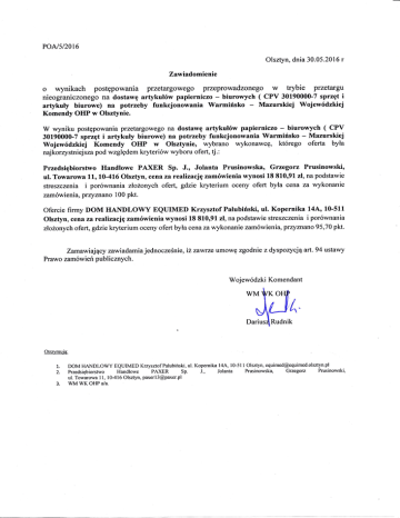 Wojewódzkiej Komendy OIIP w Olsztynieo wybrano wykonawcę, którego oferta była