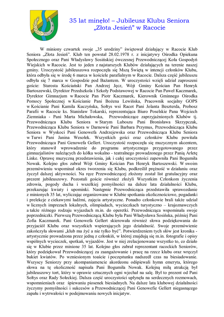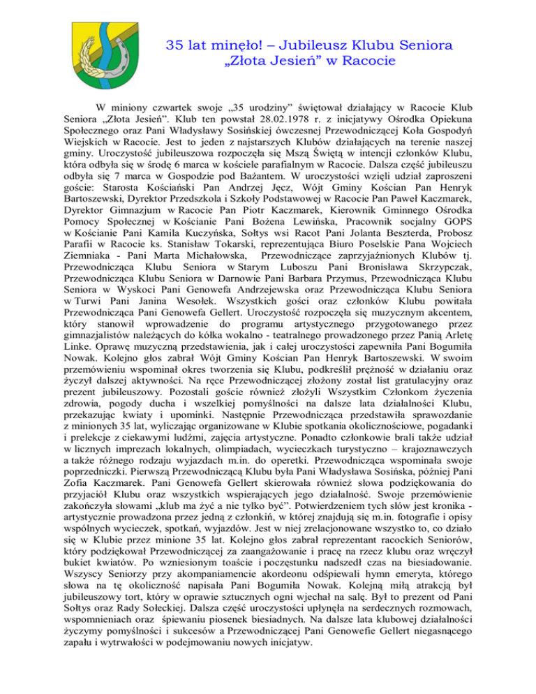 35 lat minęło! – Jubileusz Klubu Seniora „Złota Jesień” w Racocie W miniony czwartek swoje „35 urodziny” świętował działający w Racocie Klub Seniora „Złota Jesień”. Klub ten powstał 28.02.1978 r. z inicjatywy Ośrodka Opiekuna Społecznego oraz Pani Władysławy Sosińskiej ówczesnej Przewodniczącej Koła Gospodyń Wiejskich w Racocie. Jest to jeden z najstarszych Klubów działających na terenie naszej gminy. Uroczystość jubileuszowa rozpoczęła się Mszą Świętą w intencji członków Klubu, która odbyła się w środę 6 marca w kościele parafialnym w Racocie. Dalsza część jubileuszu odbyła się 7 marca w Gospodzie pod Bażantem. W uroczystości wzięli udział zaproszeni goście: Starosta Kościański Pan Andrzej Jęcz, Wójt Gminy Kościan Pan Henryk Bartoszewski, Dyrektor Przedszkola i Szkoły Podstawowej w Racocie Pan Paweł Kaczmarek, Dyrektor Gimnazjum w Racocie Pan Piotr Kaczmarek, Kierownik Gminnego Ośrodka Pomocy Społecznej w Kościanie Pani Bożena Lewińska, Pracownik socjalny GOPS w Kościanie Pani Kamila Kuczyńska, Sołtys wsi Racot Pani Jolanta Beszterda, Probosz Parafii w Racocie ks. Stanisław Tokarski, reprezentująca Biuro Poselskie Pana Wojciech Ziemniaka - Pani Marta Michałowska, Przewodniczące zaprzyjaźnionych Klubów tj. Przewodnicząca Klubu Seniora w Starym Luboszu Pani Bronisława Skrzypczak, Przewodnicząca Klubu Seniora w Darnowie Pani Barbara Przymus, Przewodnicząca Klubu Seniora w Wyskoci Pani Genowefa Andrzejewska oraz Przewodnicząca Klubu Seniora w Turwi Pani Janina Wesołek. Wszystkich gości oraz członków Klubu powitała Przewodnicząca Pani Genowefa Gellert. Uroczystość rozpoczęła się muzycznym akcentem, który stanowił wprowadzenie do programu artystycznego przygotowanego przez gimnazjalistów należących do kółka wokalno - teatralnego prowadzonego przez Panią Arletę Linke. Oprawę muzyczną przedstawienia, jak i całej uroczystości zapewniła Pani Bogumiła Nowak. Kolejno głos zabrał Wójt Gminy Kościan Pan Henryk Bartoszewski. W swoim przemówieniu wspominał okres tworzenia się Klubu, podkreślił prężność w działaniu oraz życzył dalszej aktywności. Na ręce Przewodniczącej złożony został list gratulacyjny oraz prezent jubileuszowy. Pozostali goście również złożyli Wszystkim Członkom życzenia zdrowia, pogody ducha i wszelkiej pomyślności na dalsze lata działalności Klubu, przekazując kwiaty i upominki. Następnie Przewodnicząca przedstawiła sprawozdanie z minionych 35 lat, wyliczając organizowane w Klubie spotkania okolicznościowe, pogadanki i prelekcje z ciekawymi ludźmi, zajęcia artystyczne. Ponadto członkowie brali także udział w licznych imprezach lokalnych, olimpiadach, wycieczkach turystyczno – krajoznawczych a także różnego rodzaju wyjazdach m.in. do operetki. Przewodnicząca wspominała swoje poprzedniczki. Pierwszą Przewodniczącą Klubu była Pani Władysława Sosińska, później Pani Zofia Kaczmarek. Pani Genowefa Gellert skierowała również słowa podziękowania do przyjaciół Klubu oraz wszystkich wspierających jego działalność. Swoje przemówienie zakończyła słowami „klub ma żyć a nie tylko być”. Potwierdzeniem tych słów jest kronika artystycznie prowadzona przez jedną z członkiń, w której znajdują się m.in. fotografie i opisy wspólnych wycieczek, spotkań, wyjazdów. Jest w niej zrelacjonowane wszystko to, co działo się w Klubie przez minione 35 lat. Kolejno głos zabrał reprezentant racockich Seniorów, który podziękował Przewodniczącej za zaangażowanie i pracę na rzecz klubu oraz wręczył bukiet kwiatów. Po wzniesionym toaście i poczęstunku nadszedł czas na biesiadowanie. Wszyscy Seniorzy przy akompaniamencie akordeonu odśpiewali hymn emeryta, którego słowa na tę okoliczność napisała Pani Bogumiła Nowak. Kolejną miłą atrakcją był jubileuszowy tort, który w oprawie sztucznych ogni wjechał na salę. Był to prezent od Pani Sołtys oraz Rady Sołeckiej. Dalsza część uroczystości upłynęła na serdecznych rozmowach, wspomnieniach oraz śpiewaniu piosenek biesiadnych. Na dalsze lata klubowej działalności życzymy pomyślności i sukcesów a Przewodniczącej Pani Genowefie Gellert niegasnącego zapału i wytrwałości w podejmowaniu nowych inicjatyw.