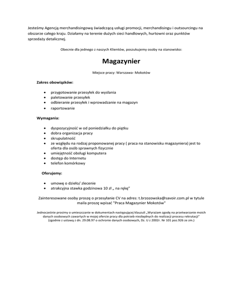 Jesteśmy Agencją merchandisingową świadczącą usługi promocji, merchandisingu i outsourcingu na obszarze całego kraju. Działamy na terenie dużych sieci handlowych, hurtowni oraz punktów sprzedaży detalicznej. Obecnie dla jednego z naszych Klientów, poszukujemy osoby na stanowisko: Magazynier Miejsce pracy: Warszawa- Mokotów Zakres obowiązków: przygotowanie przesyłek do wysłania paletowanie przesyłek odbieranie przesyłek i wprowadzanie na magazyn raportowanie Wymagania: dyspozycyjność w od poniedziałku do piątku dobra organizacja pracy skrupulatność ze względu na rodzaj proponowanej pracy ( praca na stanowisku magazyniera) jest to oferta dla osób sprawnych fizycznie umiejętność obsługi komputera dostęp do Internetu telefon komórkowy Oferujemy: umowę o dzieło/ zlecenie atrakcyjna stawka godzinowa 10 zł „ na rękę” Zainteresowane osoby proszę o przesyłanie CV na adres: [email protected] w tytule maila proszę wpisać "Praca Magazynier Mokotów" Jednocześnie prosimy o umieszczanie w dokumentach następującej klauzuli „Wyrażam zgodę na przetwarzanie moich danych osobowych zawartych w mojej ofercie pracy dla potrzeb niezbędnych do realizacji procesu rekrutacji” (zgodnie z ustawą z dn. 29.08.97 o ochronie danych osobowych, Dz. U z 2002r. Nr 101 poz.926 ze zm.)