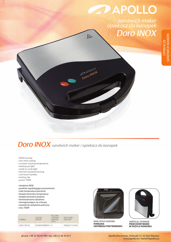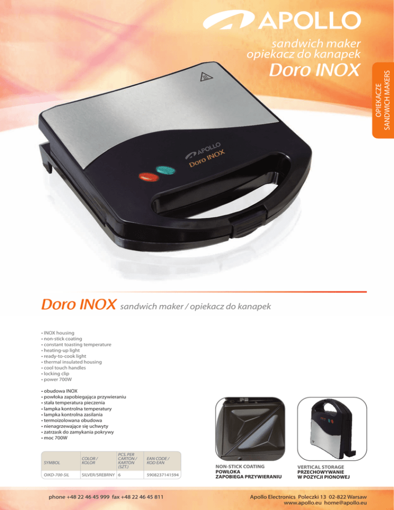 Doro INOX Doro INOX sandwich maker / opiekacz do kanapek • INOX housing • non-stick coating • constant toasting temperature • heating-up light • ready-to-cook light • thermal insulated housing • cool touch handles • locking clip • power 700W • obudowa INOX • powłoka zapobiegająca przywieraniu • stała temperatura pieczenia • lampka kontrolna temperatury • lampka kontrolna zasilania • termoizolowana obudowa • nienagrzewające się uchwyty • zatrzask do zamykania pokrywy • moc 700W PCS. PER CARTON / KARTON (SZT.) SYMBOL COLOR / KOLOR OIKD-700-SIL SILVER/SREBRNY 6 EAN CODE / KOD EAN 5908237141594 phone +48 22 46 45 999 fax +48 22 46 45 811 NON-STICK COATING POWŁOKA ZAPOBIEGA PRZYWIERANIU VERTICAL STORAGE PRZECHOWYWANIE W POZYCJI PIONOWEJ Apollo Electronics Poleczki 13 02-822 Warsaw www.apollo.eu [email protected] OPIEKACZE SANDWICH MAKERS sandwich maker opiekacz do kanapek