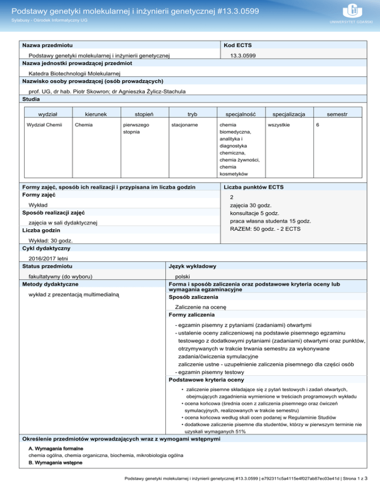Podstawy genetyki molekularnej i inżynierii genetycznej #13.3.0599 Sylabusy - Ośrodek Informatyczny UG Nazwa przedmiotu Kod ECTS Podstawy genetyki molekularnej i inżynierii genetycznej Nazwa jednostki prowadzącej przedmiot 13.3.0599 Katedra Biotechnologii Molekularnej Nazwisko osoby prowadzącej (osób prowadzących) prof. UG, dr hab. Piotr Skowron; dr Agnieszka Żylicz-Stachula Studia wydział Wydział Chemii kierunek Chemia stopień pierwszego stopnia tryb stacjonarne specjalność chemia biomedyczna, analityka i diagnostyka chemiczna, chemia żywności, chemia kosmetyków Formy zajęć, sposób ich realizacji i przypisana im liczba godzin Formy zajęć specjalizacja wszystkie semestr 6 Liczba punktów ECTS Wykład Sposób realizacji zajęć zajęcia w sali dydaktycznej Liczba godzin 2 zajęcia 30 godz. konsultacje 5 godz. praca własna studenta 15 godz. RAZEM: 50 godz. - 2 ECTS Wykład: 30 godz. Cykl dydaktyczny 2016/2017 letni Status przedmiotu fakultatywny (do wyboru) Metody dydaktyczne wykład z prezentacją multimedialną Język wykładowy polski Forma i sposób zaliczenia oraz podstawowe kryteria oceny lub wymagania egzaminacyjne Sposób zaliczenia Zaliczenie na ocenę Formy zaliczenia - egzamin pisemny z pytaniami (zadaniami) otwartymi - ustalenie oceny zaliczeniowej na podstawie pisemnego egzaminu testowego z dodatkowymi pytaniami (zadaniami) otwartymi oraz punktów, otrzymywanych w trakcie trwania semestru za wykonywane zadania/ćwiczenia symulacyjne zaliczenie ustne - uzupełnienie zaliczenia pisemnego dla części osób - egzamin pisemny testowy Podstawowe kryteria oceny • zaliczenie pisemne składające się z pytań testowych i zadań otwartych, obejmujących zagadnienia wymienione w treściach programowych wykładu • ocena końcowa (średnia ocen z zaliczenia pisemnego oraz ćwiczeń symulacyjnych, realizowanych w trakcie semestru) • ocena końcowa według skali ocen podanej w Regulaminie Studiów • dodatkowe zaliczenie pisemne dla studentów, którzy w pierwszym terminie nie uzyskali wymaganych 51% Określenie przedmiotów wprowadzających wraz z wymogami wstępnymi A. Wymagania formalne chemia ogólna, chemia organiczna, biochemia, mikrobiologia ogólna B. Wymagania wstępne Podstawy genetyki molekularnej i inżynierii genetycznej #13.3.0599 | e792311c5a4115e4f027ab87ec03e41d | Strona 1 z 3 Podstawy genetyki molekularnej i inżynierii genetycznej #13.3.0599 Sylabusy - Ośrodek Informatyczny UG posługiwanie się terminologią i nomenklaturą chemiczną i biologiczną, znajomość podstawowych funkcji oraz budowy komórki prokariotycznej i eukariotycznej, znajomość komórkowych procesów biochemicznych, Cele kształcenia 1. 2. 3. 4. 5. zapoznanie studentów z wszystkimi zagadnieniami wymienionymi w treściach programowych wykładu; zapoznanie studentów z podstawowymi właściwościami makromolekuł biologicznych: DNA, RNA i białek; zapoznanie studentów z wybranymi mechanizmami regulacji ekspresji genów; zapoznanie studentów z współczesnymi metodami, wykorzystywanymi w biotechnologii molekularnej oraz inżynierii genetycznej; zapoznanie studentów z przewidywanymi kierunkami rozwoju, możliwościami oraz zagrożeniami, stwarzanymi przez współczesną inżynierię genetyczną i biotechnologię molekularną Treści programowe Zagadnienia realizowane w ramach tego przedmiotu obejmują: właściwości nośników informacji genetycznej, kod genetyczny i przepływ informacji genetycznej, mutacje, interakcje białka regulatorowe-DNA, interakcje białka regulatorowe RNA, regulacja ekspresji genów, podstawowe narzędzia molekularne (wektory, polimerazy, ligazy, nukleazy oraz inne enzymy modyfikujące DNA), endonukleazy restrykcyjne i ich zastosowanie, techniki izolacji kwasów nukleinowych, procedury klonowania molekularnego, metody powielania DNA: PCR (definicja, wybrane modyfikacje i zastosowania), techniki sekwencjonowania kwasów nukleinowych, inżynieria genetyczna i biotechnologia molekularna (pojęcia, historia, osiągnięcia, perspektywy, zagrożenia), budowa i zastosowania białka GFP. Wykaz literatury A. Literatura wymagana do ostatecznego zaliczenia zajęć (zdania egzaminu): A.1. wykorzystywana podczas zajęć brak A.2. studiowana samodzielnie przez studentów 1. Węgleński, P.: Genetyka molekularna. Wydawnictwo naukowe PWN 2006 2. Brown, T.A.: Genomy. Wydawnictwo naukowe PWN 2009 B. Literatura uzupełniająca 1. Watson, J.D., Myers, R.M., Caudy, A.A., Witkowski, J.A.: Recombinant DNA. Genes and genomes – a short course. 2007. 2. Buckingham, M.L., Flaws, L.: Molecular diagnostics: Fundamentals, Methods and Clinical Applications. 2007 3. Glick, B.R., Pasternak, J.J., Patten, C.L.: Molecular biotechnology: Principles and applications of recombinant DNA. 2009 Efekty uczenia się Wiedza K_W02: opisuje właściwości pierwiastków i najważniejszych 1. rozumie i opisuje budowę DNA, RNA i białek, związków chemicznych, wymienia metody ich otrzymywania 2. rozumie i opisuje procesy replikacji, transkrypcji i translacji, oraz sposoby analizy; 3. opisuje wybrane mechanizmy regulacji ekspresji genów, K_W03: wyjaśnia zależności pomiędzy strukturą materii a 4. wymienia, charakteryzuje i rozumie metody stosowane w biotechnologii jej obserwowanymi właściwościami; molekularnej i inżynierii genetycznej, K_U01: identyfikuje, analizuje i rozwiązuje problemy z 5. wymienia i charakteryzuje podstawowe narzędzia molekularne, stosowane w zakresu szeroko pojętej chemii w oparciu o zdobytą wiedzę; inżynierii genetycznej. K_U08:przedstawia w sposób przystępny, językiem Sposoby weryfikacji przyswojenia wiedzy: naukowym typowym dla nauk chemicznych podstawowe Student stosuje poznane prawa i zależności teoretyczne podczas odpowiedzi na fakty z chemii; postawione pytania testowe i problemowe (K_W02). Student stosuje poznane prawa K_K01: identyfikuje poziom swojej wiedzy i umiejętności, i zależności teoretyczne podczas odpowiedzi na postawione pyt
