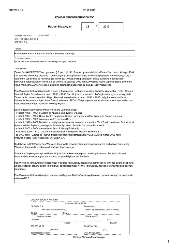 DREWEX S.A. RB 22 2010 KOMISJA NADZORU FINANSOWEGO Raport bieżący nr 22 / 2010 2010-06-18 Data sporządzenia: Skrócona nazwa emitenta DREWEX S.A. Temat Powołanie członka Rady Nadzorczej na kolejną kadencję. Podstawa prawna Art. 56 ust. 1 pkt 2 Ustawy o oferc ie - informacje bieżące i okresowe Treść raportu: Zarząd Spółki DREWEX S.A., zgodnie z § 5 ust. 1 pkt 22) Rozporządzenia Ministra Finansów z dnia 19 lutego 2009 r. w sprawie informacji bieżących i okresowych przekazywanych przez emitentów papierów wartościowych oraz warunków uznawania za równoważne informacji wymaganych przepisami prawa państwa niebędącego państwem członkowskim informuje, że w dniu 18 czerwca 2010 roku Zwyczajne Walne Zgromadzenie powołało Pana Wojciecha Jankowskiego na kolejną czteroletnią kadencję do składu Rady Nadzorczej. Pan Wojciech Jankowski posiada wyższe wykształcenie i jest absolwentem Wydziału Matematyki, Fizyki i Chemii, kierunek fizyka. Dodatkowo w latach 1993 – 1995 Pan Wojciech Jankowski ukończył studia wyższe na Wydziale Zarządzania Uniwersytetu Łódzkiego, kierunek zarządzanie, w latach 1993 – 1995 podyplomowe studia na Universite Jean Moulin Lyon III we Francji, w latach 1997 – 2000 podyplomowe studia na University of Wales and Manchester Business School w Wielkiej Brytanii. Doświadczenie zawodowe Pana Wojciecha Jankowskiego: - w latach 1988 – 1994 asystent na Akademii Medycznej w Łodzi, - w latach 1994 – 1997 Consultant, a następnie Senior Consultant w Arthur Andersen Polska Sp. z o.o., - w latach 1997 – 1999 Associate w A.T. Kearney Sp. z o.o., - w latach 1999 – 2002 Dyrektor, a następnie wiceprezes zarządu i wspólnik w York Trust Investment Partners Ltd (Leeds, Wielka Brytania), następnie Armada Sp. z o.o. i Armada Corporate Finance Sp. z o.o., - w latach 2002 – 2004 menadżer w Ernst & Young Polska Sp. z o.o., - w okresie 2004 – 31.01.2008 r. doradca prezesa zarządu w Prokom Software S.A., - od 2007 roku – Zastępca Przewodniczącego Rady Nadzorczej DREWEX S.A., a od marca 2009 roku Przewodniczący Rady Nadzorczej DREWEX S.A. Dodatkowo od 2002 roku Pan Wojciech Jankowski prowadzi działalność gospodarcza pod nazwą Consulting Wojciech Jankowski w zakresie doradztwa finansowego. Działalność wykonywana przez Pana Wojciecha Jankowskiego poza przedsiębiorstwem Emitenta nie jest działalnością konkurencyjną w stosunku do przedsiębiorstwa Emitenta. Pan Wojciech Jankowski nie uczestniczy w spółce konkurencyjnej jako wspólnik spółki cywilnej, spółki osobowej lub jako członek organu spółki kapitałowej bądź uczestniczy w innej konkurencyjnej osobie prawnej jako członek jej organu. Pan Wojciech Jankowski nie jest wpisany do Rejestru Dłużników Niewypłacalnych, prowadzonego na podstawie ustawy o KRS. DREWEX SPÓŁKA AKCYJNA (peł na nazwa emitenta) DREWEX S.A. Drzewny (drz) (skrócona nazwa emitenta) 30-383 (sektor wg. klasyfikac ji GPW w W-wie) Kraków (kod pocztowy) (miejsc owość) Obozowa 42A/2 (ulic a) 033 087 47 80 (numer) 033 873 47 83 (tel efon) [email protected] om (fax) www.drewex.com Komisja Nadzoru Finansowego 1 DREWEX S.A. RB 22 2010 (e-mail) (www) 6792904110 120307910 (NIP) (REGON) PODPISY OSÓB REPREZENTUJĄCYCH SPÓŁKĘ Data Imię i Nazwisko Stanowisko/Funkcja 2010-06-18 Jacek Szczur Wic eprezes Zarządu Podpis Komisja Nadzoru Finansowego 2